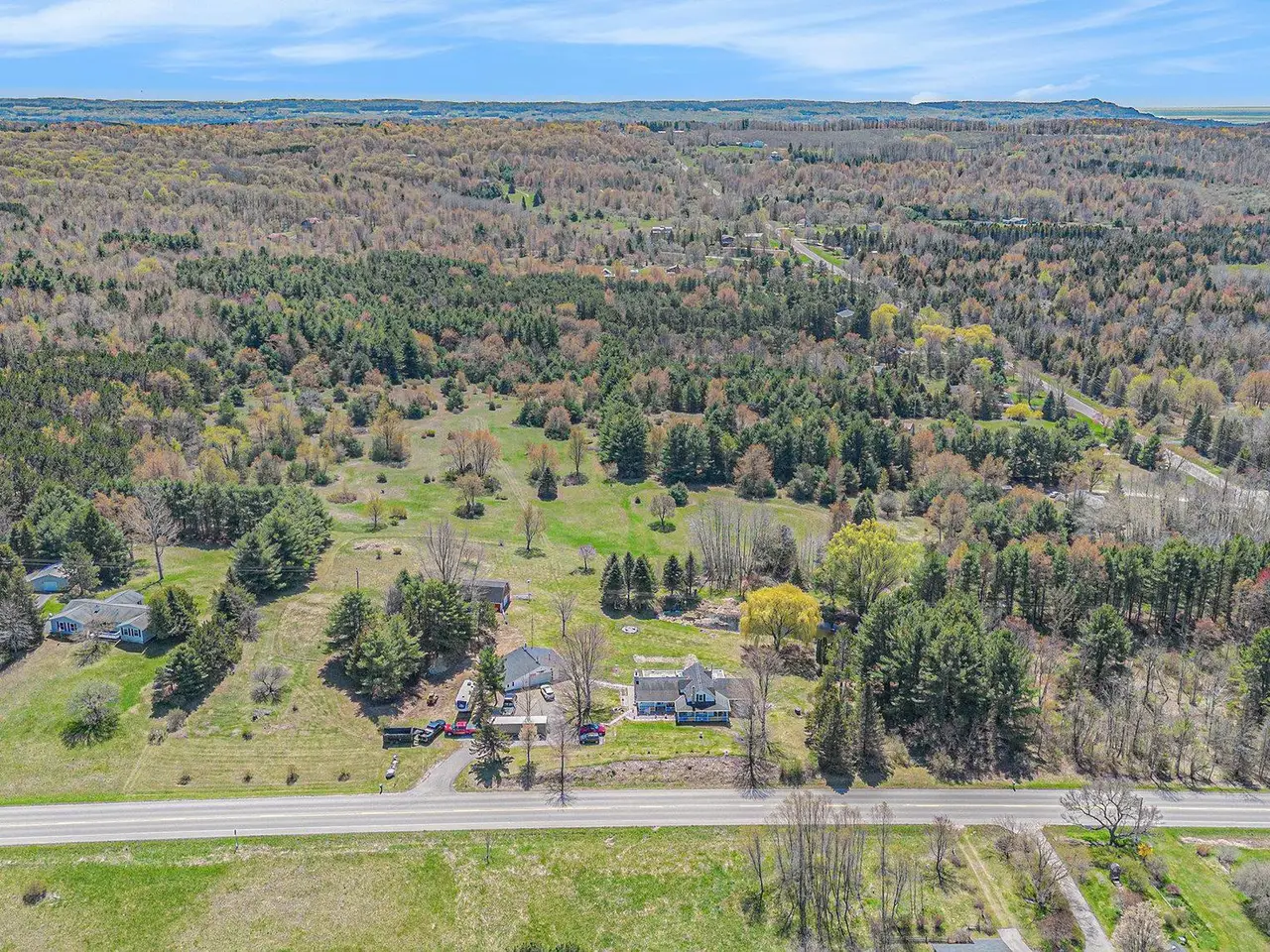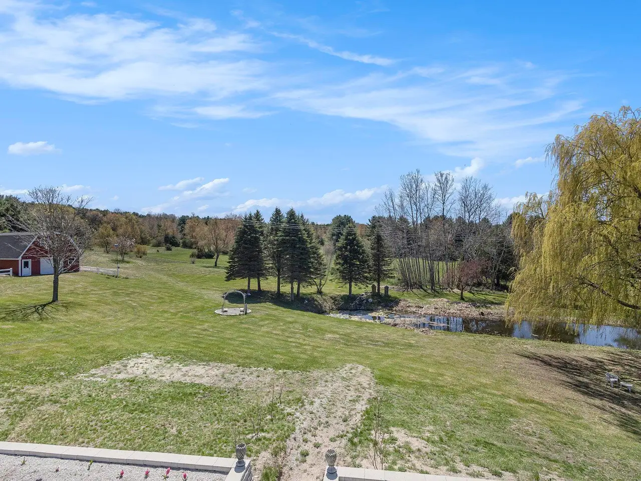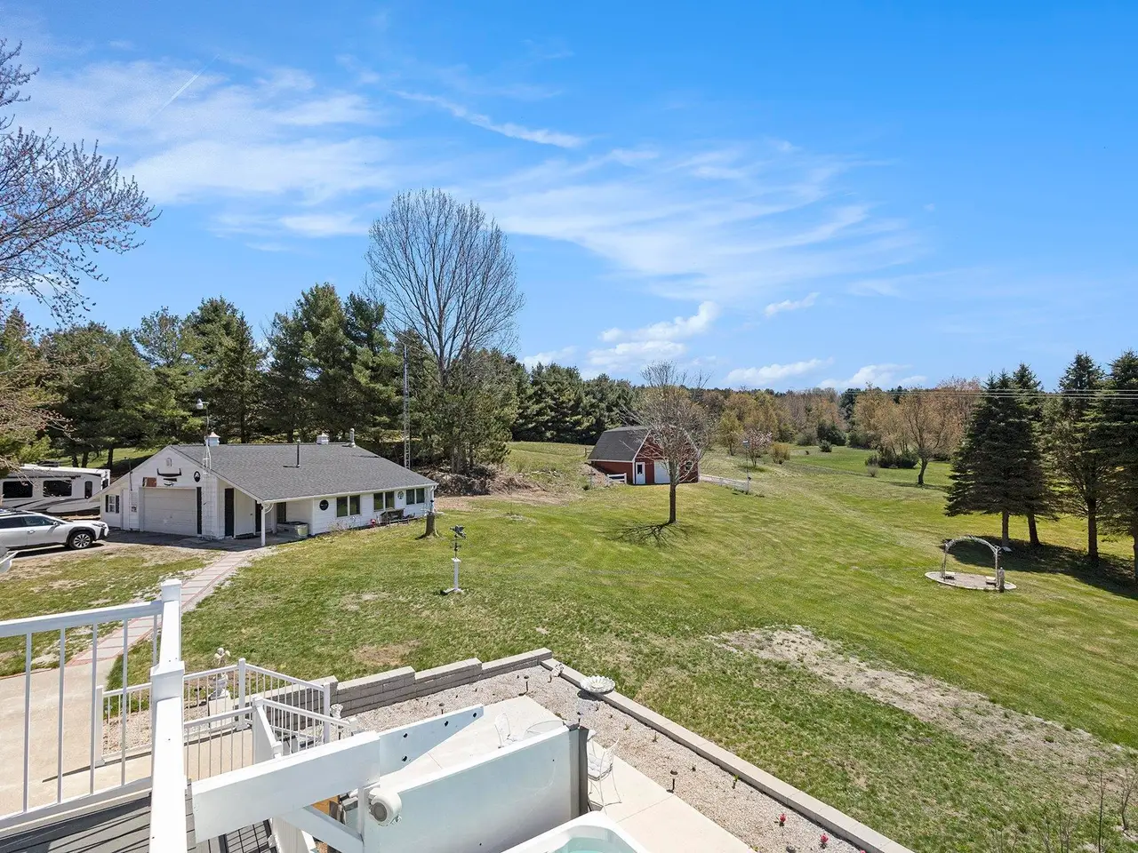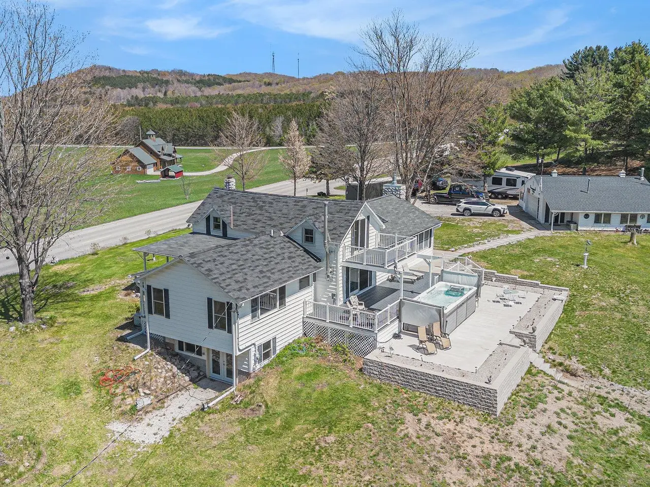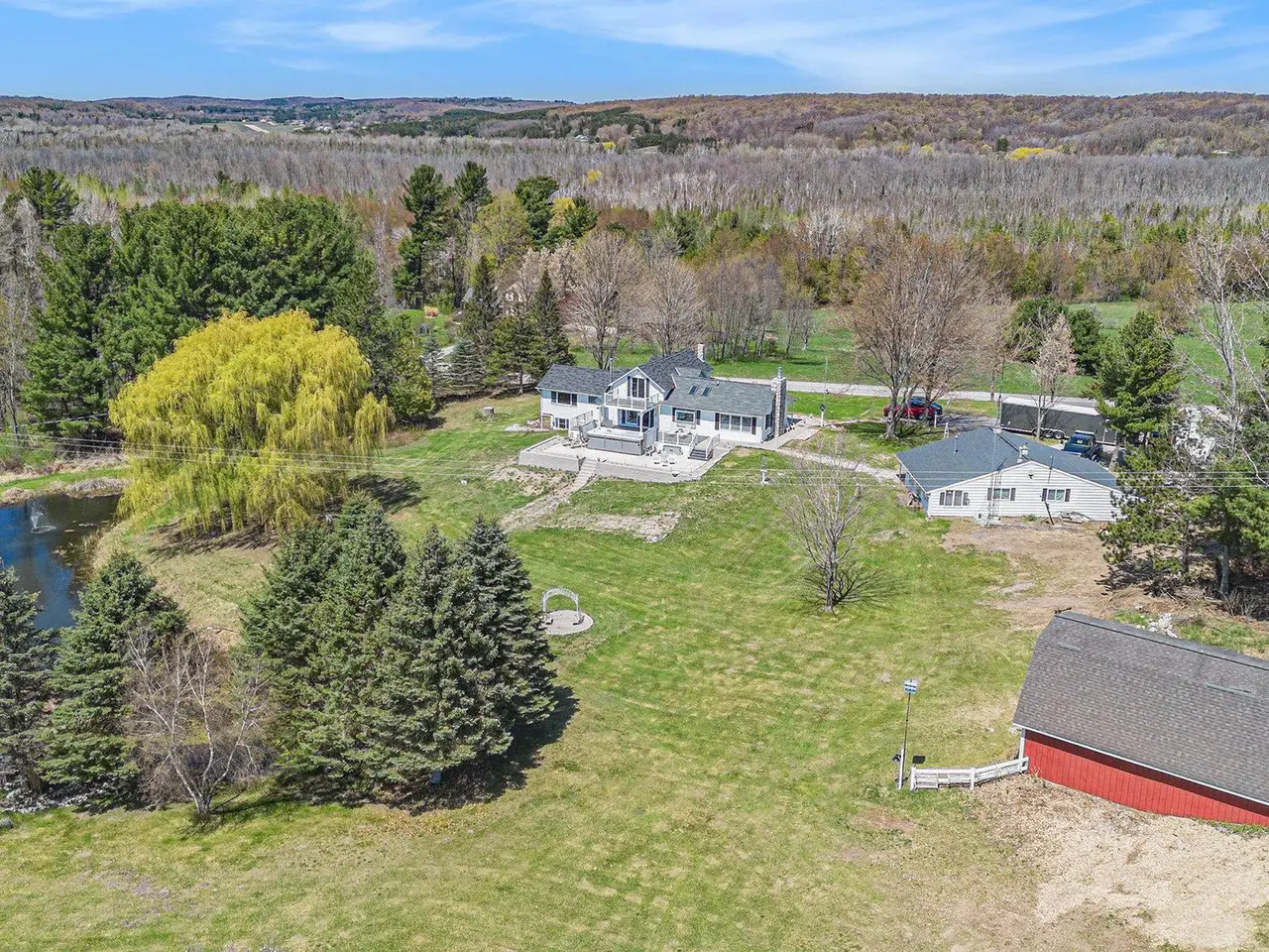 This remarkable home and property offers stunning and peaceful views that can truly be appreciated during a visit. Nestled on 25 beautiful acres of rolling woodlands, white pine groves, and open areas perfect for farming and gardening, this property also includes a shooting range and hunting blinds. The residence features nearly 2,300 square feet of remodeled living space, including an updated kitchen with elegant cabinets and quartz countertops. The bathrooms have been renovated, and hardwood floors enhance the interior. The living room has a newer gas fireplace, and the family room includes a high-efficiency wood-burning stove. A lovely 12 x 40-foot Trex deck overlooks the grounds, complemented by a second-floor balcony and charming brick-paver retaining walls, as well as a swim/spa pool. The patio is a generous size, designed with a durable concrete slab, and there is a whole-house generator. The master bedroom includes an en-suite with a walk-in bathtub. A spacious garage of about 1,000 square feet has electricity and natural gas heating. The pole barn features a concrete floor and has an upper-level loft with a private entry, providing versatile usage options. The grounds are diverse, featuring raspberry bushes, wild asparagus, mushrooms, and many apple trees. With ample land available, this property has great potential for future development or could serve as a family compound or campsite. It includes a serene pond and is serviced by a second well. The best way to fully appreciate all the impressive features is to visit in person, so please take the time to explore this exceptional property. Additionally, just 2.5 miles away is Grace Road Beach on Lake Michigan, enhancing the appeal of this location.