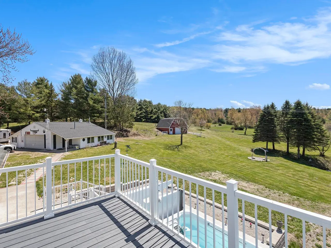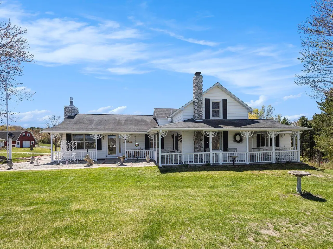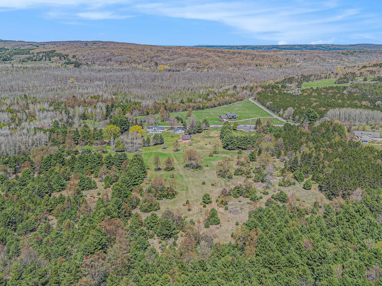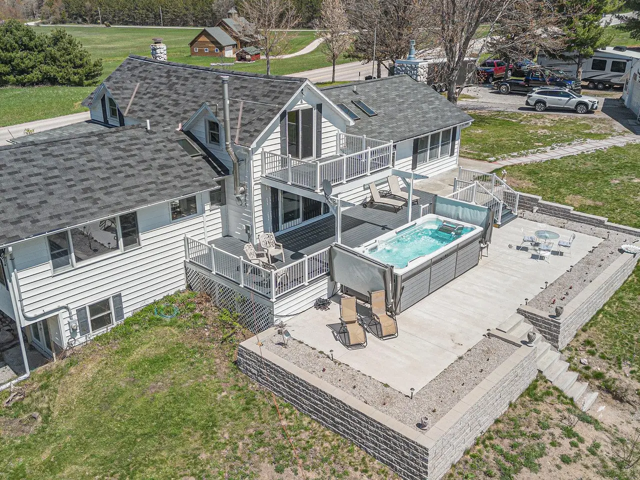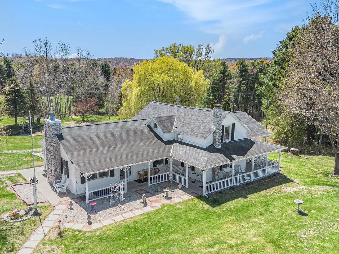 This remarkable home and property offers stunning and peaceful views that can truly be appreciated during a visit. Nestled on 25 beautiful acres of rolling woodlands, white pine groves, and open areas perfect for farming and gardening, this property also includes a shooting range and hunting blinds. The residence features nearly 2,300 square feet of remodeled living space, including an updated kitchen with elegant cabinets and quartz countertops. The bathrooms have been renovated, and hardwood floors enhance the interior. The living room has a newer gas fireplace, and the family room includes a high-efficiency wood-burning stove. A lovely 12 x 40-foot Trex deck overlooks the grounds, complemented by a second-floor balcony and charming brick-paver retaining walls, as well as a swim/spa pool. The patio is a generous size, designed with a durable concrete slab, and there is a whole-house generator. The master bedroom includes an en-suite with a walk-in bathtub. A spacious garage of about 1,000 square feet has electricity and natural gas heating. The pole barn features a concrete floor and has an upper-level loft with a private entry, providing versatile usage options. The grounds are diverse, featuring raspberry bushes, wild asparagus, mushrooms, and many apple trees. With ample land available, this property has great potential for future development or could serve as a family compound or campsite. It includes a serene pond and is serviced by a second well. The best way to fully appreciate all the impressive features is to visit in person, so please take the time to explore this exceptional property. Additionally, just 2.5 miles away is Grace Road Beach on Lake Michigan, enhancing the appeal of this location.