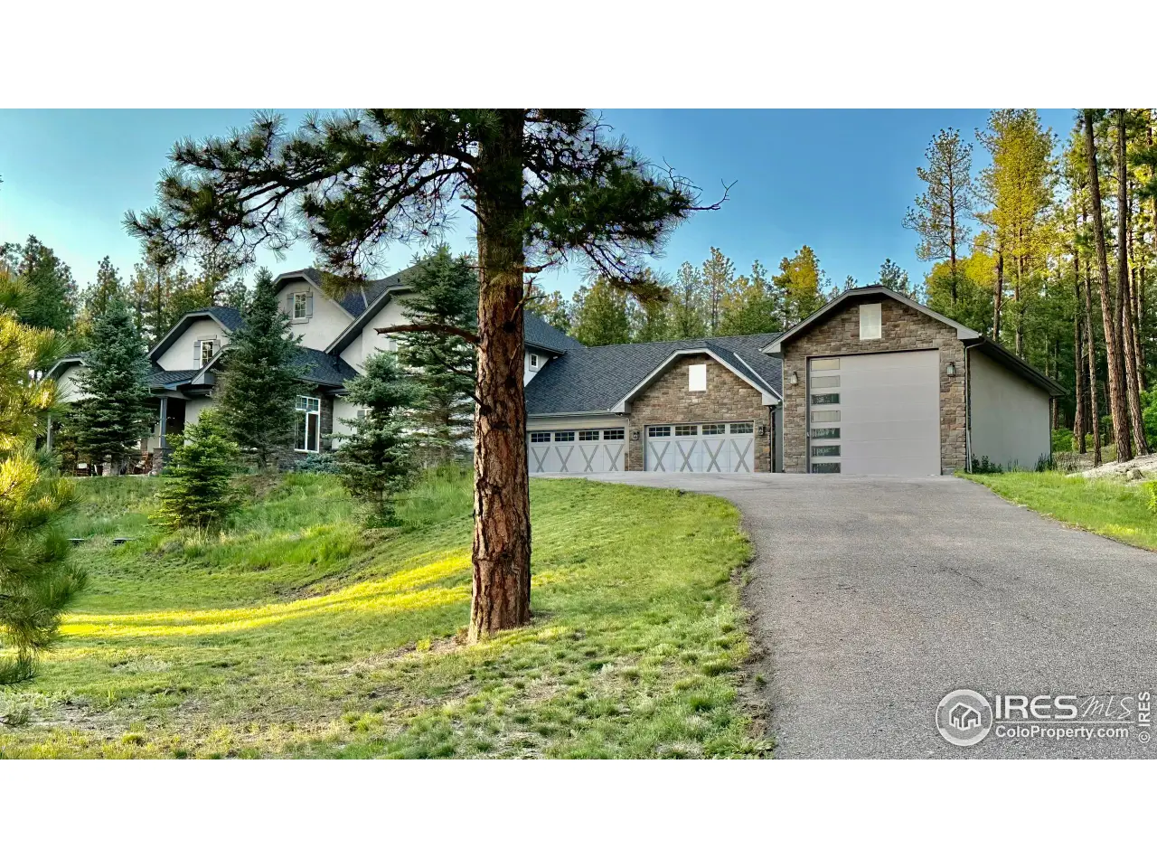 Experience Colorado living at its finest in this stunningly reimagined mountain-modern gem. This indoor-outdoor haven is tucked away on 3 private, wooded acres within the gated Deerfield Preserve. It's surrounded by towering pines, open space, & ample wildlife, including deer, wild turkeys, and serene tranquility. Yet, with swift access to I-25, Castle Rock, & southern Denver, you'll enjoy rural bliss without losing convenience. Step into a world of refined style where every detail caters to modern comforts. The main-floor primary suite is a haven, featuring a fireside sitting nook, a luxurious freestanding tub, a dual-head shower, sleek quartz finishes, & a spacious walk-in closet seamlessly connected to the laundry. Three generously appointed bedrooms with en-suite baths & a versatile loft complement each other. Hand-troweled walls add charm, while three HVAC zones ensure year-round comfort. The gourmet kitchen, a culinary dream, features quartz countertops, a marble backsplash, soft-close cabinetry, illuminated glass shelving, & a walk-in pantry. Dual laundry rooms simplify daily tasks, & a custom Morningstar elevator provides connectivity throughout all levels. A new roof, installed in 2024, adding peace of mind. The vast 3,000-sq-ft finished basement, with soaring 10-ft ceilings, offers endless possibilities: a fifth bedroom with en-suite bath, a built-in bunk room, & ample space for a home theater, gym, or game room. Outside, a covered patio opens to a strikingly landscaped, irrigated yard, where Colorado's lively seasons unfold. Storage & utility are unmatched, with a heated four-car attached garage & a separate heated 50' deep RV garage/outbuilding-complete with 50-amp service-ideal for adventure gear or hobbies. Move-in ready & exceptionally rare, this 3-acre estate blends unparalleled artistry, luxurious upgrades, & natural splendor. Seize the opportunity to claim this serene retreat, just moments from Castle Rock's premier dining, shopping, golf, & parks.