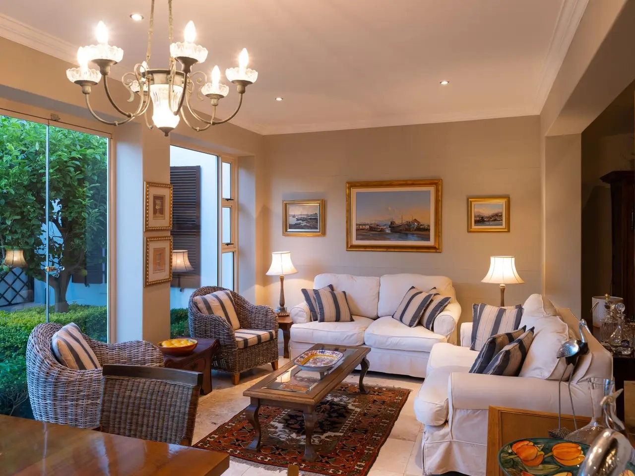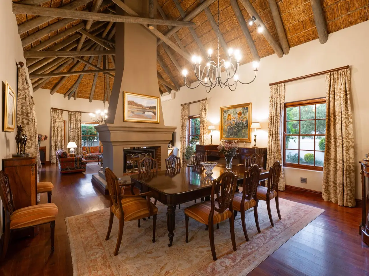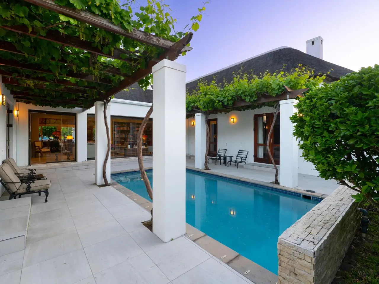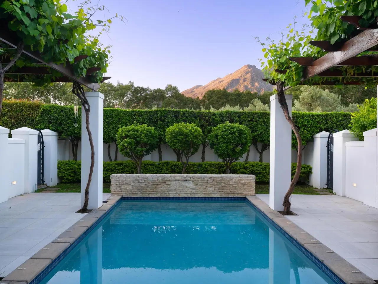 Opulent Country Living in La Ferme Chantelle, Franschhoek A property in this prestigious estate rarely comes to market. Nestled among vineyards and framed by Franschhoek's dramatic mountain backdrop, this remarkable home combines Cape Dutch character with timeless elegance and luxurious detail. This 4-bedroom masterpiece welcomes you through a glass-front door into a gracious reception area that opens to light-filled living spaces. The open-plan kitchen and scullery flow seamlessly into a voluminous central lounge with exposed thatch trusses and grand chandeliers - a true statement of space and warmth. To the left, a dining area with an adjoining lounge opens through glass stacking doors, drawing in magnificent views of the vineyards and mountains. To the right, a formal study with its own lounge area overlooks the sun-splashed northern pool courtyard - an ideal balance between work and leisure. A feature double-sided fireplace connects the formal lounge and dining room, setting the tone for elegant entertaining and cozy evenings. Throughout, the home's natural stone and wooden floors create a seamless blend of sophistication and homeliness. The main suite is a sanctuary of luxury - a spacious bedroom with private lounge and fireplace, doors leading directly to the pool terrace, a generous walk-in closet, and a beautifully appointed bathroom. The freestanding bathtub is the showpiece, complemented by both an indoor shower and a remarkable outdoor shower set against forest-inspired illuminated art, evoking a serene spa-like atmosphere. Two guest bedrooms are located downstairs - one featuring a full en-suite bathroom, and the second with its own fully equipped private bathroom conveniently situated next door. Upstairs, a third guest suite offers complete privacy with an en-suite bathroom and two balconies capturing sweeping vineyard and mountain views. Additional Features French-style wine cellar built into the staircase Upstairs formal lounge with fireplace and large built-in study area Skylights bringing in natural light and framing mountain vistas Private terraces and patios for relaxation and sunset views Separate laundry / staff room Double garage with two single garage doors Landscaped gardens and pristine pool area La Ferme Chantelle is one of FranschhoekGÇÖs most sought-after addresses GÇö a secure, private estate surrounded by tranquil vineyards and dramatic mountain views. Homes in this enclave seldom become available, making this an exceptional opportunity to own a timeless property in the heart of the valley. Call us for an exclusive viewing