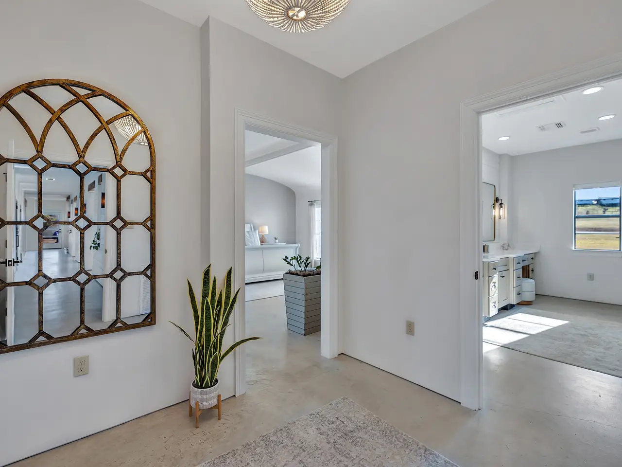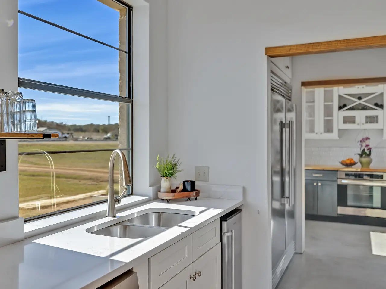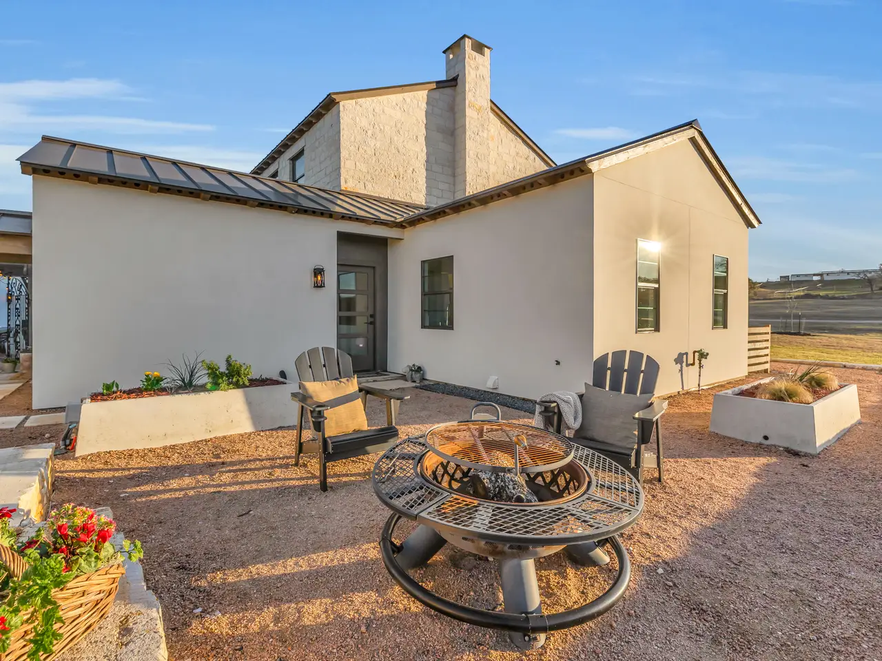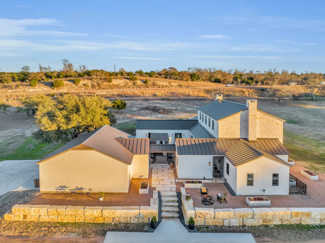 Experience serene luxury in a modern farmhouse nestled in the picturesque Texas Hill Country. The property is ideally located near the charming towns of Fredericksburg, Comfort, and Kerrville. Upon entering the property, an expansive limestone pathway leads to the entrance. The inviting courtyard adorned with a vine-covered pergola and twinkling lights provides a delightful spot to relax. The two-story home has been thoughtfully designed to blend functionality and luxury seamlessly. The first level features elegant hallways that guide you through the various rooms. The entire first level has heated flooring and recessed lighting with evening mood settings. The chef-ready kitchen is an excellent space for culinary enthusiasts, with multiple workstations, three sinks, high-end appliances, a butler's pantry, and quartz and woodblock countertops. The kitchen is perfectly set up for hosting events with separate stations for kitchen tasks, ample storage, and an 11-foot-long island that can accommodate up to five guests. The open floor plan leads to the dining area and living space, where large, rugged beams span the ceiling. The brick accent wall and wood-burning fireplace ground the light-filled room. Large solid steel entry doors line the exterior on each side of the home, providing easy access to the surrounding yard. The entire home is filled with natural light, and during the late afternoon, the main living area is transformed into a warm and serene space as the setting sun beams bounce off the floors, illuminating the space. The east wing of the home leads to the primary suite and office space. The elliptical arched ceilings with evening mood lighting provide an exceptional peaceful retreat. The en suite bath features a dual vanity, a freestanding porcelain tub, and a walk-in shower with a heated stone bench. The primary suite's dressing room boasts built-in shelving, a center console with storage, and a tri-fold mirror. The spacious and secluded office offers privacy and a reflective workspace. The second level features three spacious bedrooms, two full bathrooms, and a family room. The wood floors on the second level complement the abundance of natural light that fills the entire home. The property's detached oversized garage provides ample space for two cars, a golf cart/ATV, and extra storage. The barn, measuring 36x30 feet, is currently set up as a horse barn but can be restructured as a storage barn, among other options. Restful country living can be experienced at this tranquil, private home.