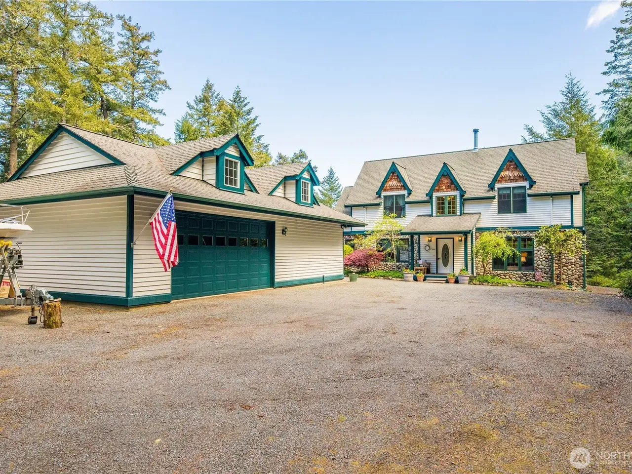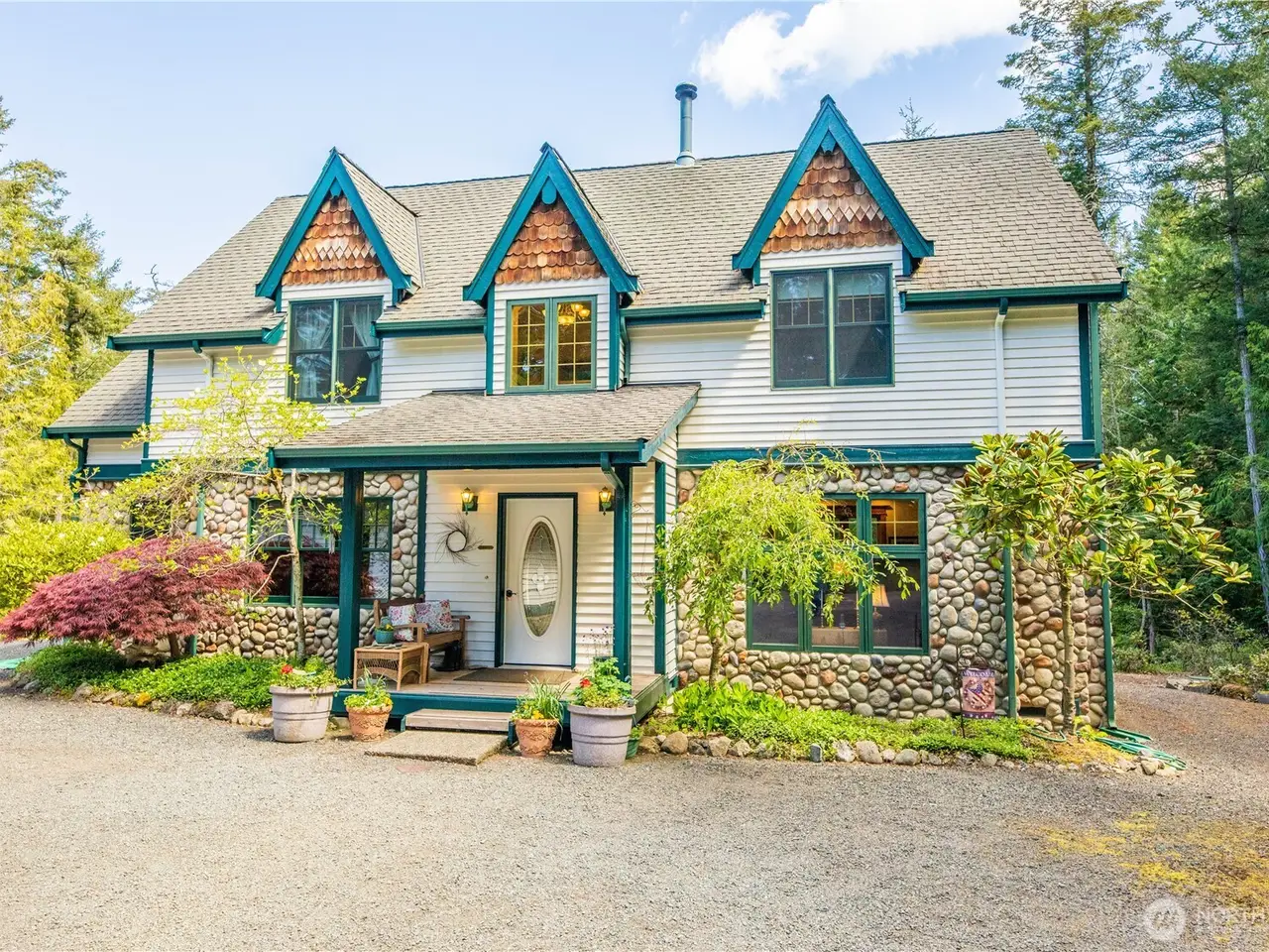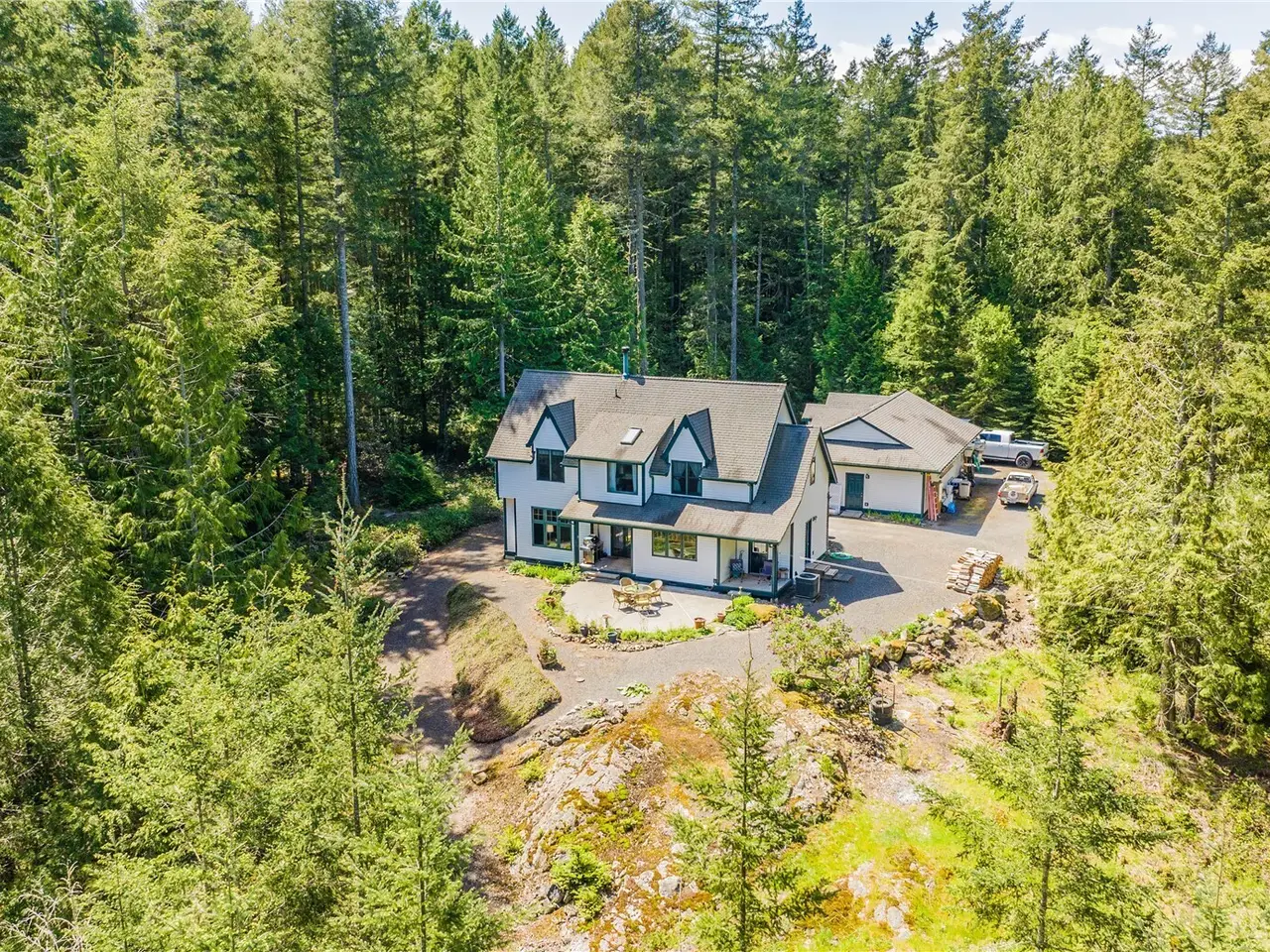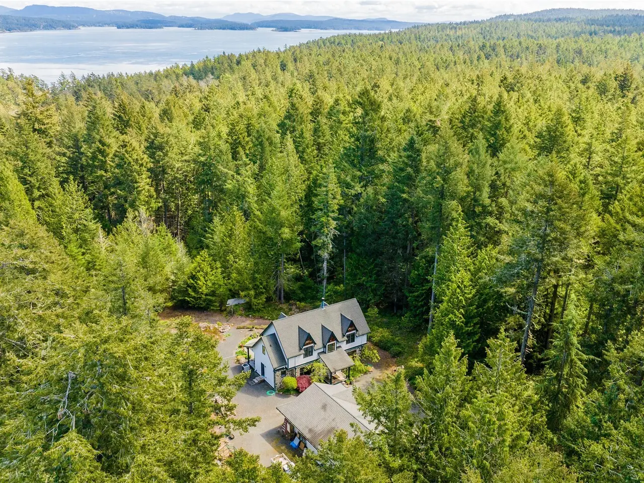 Impeccably maintained cottage nestled in the heart of San Juan Island! Peaceful, private haven on 5+ wooded acres. Welcoming living area boasts a wood burning fire w/river rock surround, vaulted ceilings w/box beams & oversized windows- lots of natural light. Open kitchen offers plentiful cabinet space, corian counters & adjoining large dining space, all w/ box beams+ tongue & groove ceiling. Powder rm & mud rm on main. Upstairs, find an oversized primary suite, vaulted ceilings, ensuite bath w/jetted tub & shower. 2 add'l generous bedrooms. Custom woodwork & millwork details throughout! 960 SF detached shop w/200 amp service. Large patio w/room to enjoy outdoors. Show stopping perennial garden surrounds the home. A rare island gem!