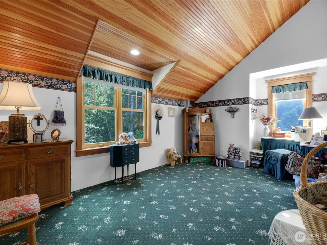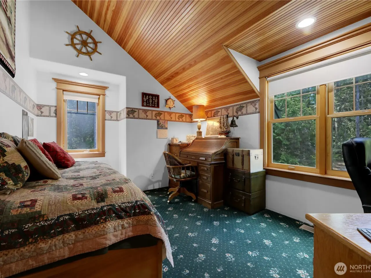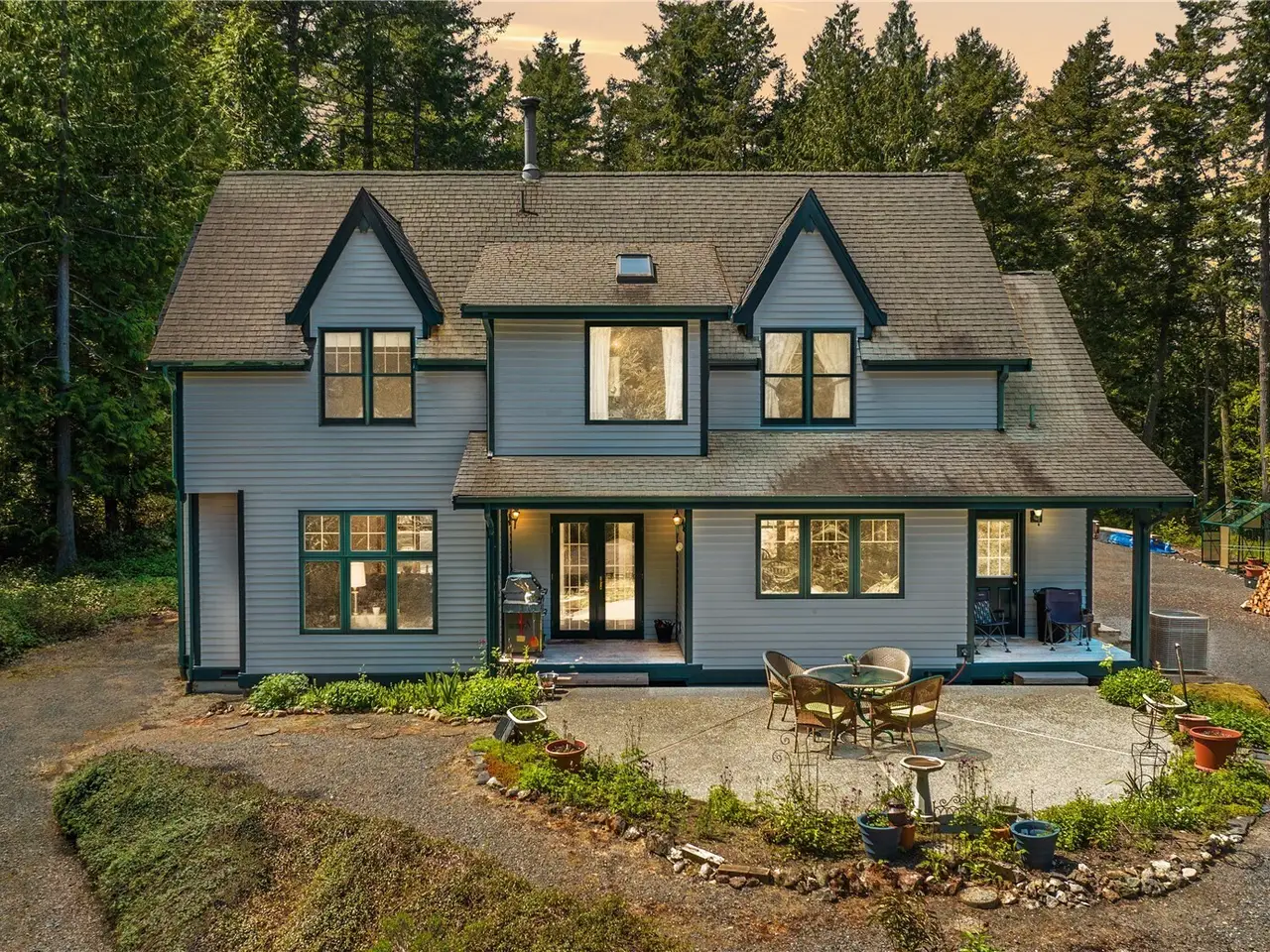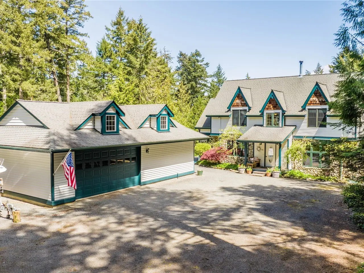 Impeccably maintained cottage nestled in the heart of San Juan Island! Peaceful, private haven on 5+ wooded acres. Welcoming living area boasts a wood burning fire w/river rock surround, vaulted ceilings w/box beams & oversized windows- lots of natural light. Open kitchen offers plentiful cabinet space, corian counters & adjoining large dining space, all w/ box beams+ tongue & groove ceiling. Powder rm & mud rm on main. Upstairs, find an oversized primary suite, vaulted ceilings, ensuite bath w/jetted tub & shower. 2 add'l generous bedrooms. Custom woodwork & millwork details throughout! 960 SF detached shop w/200 amp service. Large patio w/room to enjoy outdoors. Show stopping perennial garden surrounds the home. A rare island gem!