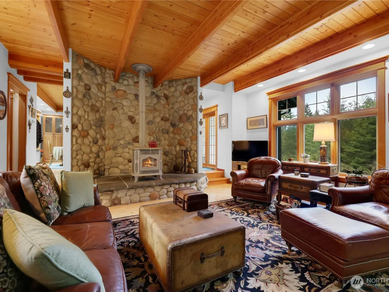 River rock wood burning fireplace