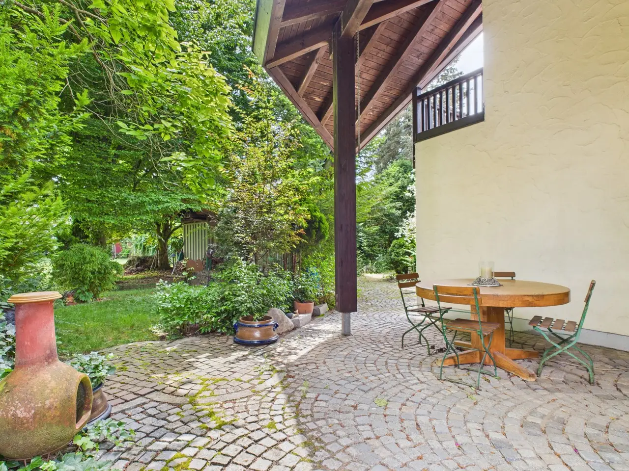 This high-quality detached house impresses with its spacious layout, classic country house architecture and versatile usage options - ideal for discerning buyers looking for an elegant yet future-proof home. The entrance area opens onto a clearly structured floor plan with flowing transitions between the living areas. Generous window areas create bright, light-flooded rooms and create a harmonious connection to the spacious outdoor area. A fireplace in the living area sets an architectural accent and provides additional comfort on cooler days. On the upper floor, there are three rooms that can be used flexibly - ideal as bedrooms, children's rooms or workspaces. One of the rooms is equipped with an integrated dressing area. A well-kept daylight bathroom and three balconies with different orientations underline the high-quality living situation. A special feature of the house is the separate granny apartment with its own entrance. It is ideal for guests, adult family members, au pairs, care workers or for commercial use - and offers a high degree of privacy and flexibility. The spacious plot opens up a wide range of design options - whether as a high-quality landscaped garden, a family-friendly play area or a quiet retreat. Due to its size, there is also potential for dividing the plot or building on it, which makes the property particularly interesting for investors or families with expansion plans. In terms of design, this property offers numerous prospects: whether stylish modernization or further development in keeping with the existing country house style - it offers a solid architectural basis for individual concepts. A spacious double garage rounds off the offer and provides comfortable space for vehicles, bicycles and other possible uses.