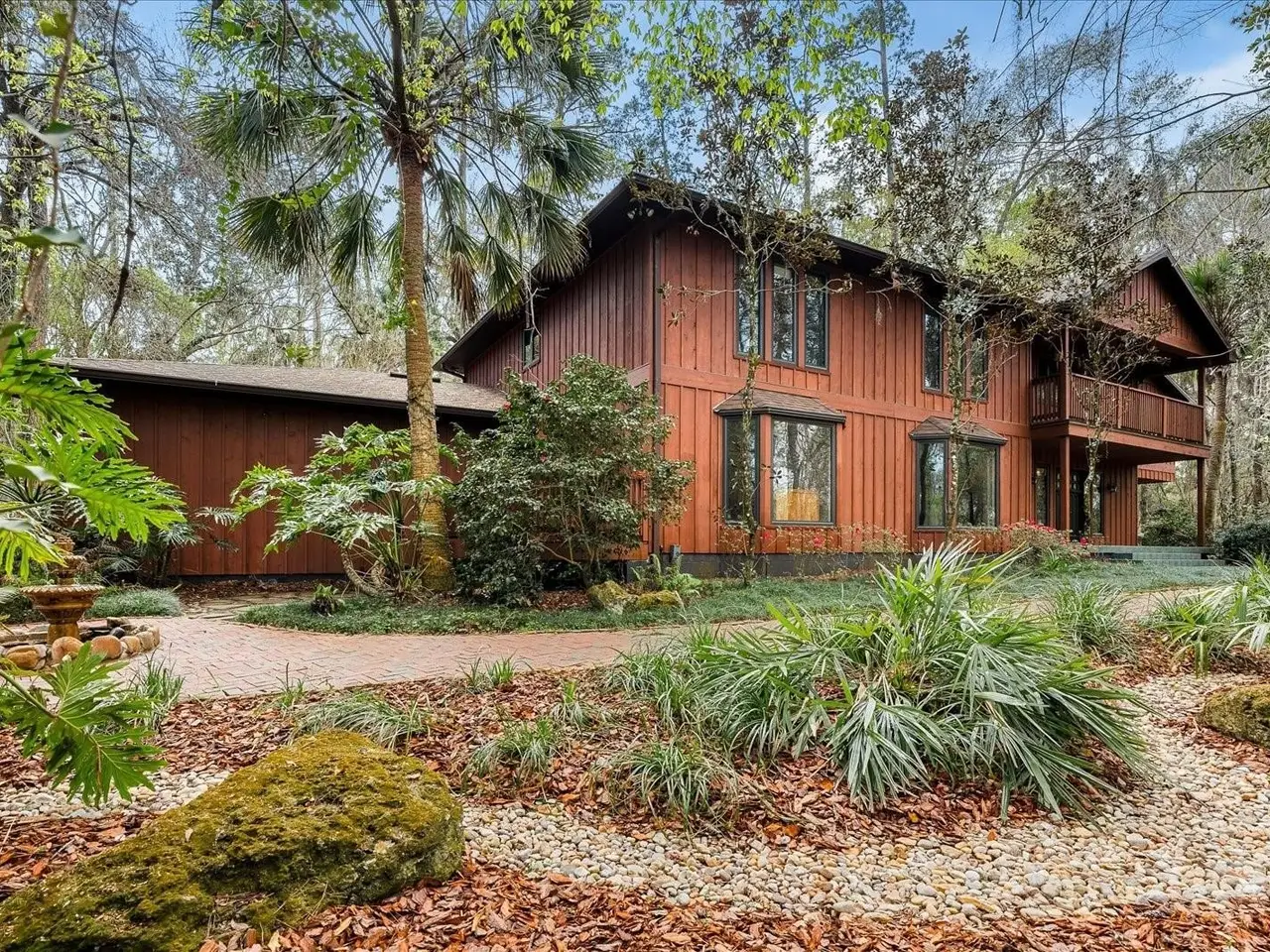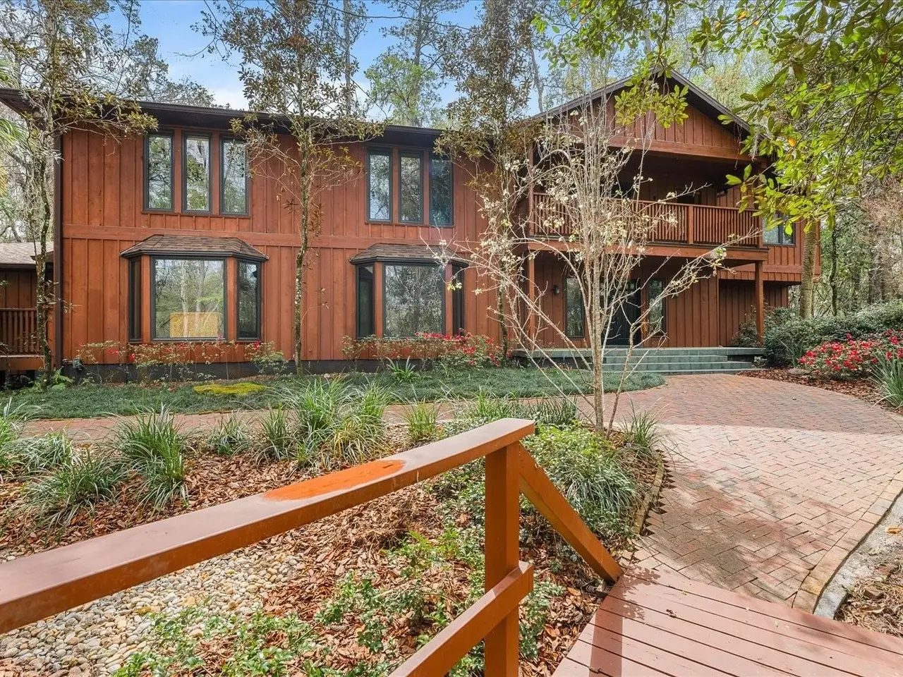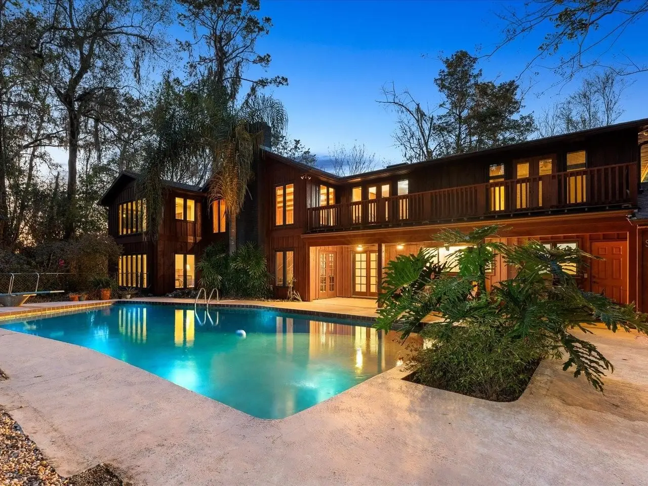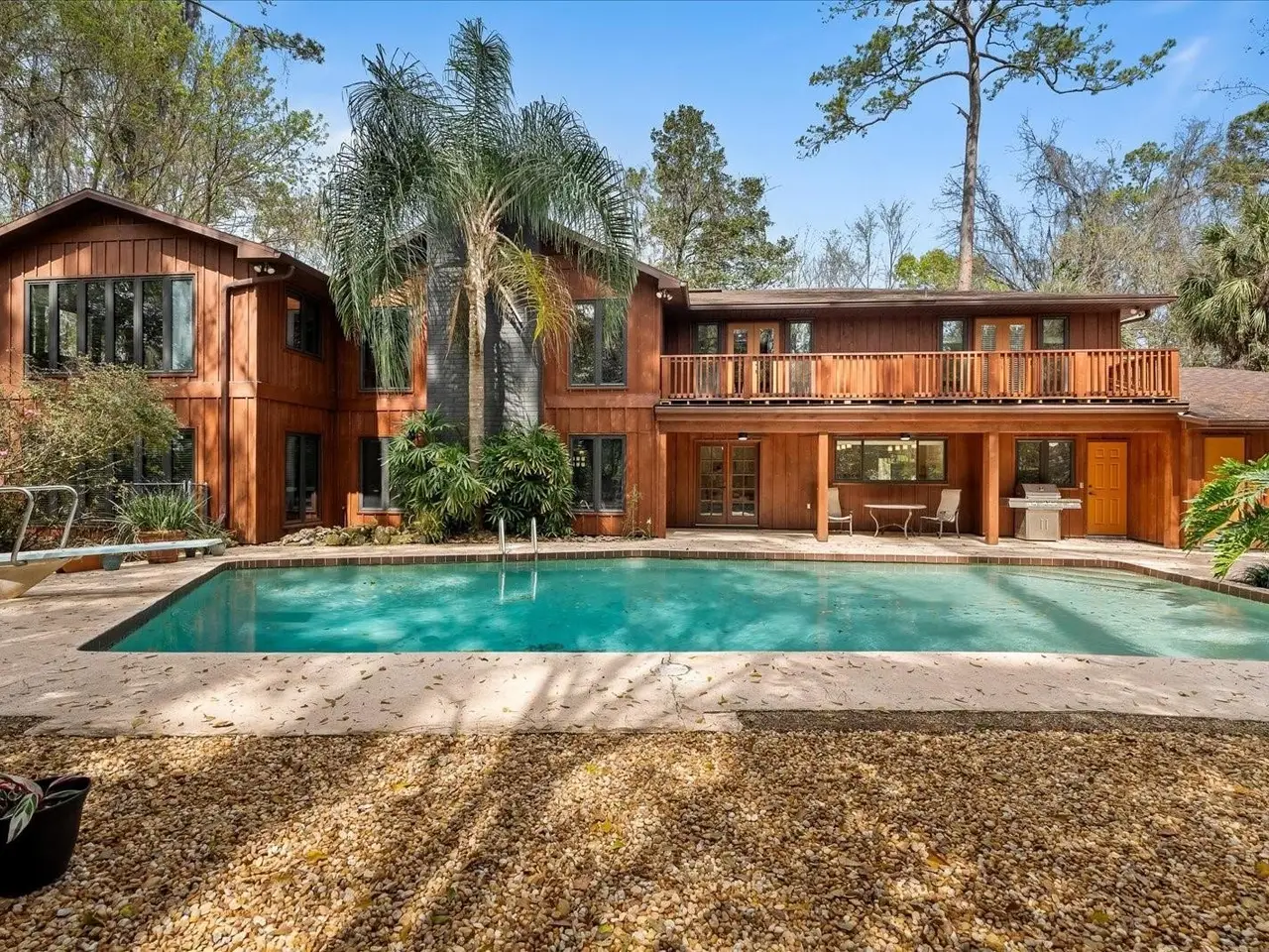 Nestled in Shands Woods, one of Gainesville’s best-kept secrets, this custom-built John Van Mills home sits on over 2.5 acres, seamlessly blending privacy, nature, and convenience—all less than a mile from the University of Florida. Overlooking Hogtown Creek on a secluded lot, this home is a true retreat. Inside, the breathtaking two-story family room features soaring cedar batten and board walls, evoking the warmth of a mountain lodge. A wood-burning Spade stone fireplace serves as the heart of the space, perfect for cozy gatherings or quiet relaxation. The first floor also boasts a formal living room with bay windows overlooking Hogtown Creek, a formal dining room with built-in cabinetry and picturesque outdoor views, a spacious kitchen, and the primary suite. The kitchen includes a double oven, cooktop, center island, and a generous eat-in dining area that opens through French doors to the pool. The first-floor primary suite is a peaceful retreat with views of the wooded yard and pool. Its spa-like bathroom features a soaking tub, walk-in shower, split vanities, and a unique terrarium that brings nature indoors. Upstairs, you'll find five spacious bedrooms, a large office, and a dedicated game room. Two bedrooms have private en suite baths, while the remaining three share a well-sized bath with dual vanities and a shower/jetted tub. One bedroom and the game room open onto a private deck overlooking the pool, while the others enjoy scenic views of the creek and preserve. A spiral staircase from the game room leads to the laundry room. The game room also offers versatility, serving as a potential seventh bedroom, playroom, hobby space, or quiet retreat. Outside, your private oasis awaits—a 30,000-gallon pool surrounded by lush landscaping and total seclusion. A staircase leads to Hogtown Creek, where protected wetlands ensure lifelong privacy—you’ll never have front-door neighbors. This home has been meticulously maintained and thoughtfully updated, featuring new flooring, fresh interior and exterior paint, a new roof (2024), and water heaters (2022). Completely move-in ready, it offers both timeless charm and modern upgrades. Located in the sought-after, no-HOA enclave of Shands Woods, this home offers the best of both worlds—a serene, natural setting just minutes from UF, downtown, Shands, and the VA. Experience the beauty, tranquility, and uniqueness of this exceptional home. Schedule your showing today!