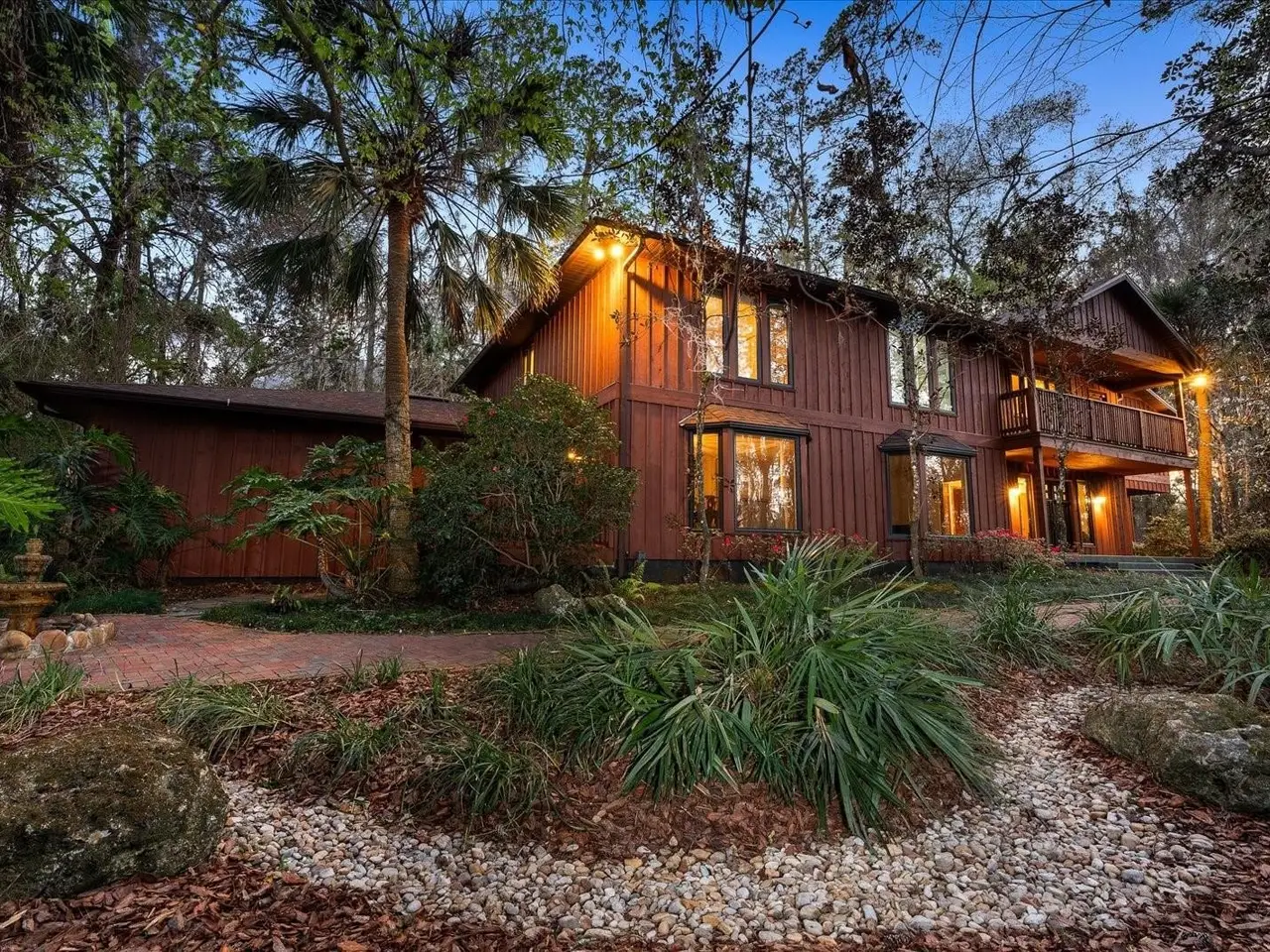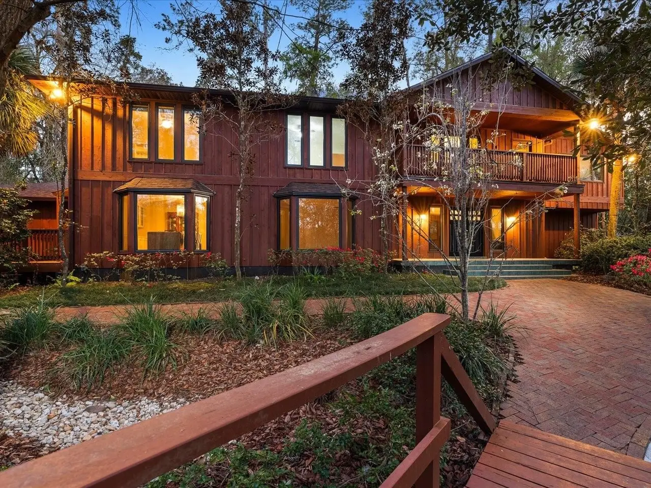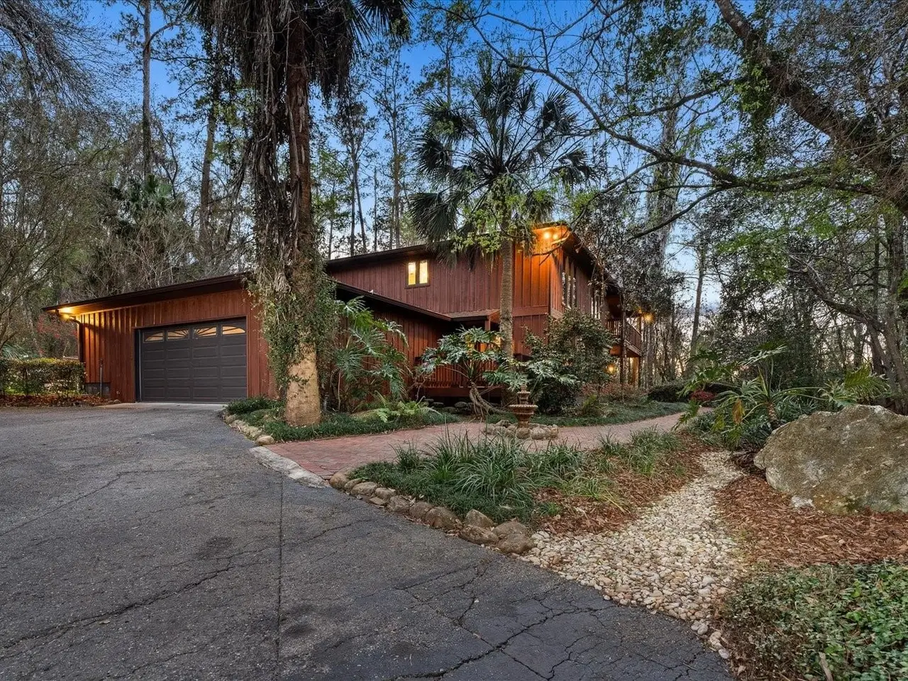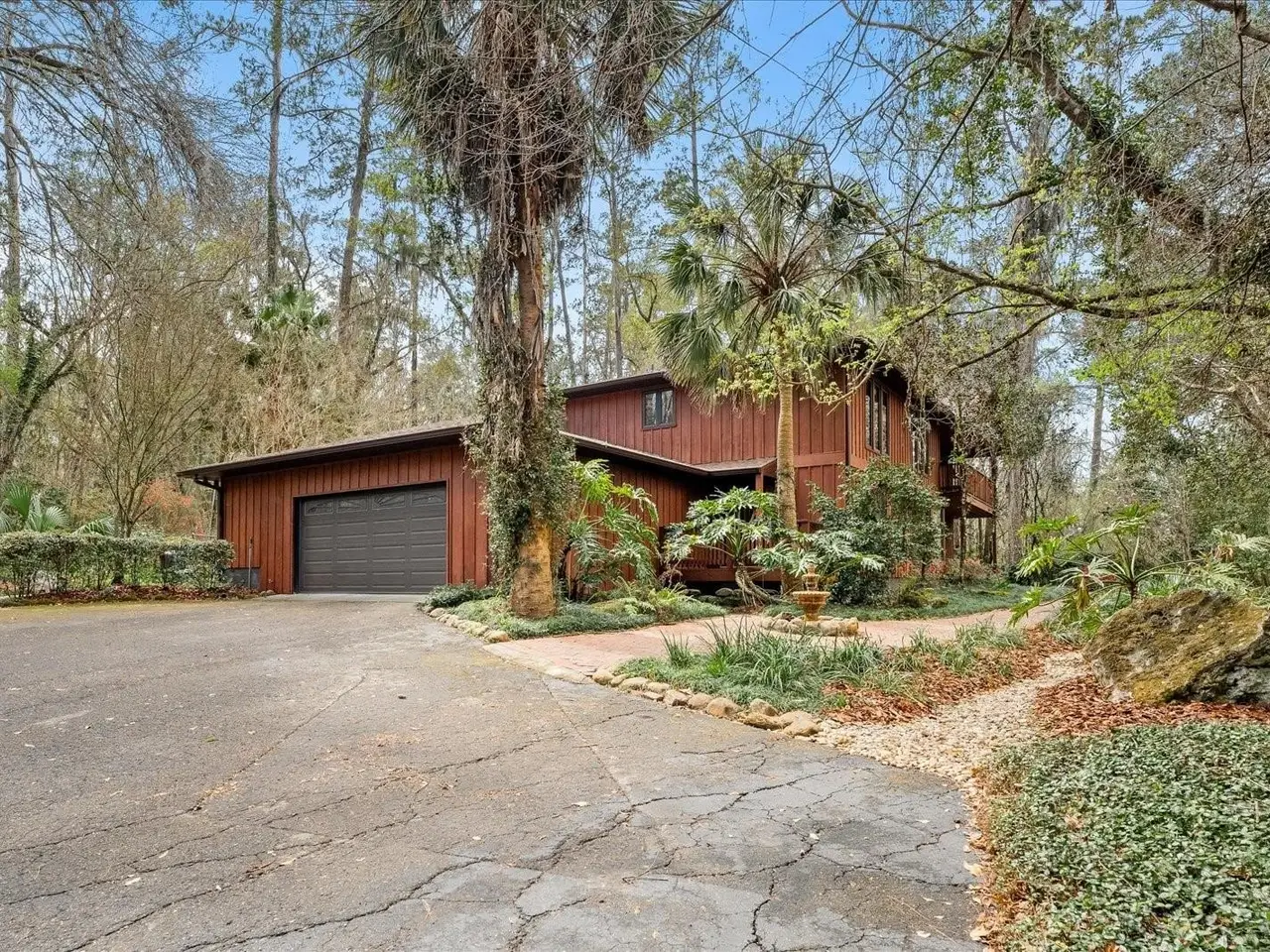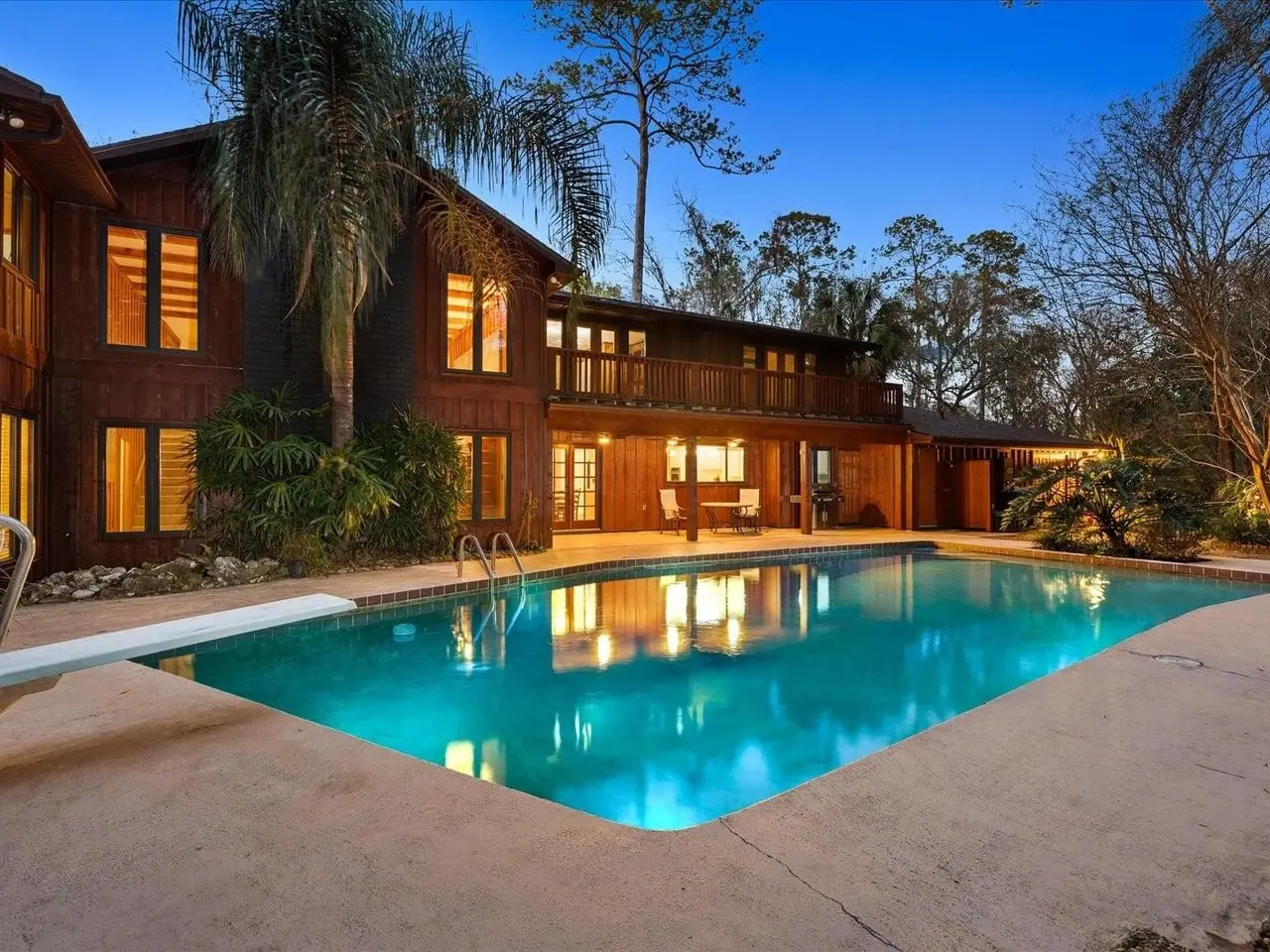 Nestled in Shands Woods, one of Gainesville’s best-kept secrets, this custom-built John Van Mills home sits on over 2.5 acres, seamlessly blending privacy, nature, and convenience—all less than a mile from the University of Florida. Overlooking Hogtown Creek on a secluded lot, this home is a true retreat. Inside, the breathtaking two-story family room features soaring cedar batten and board walls, evoking the warmth of a mountain lodge. A wood-burning Spade stone fireplace serves as the heart of the space, perfect for cozy gatherings or quiet relaxation. The first floor also boasts a formal living room with bay windows overlooking Hogtown Creek, a formal dining room with built-in cabinetry and picturesque outdoor views, a spacious kitchen, and the primary suite. The kitchen includes a double oven, cooktop, center island, and a generous eat-in dining area that opens through French doors to the pool. The first-floor primary suite is a peaceful retreat with views of the wooded yard and pool. Its spa-like bathroom features a soaking tub, walk-in shower, split vanities, and a unique terrarium that brings nature indoors. Upstairs, you'll find five spacious bedrooms, a large office, and a dedicated game room. Two bedrooms have private en suite baths, while the remaining three share a well-sized bath with dual vanities and a shower/jetted tub. One bedroom and the game room open onto a private deck overlooking the pool, while the others enjoy scenic views of the creek and preserve. A spiral staircase from the game room leads to the laundry room. The game room also offers versatility, serving as a potential seventh bedroom, playroom, hobby space, or quiet retreat. Outside, your private oasis awaits—a 30,000-gallon pool surrounded by lush landscaping and total seclusion. A staircase leads to Hogtown Creek, where protected wetlands ensure lifelong privacy—you’ll never have front-door neighbors. This home has been meticulously maintained and thoughtfully updated, featuring new flooring, fresh interior and exterior paint, a new roof (2024), and water heaters (2022). Completely move-in ready, it offers both timeless charm and modern upgrades. Located in the sought-after, no-HOA enclave of Shands Woods, this home offers the best of both worlds—a serene, natural setting just minutes from UF, downtown, Shands, and the VA. Experience the beauty, tranquility, and uniqueness of this exceptional home. Schedule your showing today!