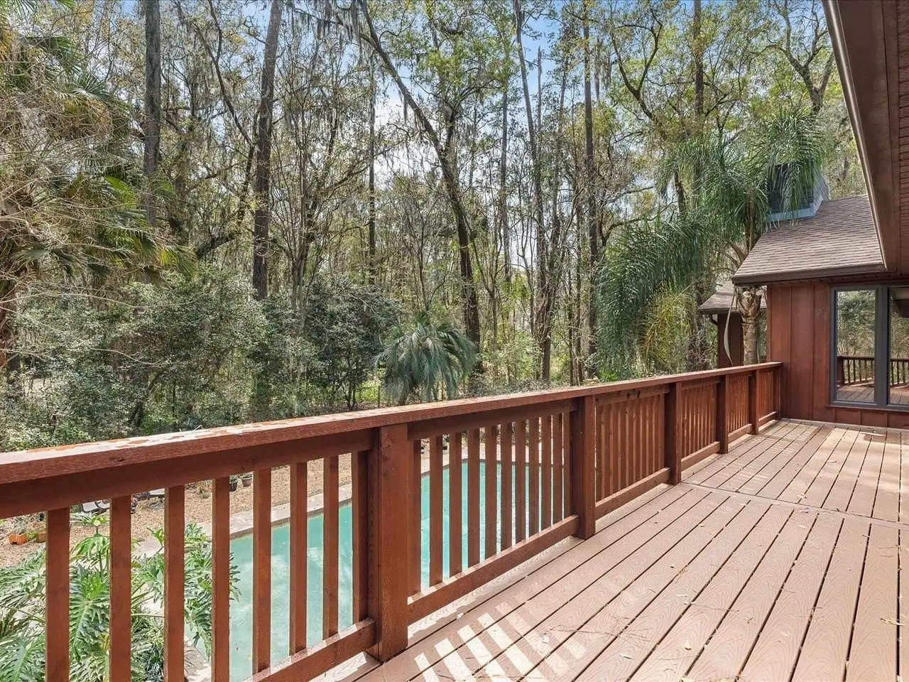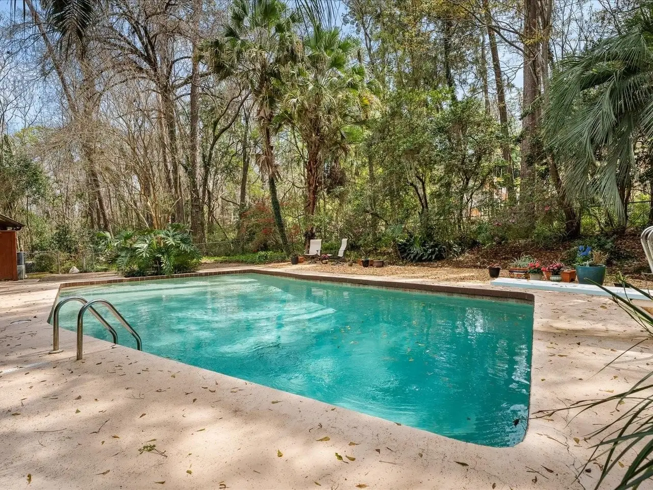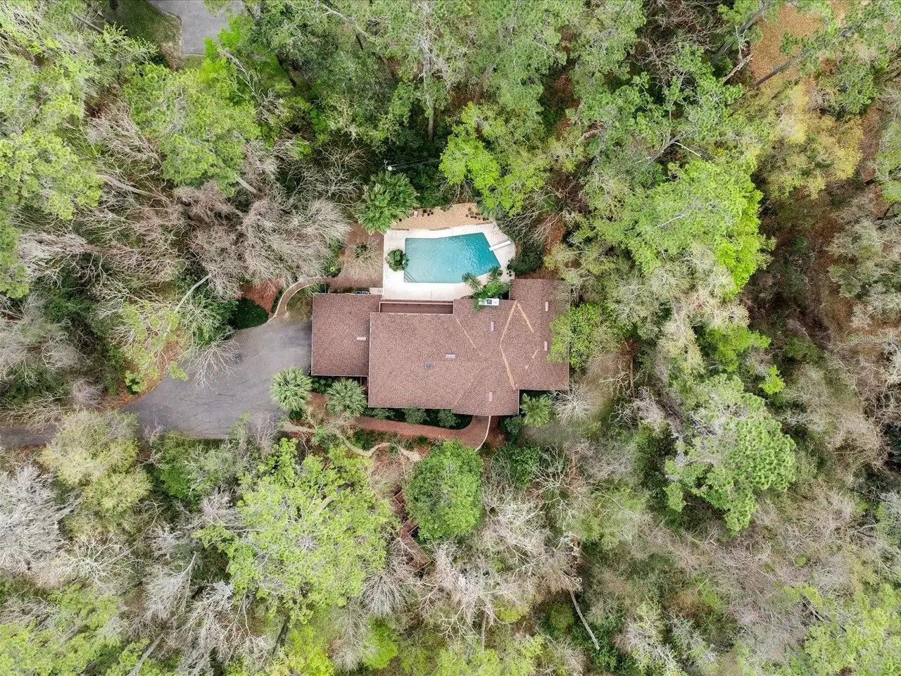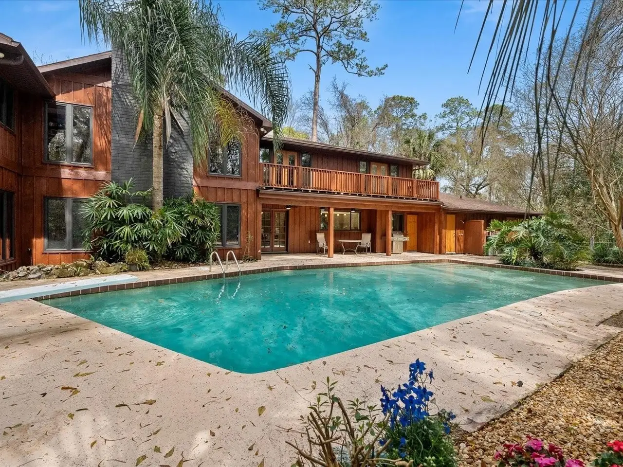Nestled in Shands Woods, one of Gainesville’s best-kept secrets, this custom-built John Van Mills home sits on over 2.5 acres, seamlessly blending privacy, nature, and convenience—all less than a mile from the University of Florida. Overlooking Hogtown Creek on a secluded lot, this home is a true retreat. Inside, the breathtaking two-story family room features soaring cedar batten and board walls, evoking the warmth of a mountain lodge. A wood-burning Spade stone fireplace serves as the heart of the space, perfect for cozy gatherings or quiet relaxation. The first floor also boasts a formal living room with bay windows overlooking Hogtown Creek, a formal dining room with built-in cabinetry and picturesque outdoor views, a spacious kitchen, and the primary suite. The kitchen includes a double oven, cooktop, center island, and a generous eat-in dining area that opens through French doors to the pool. The first-floor primary suite is a peaceful retreat with views of the wooded yard and pool. Its spa-like bathroom features a soaking tub, walk-in shower, split vanities, and a unique terrarium that brings nature indoors. Upstairs, you'll find five spacious bedrooms, a large office, and a dedicated game room. Two bedrooms have private en suite baths, while the remaining three share a well-sized bath with dual vanities and a shower/jetted tub. One bedroom and the game room open onto a private deck overlooking the pool, while the others enjoy scenic views of the creek and preserve. A spiral staircase from the game room leads to the laundry room. The game room also offers versatility, serving as a potential seventh bedroom, playroom, hobby space, or quiet retreat. Outside, your private oasis awaits—a 30,000-gallon pool surrounded by lush landscaping and total seclusion. A staircase leads to Hogtown Creek, where protected wetlands ensure lifelong privacy—you’ll never have front-door neighbors. This home has been meticulously maintained and thoughtfully updated, featuring new flooring, fresh interior and exterior paint, a new roof (2024), and water heaters (2022). Completely move-in ready, it offers both timeless charm and modern upgrades. Located in the sought-after, no-HOA enclave of Shands Woods, this home offers the best of both worlds—a serene, natural setting just minutes from UF, downtown, Shands, and the VA. Experience the beauty, tranquility, and uniqueness of this exceptional home. Schedule your showing today!
