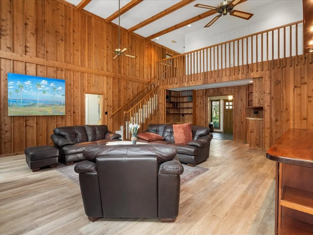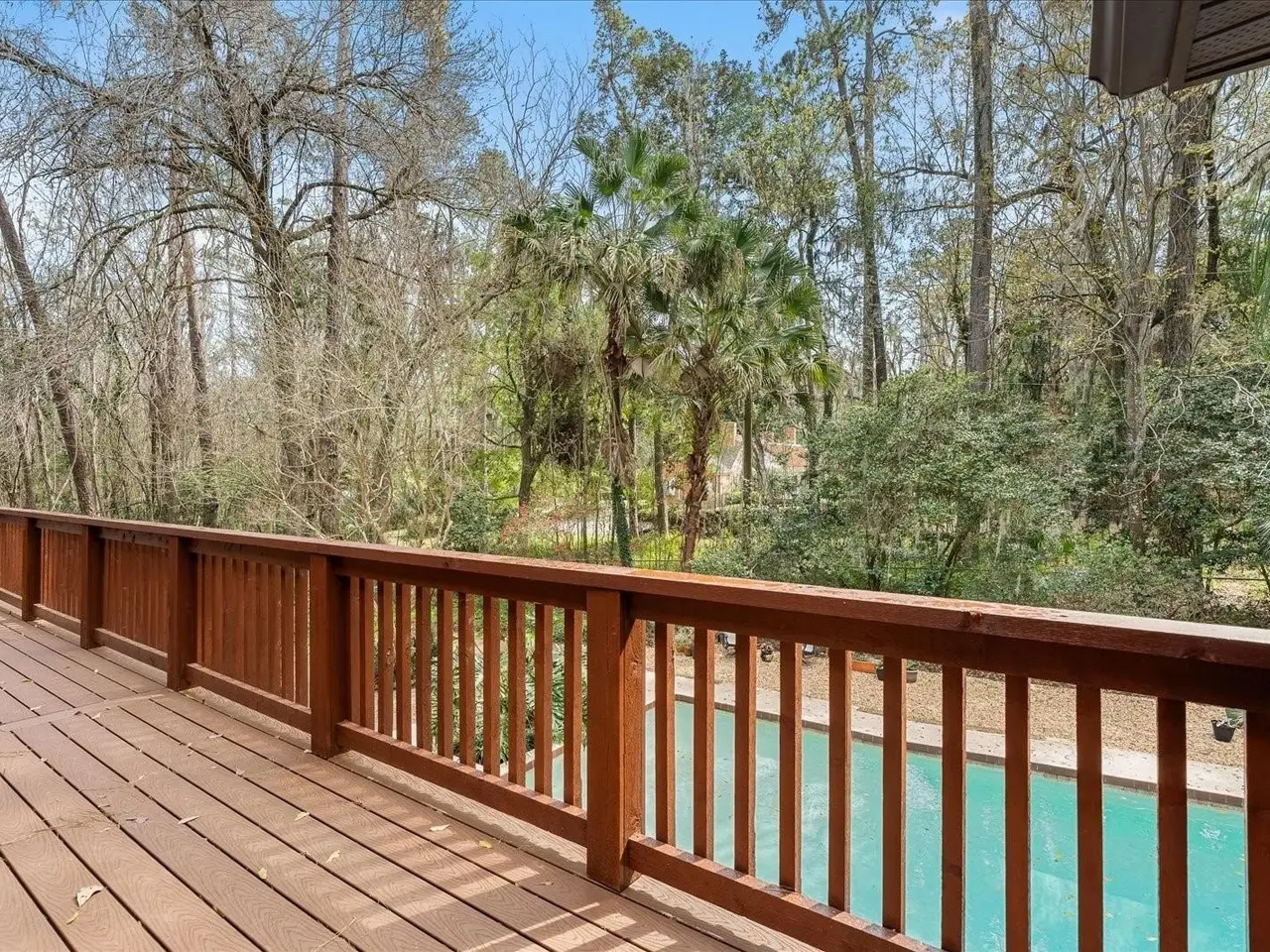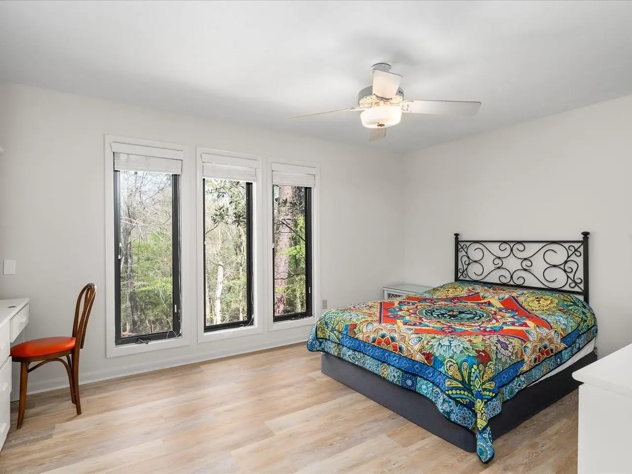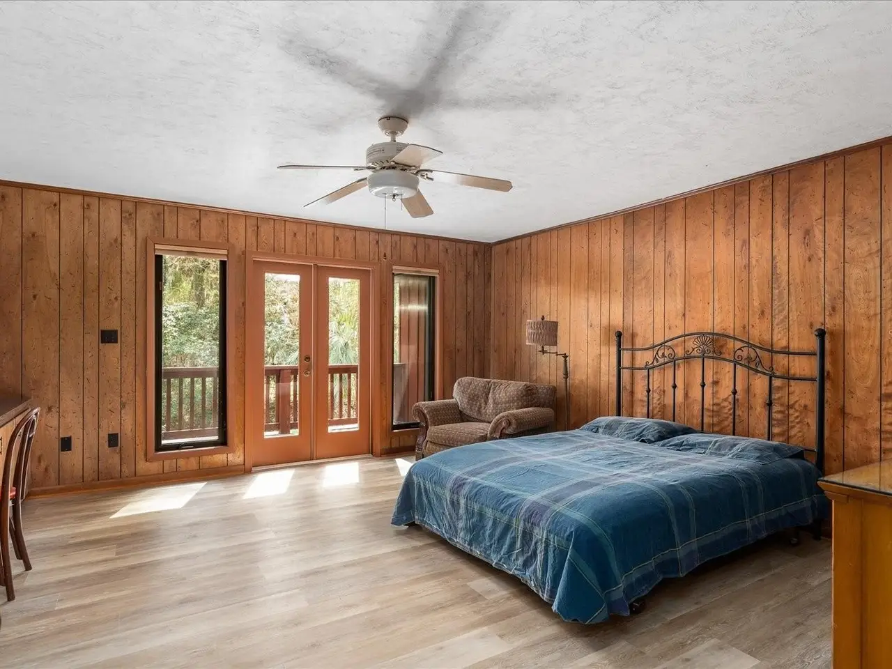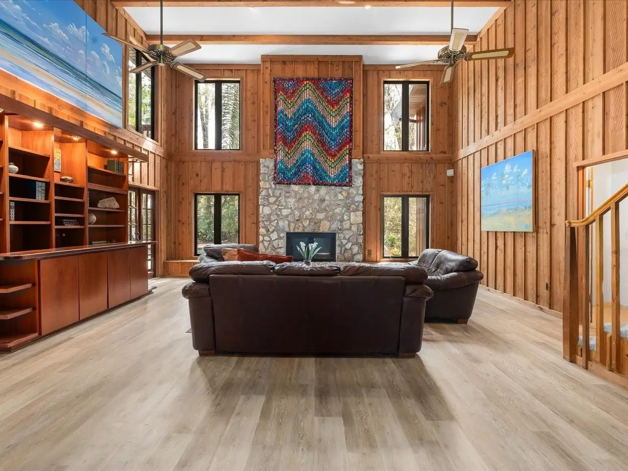 Nestled in Shands Woods, one of Gainesville’s best-kept secrets, this custom-built John Van Mills home sits on over 2.5 acres, seamlessly blending privacy, nature, and convenience—all less than a mile from the University of Florida. Overlooking Hogtown Creek on a secluded lot, this home is a true retreat. Inside, the breathtaking two-story family room features soaring cedar batten and board walls, evoking the warmth of a mountain lodge. A wood-burning Spade stone fireplace serves as the heart of the space, perfect for cozy gatherings or quiet relaxation. The first floor also boasts a formal living room with bay windows overlooking Hogtown Creek, a formal dining room with built-in cabinetry and picturesque outdoor views, a spacious kitchen, and the primary suite. The kitchen includes a double oven, cooktop, center island, and a generous eat-in dining area that opens through French doors to the pool. The first-floor primary suite is a peaceful retreat with views of the wooded yard and pool. Its spa-like bathroom features a soaking tub, walk-in shower, split vanities, and a unique terrarium that brings nature indoors. Upstairs, you'll find five spacious bedrooms, a large office, and a dedicated game room. Two bedrooms have private en suite baths, while the remaining three share a well-sized bath with dual vanities and a shower/jetted tub. One bedroom and the game room open onto a private deck overlooking the pool, while the others enjoy scenic views of the creek and preserve. A spiral staircase from the game room leads to the laundry room. The game room also offers versatility, serving as a potential seventh bedroom, playroom, hobby space, or quiet retreat. Outside, your private oasis awaits—a 30,000-gallon pool surrounded by lush landscaping and total seclusion. A staircase leads to Hogtown Creek, where protected wetlands ensure lifelong privacy—you’ll never have front-door neighbors. This home has been meticulously maintained and thoughtfully updated, featuring new flooring, fresh interior and exterior paint, a new roof (2024), and water heaters (2022). Completely move-in ready, it offers both timeless charm and modern upgrades. Located in the sought-after, no-HOA enclave of Shands Woods, this home offers the best of both worlds—a serene, natural setting just minutes from UF, downtown, Shands, and the VA. Experience the beauty, tranquility, and uniqueness of this exceptional home. Schedule your showing today!