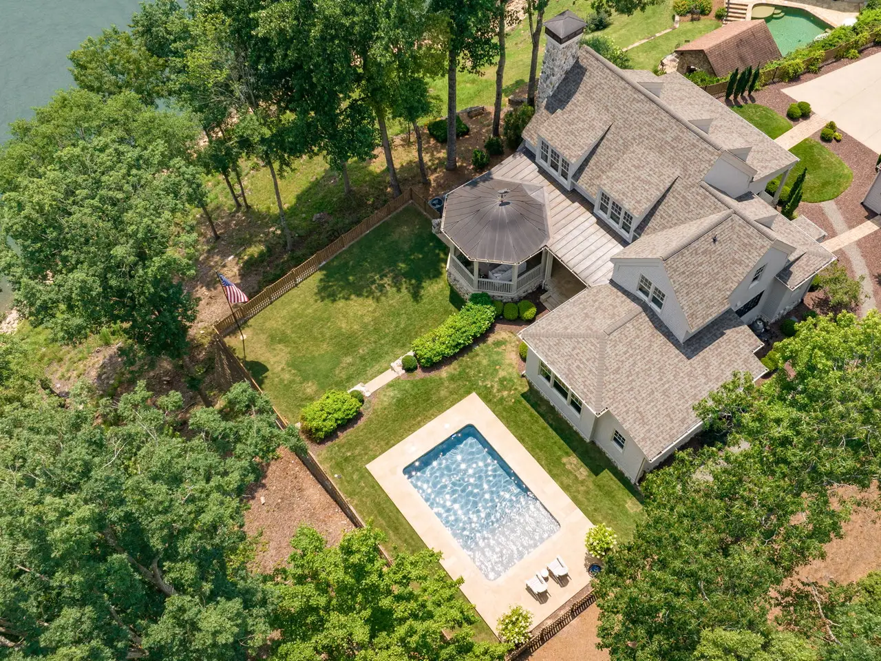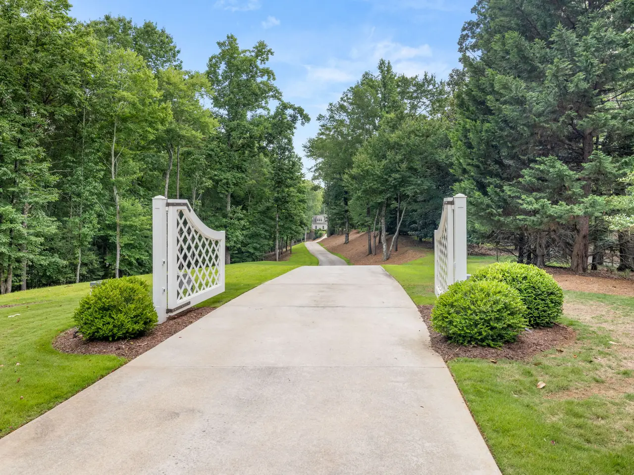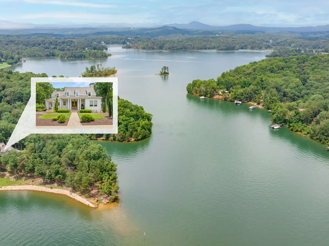 Southern coastal charm meets Lake Lanier luxury in this exceptional custom-designed estate, perfectly positioned on a private point lot surrounded by water and breathtaking lake views. Tucked away behind private gates and down a long, secluded driveway, this stunning home offers the ultimate in resort-style living, just minutes from the Chattahoochee Country Club and its private marina. Designed by renowned architect Stephen Fuller, this four-bedroom, four and a half bath residence blends timeless architecture with modern luxury. The home features a hardy shake and river rock exterior, beautifully landscaped shoreline with river rock detailing, and year-round views from nearly every room. A heated pool, level fenced backyard, covered back porch, and two detached two-car garages complete the outdoor oasis. Inside, the open-concept layout is filled with natural light and framed by walls of glass, maximizing the lake views. The two-story foyer opens into a vaulted great room with a stone fireplace and an elegant dining space. The gourmet kitchen is a chef's dream, with quartzite countertops, a large island, custom cabinetry, stainless steel appliances including a six-burner gas range, and a spacious prep pantry that doubles as a bar and entertaining space. The main-level primary suite is a serene retreat with views of the pool and lake, and a spa-inspired bath featuring a soaking tub, dual vanities, custom shower, and two walk-in closets. A second main-level bedroom and full bath offer flexibility for guests or a home office. Upstairs, a central gathering area leads to two generous en-suite bedrooms with custom closets. Additional highlights include a welcoming office area off the kitchen, a large laundry room, and an unfinished daylight terrace level with approximately 2168 square feet ready to be customized. Modern conveniences abound, with a whole-house generator, natural gas for cooking, fireplaces, heating, and pool, plus an irrigation system, professional landscaping, and outdoor lighting. This home is a rare opportunity to enjoy the best of lakefront living, thoughtfully designed for both everyday comfort and exceptional entertaining.