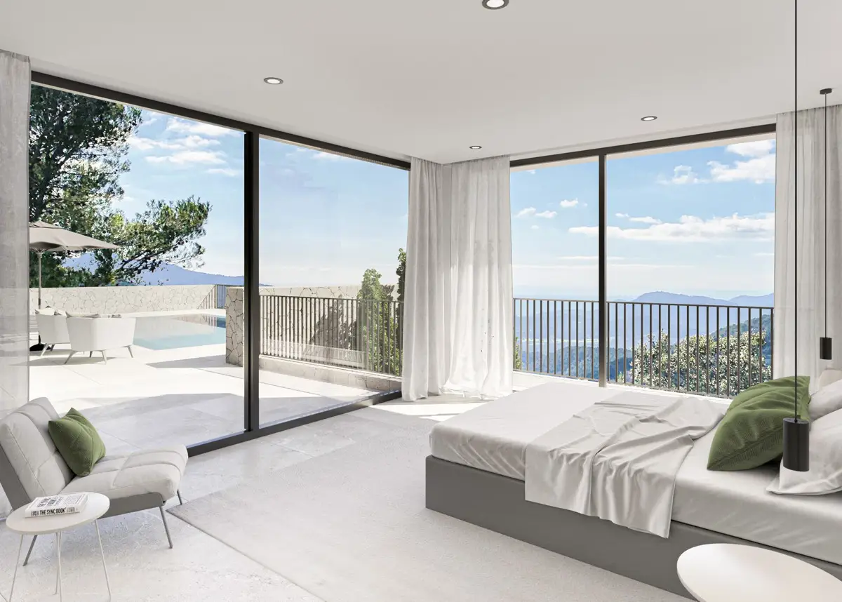 This new villa is currently being completed in the idyllic mountain village of Galilea. The design of this house impresses with the combination of modern elements with typical Mallorcan ones. The view goes all the way to the bay of Santa Ponsa and offers a beautiful panorama. On the upper floor of the villa is the open living-dining area with fireplace and the luxurious kitchen. Adjacent is the guest toilet and a pantry. The pool level with the spacious sun terrace and lounge area can be reached from all four bedrooms, each of which has its own bathroom. The lowest floor houses a spa, the garage and the building services. An elevator connects all levels. The equipment includes, among other things, smart home elements, air conditioning and underfloor heating.