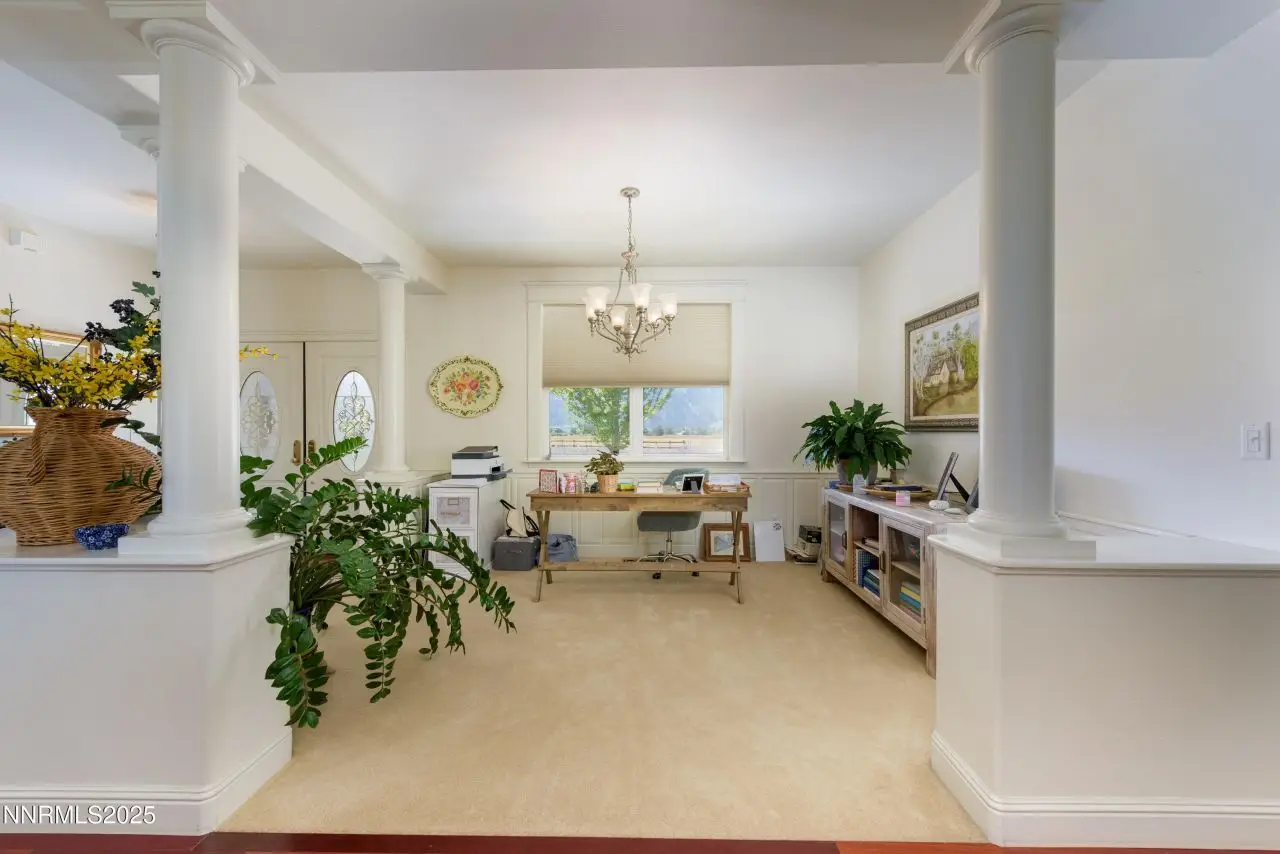 Welcome to your serene retreat in the heart of Carson Valley - five fully fenced acres with surface water rights, stunning views of the Sierra Nevada and Job's Peak, and a rare combination of privacy and convenience. The 2,554 sq ft main residence offers 3 bedrooms, 2.5 bathrooms, and an open, light-filled great room with a bright all-white kitchen. Ceramic tile and soft carpet flow throughout, while windows frame mountain vistas and a well-manicured landscape, bringing the outdoors in. The spacious primary bedroom features an en suite bathroom, a walk-in closet, and inspiring views that make every morning feel like a getaway. A 3-car attached garage provides generous storage and utility. The 800 sq ft guest house is equally inviting, with 1 bedroom, 1 bathroom, and its own wraparound porch for sunrise coffee or evening relaxation. With a 2-car garage and open layout, it's perfect for extended family, guests, or a private studio. Horse-friendly acreage, tasteful landscaping, RV parking, and plenty of room to build a shop, barn, or other outbuildings make this property as functional as it is beautiful. Just minutes from town yet a world apart, it's a unique blend of upscale country living and modern comfort-ready to welcome you home.
