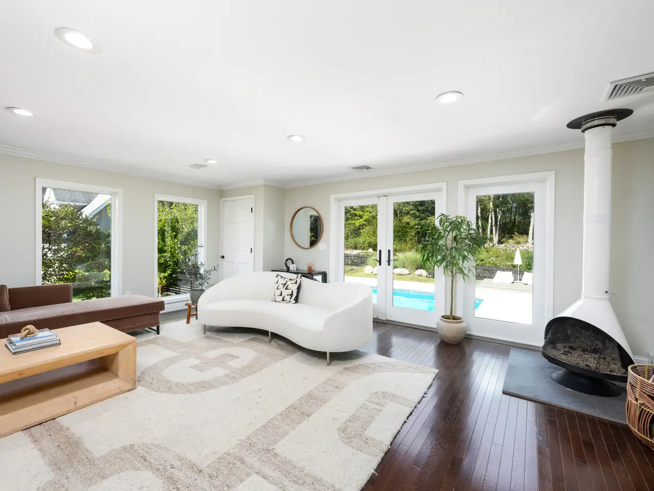 At Hudson Ridge, the essentials of a home, location, design, and space, come together with ease. Recently reimagined to capture natural light and a contemporary aesthetic, it offers a setting that is both open and inviting. Set on nearly five acres, the property has the character of a country estate. The main level is anchored by a spacious living room with a modern free standing fireplace and glass doors that open to the updated pool and deck. At the heart of the home, the renovated kitchen connects to the dining room on one side and to a den with a woodburning fireplace on the other. A second deck extends from the den, overlooking the level backyard.Also on this floor are a bedroom and an additional room that functions as a formal living room, study, or office. Upstairs, the primary suite includes a renovated bath and generous closets, while two additional bedrooms and a full bath provide ample space.The finished lower level offers room for movies, games, or exercise, while a bright studio above the detached two car garage serves as a flexible workspace. The detached two car garage is equipped with a Tesla charging station for convenience.Balancing privacy, light, and versatility, Hudson Ridge adapts easily to a variety of lifestyles. Its central location places MetroNorth, schools, and the shops and restaurants of Cold Springs historic village just minutes away, bringing the best of the Hudson Valley within reach.