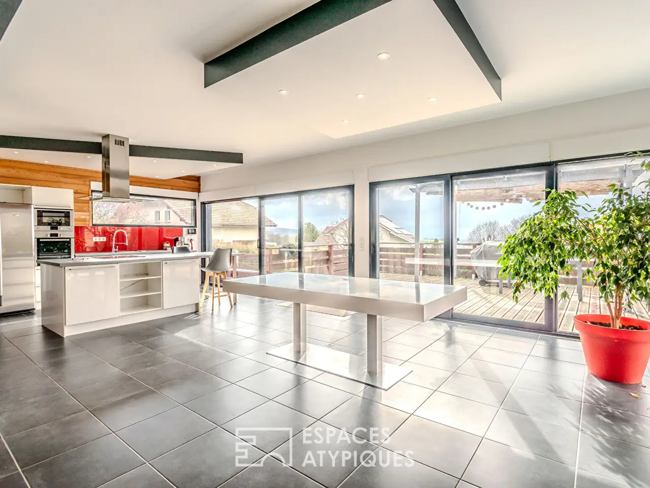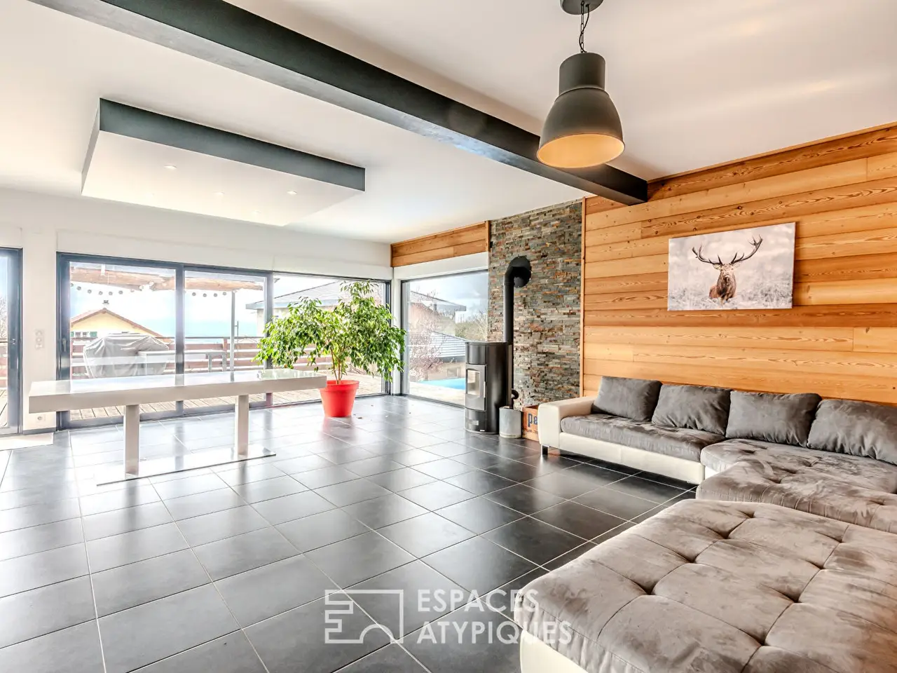 Magnificent contemporary villa of 212 sqm, ideally located a few steps from the center of Gex, in a peaceful and green setting, in the heart of a sought-after residential area.Upon entering, you will be seduced by a vast living room of 80 sqm, bathed in natural light thanks to large bay windows, offering a feeling of volume and openness to the outside.This bright living space consists of a modern kitchen, open to a convivial living room with dining room and lounge, equipped with a pellet stove for a warm atmosphere. From this living room, you directly access a generous terrace, ideal for your outdoor meals, with a breathtaking view of the majestic Alps.A second living room, with a cozy atmosphere thanks to its fireplace, invites you to relax and serenity. The ground floor also houses two bedrooms, one with a private shower room, the other with a whirlpool bathtub for moments of absolute relaxation. A laundry/boiler room completes this floor.Upstairs, a true haven of peace awaits you: a dressing room, a modern shower room, and a large air-conditioned master bedroom, offering the possibility of being modulated into two separate spaces. This master suite opens onto a panoramic 70 sqm terrace, providing an idyllic setting to enjoy the breathtaking view of the Alps.The basement, meanwhile, houses a cellar, a workshop, and a games room, thus offering multiple layout possibilities. Outside, you will appreciate a double carport as well as two rooms dedicated to bicycles and motorcycles. In the summer season, the above-ground swimming pool will complete this picture of life, for moments of relaxation with family or friends.This villa, combining elegance, modernity, and comfort, is a rare and privileged place to live. Its location, a few minutes from the Swiss border, will allow you to benefit from an exceptional living environment, while being close to all amenities.Estimated average annual energy costs for standard use, based on 2022 energy prices: between 2,113 Euros and 2,993 Euros.Information on the risks to which this property is exposed is available on the Georisques website for the areas concerned: www.georisques.gouv.fr.REF. 1947EAAdditional information* 4 rooms* 3 bedrooms* 1 bathroom* 2 shower rooms* Outdoor space : 1518 SQM* Parking : 3 parking spaces* Property tax : 1 600 €* Provision for charges : 4 100 €Energy Performance CertificatePrimary energy consumptionc : 148 kWh/m2.yearHigh performance housing*A*B*148kWh/m2.year29*kg CO2/m2.yearC*D*E*F*GExtremely poor housing performance* Of which greenhouse gas emissionsc : 29 kg CO2/m2.yearLow CO2 emissions*A*B*29kg CO2/m2.yearC*D*E*F*GVery high CO2 emissionsAgency feesThe fees include VAT and are payable by the vendorMediatorMediation Franchise-Consommateurswww.mediation-franchise.com29 Boulevard de Courcelles 75008 ParisInformation on the risks to which this property is exposed is available on the Geohazards website : www.georisques.gouv.fr