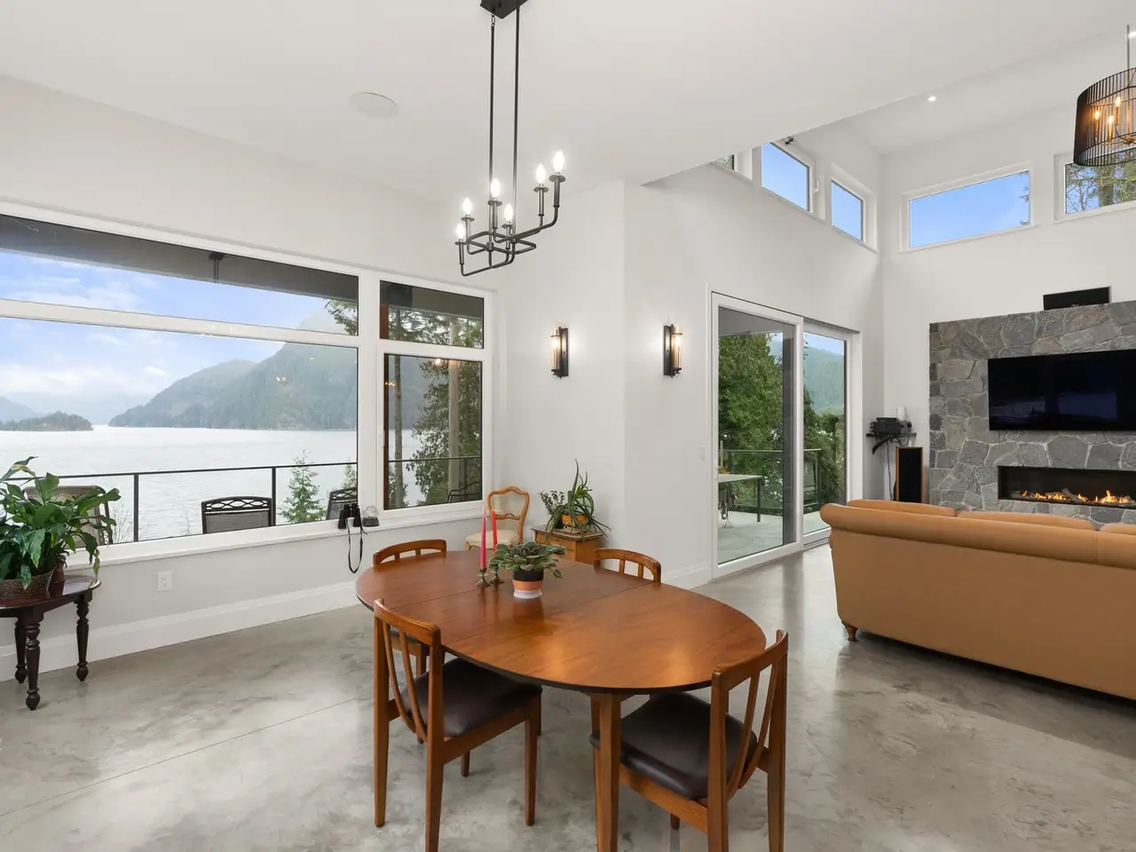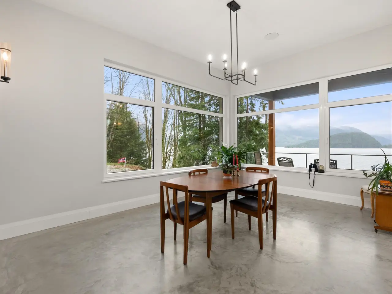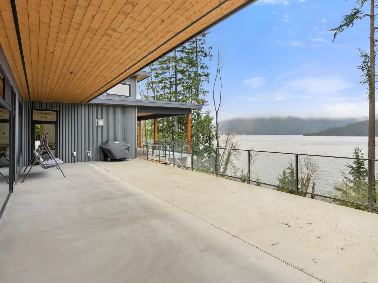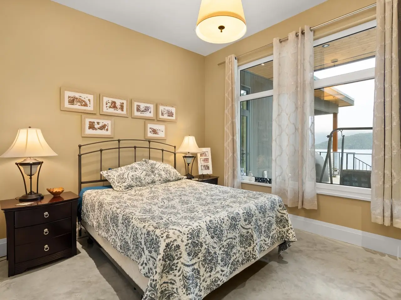 Spectacular views from quality custom-built rancher at end of private road into 4.94 acres. Polished cement floors, 9’ to 12’ ceilings, European tilt and turn windows, custom stonework and arched doorways. Bright gorgeous kitchen, huge island, quartz counters, maple cabinets, Blanco sinks and Kohler faucets. High end stainless steel appliances, gas stove. Large pantry, spacious primary bedroom with walk in closet, five-piece ensuite with double sinks, soaker tub and large double walk-in shower. Media Room and office, each convertible to extra bedrooms. 1500 sq ft patio with splendorous views of the Thornbrough Channel, whale and eagle watching. Two-minute foot access to 215’ of waterfront beach access for swimming and launching kayaks, paddleboards. Zoned for second dwelling and garage wired for EV.