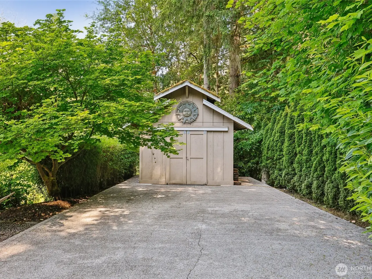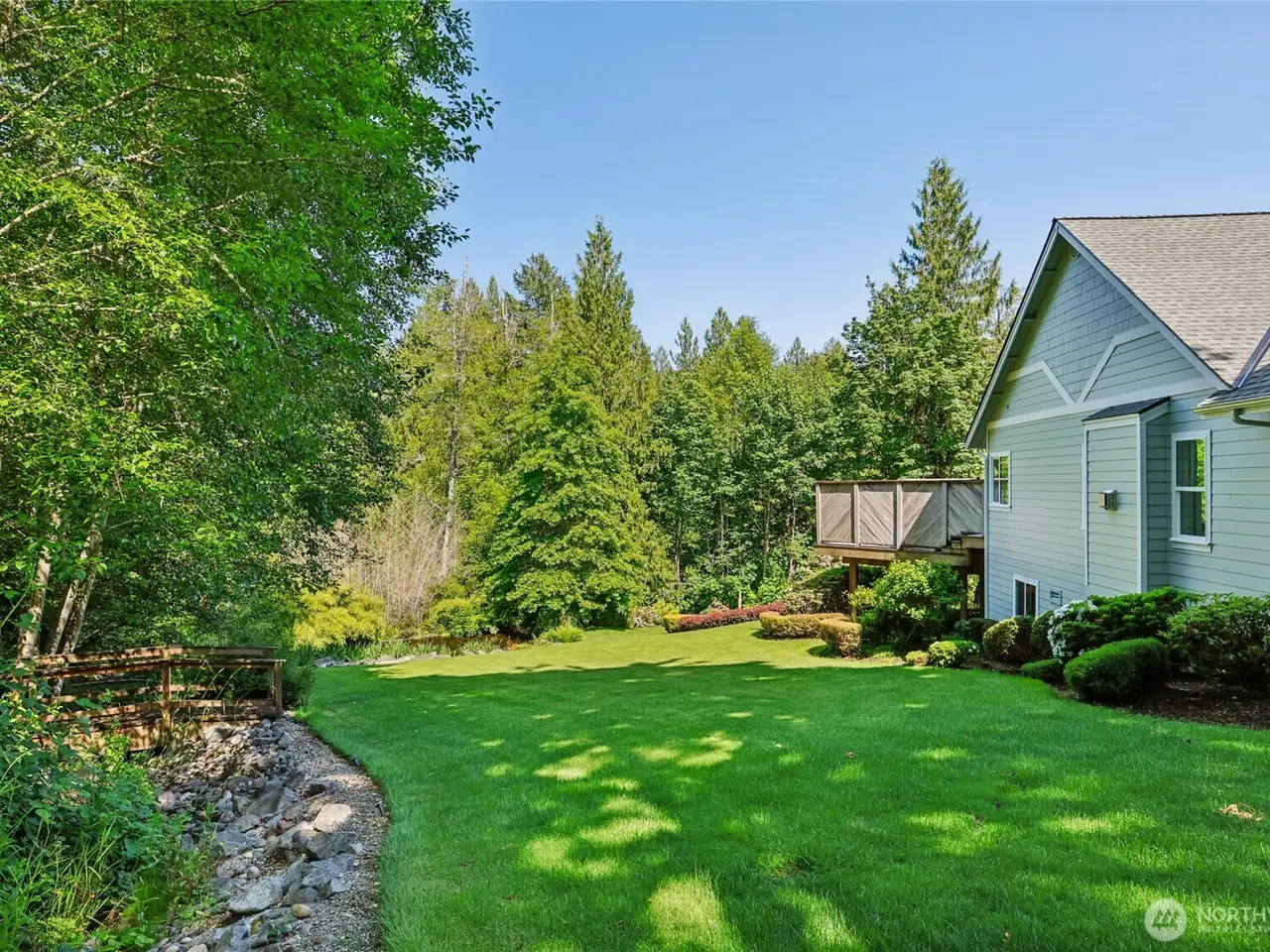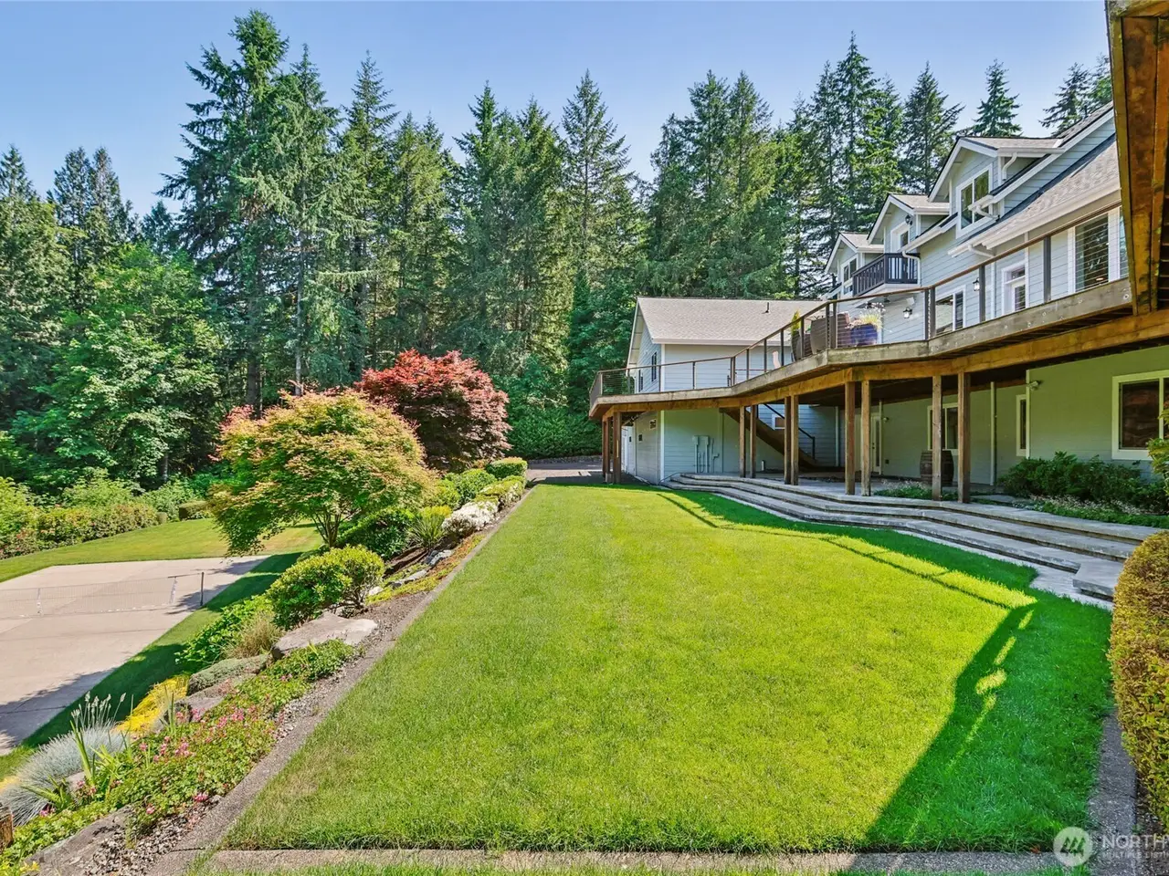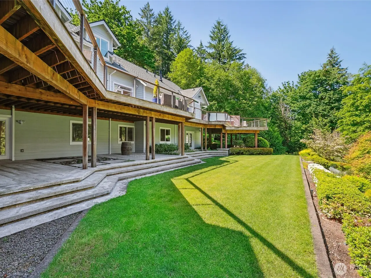 Gorgeous acreage property with multigenerational living & 826sf of garages. Meander through the trees to this breathtaking property. Covered wrap around porch guides you into the open & bright great room with walls of windows overlooking the trees. Primary suite on main with walk in shower & access to hot tub. Gracious office with built-ins. Chef's kitchen with granite counters. Bonus room & extra finished rooms. Lower floor features wet bar, wine room & 2 full baths. 1 bed/1 bath attached apartment with no stairs. Radiant in-floor heating in main house. Nearly 2000sf of decks overlook ponds, greenbelt, everchanging landscaping & sport court! (2) garages = 6 cars. RV parking w/hookups. Surrounded by greenbelt of forest, yet gets all day sun.