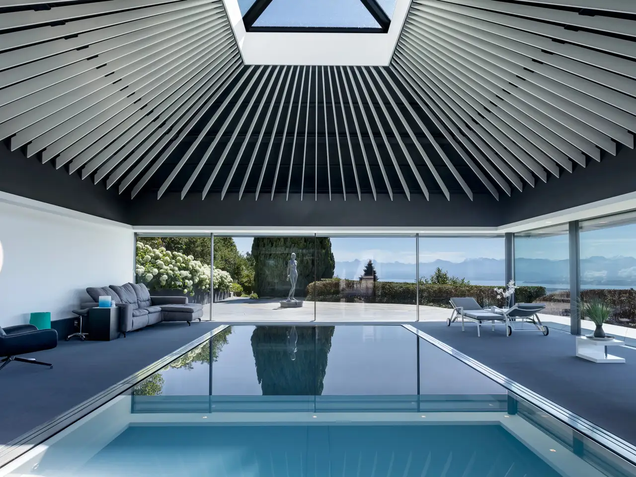 Located in the heart of a peaceful, leafy residential area in the sought-after commune of Givrins, this exceptional property offers a rare, serene living environment. Built in 1980 on a generous plot of over 2,670 m², the house underwent a complete renovation in 2019, incorporating noble materials and top-of-the-range features. With around 530 m² of living space on two levels, it boasts contemporary, atypical interior architecture, designed for an art of living that combines comfort, well-being and aesthetics. The first floor opens onto a vast reception room featuring a lounge with smoking area, as well as a remarkable wellness area equipped with indoor pool, hammam, sauna, changing rooms and sanitary facilities. The kitchen is the centerpiece of the house, seducing visitors with its elegance, functionality and central position, offering a breathtaking view of the surrounding fields, Lake Geneva and the majestic Mont-Blanc. An independent studio with kitchen, living room and shower room completes this level. Upstairs, the master suite features a bathroom, dressing room and access to a private terrace. Two further bedrooms with en suite bathrooms, an office and a laundry room complete this level. The partially excavated basement houses a home cinema, wine cellar, storage space, two utility rooms and a PC shelter. Outside, the landscaping has been carefully designed to guarantee privacy and tranquillity, with a large terrace, an unoverlooked garden planted with trees, a garden shed and a covered area for four vehicles. Offering an excellent level of maintenance and optimal energy performance, this property is a turnkey residence, immediately habitable by its future owner.