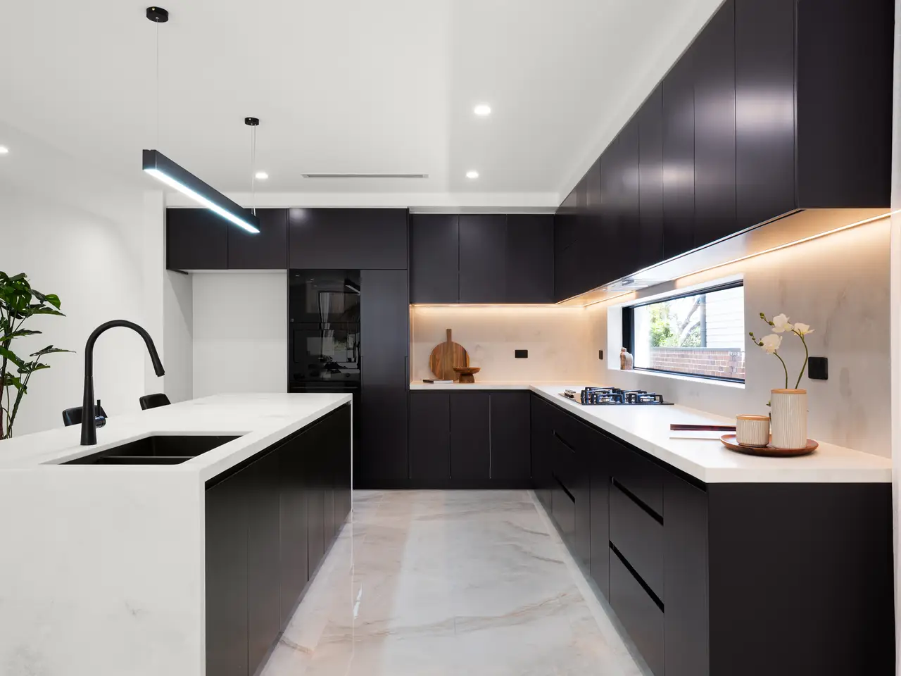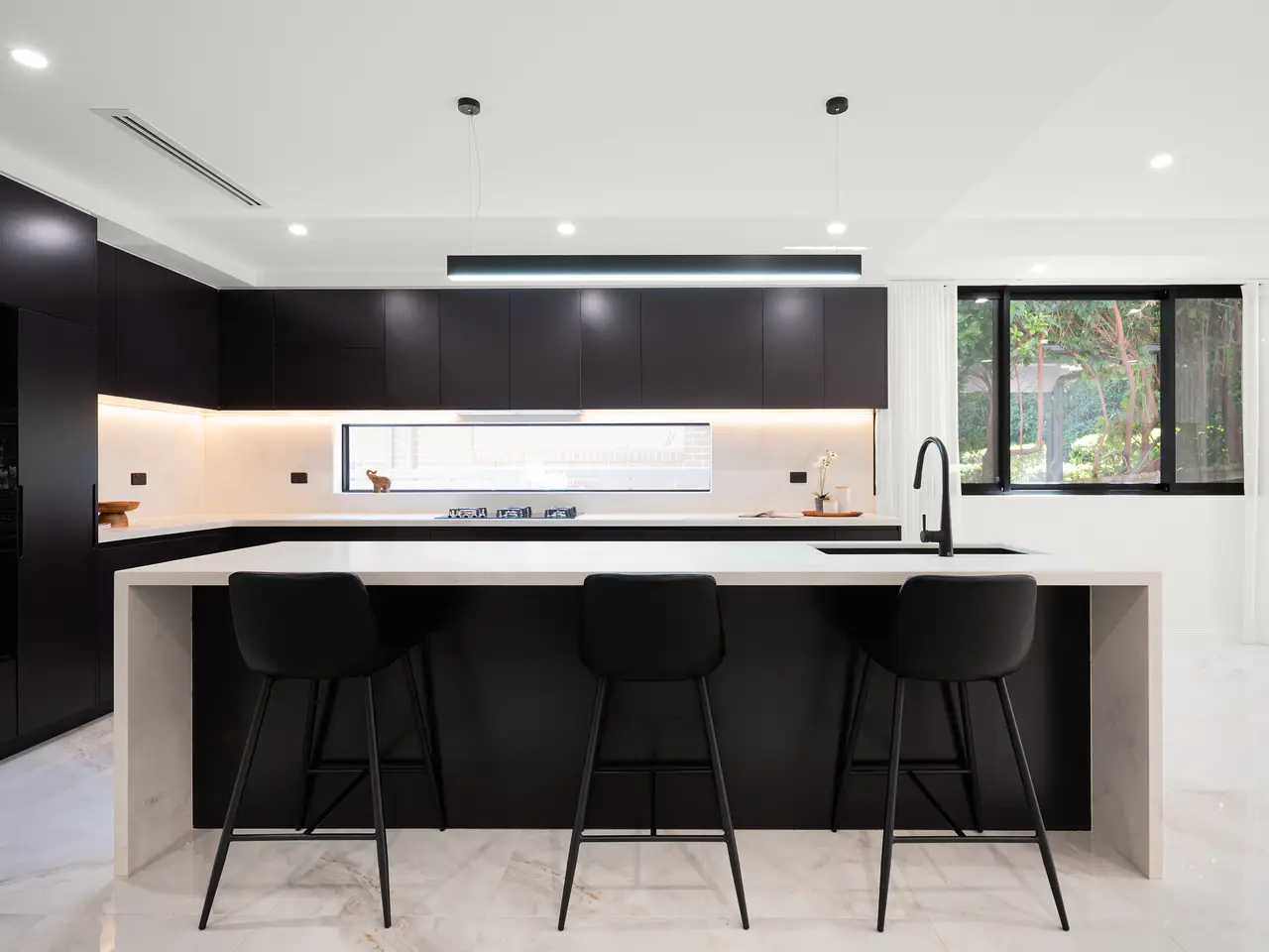 Stone benchtops and splashbacks, large island