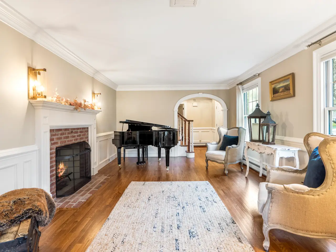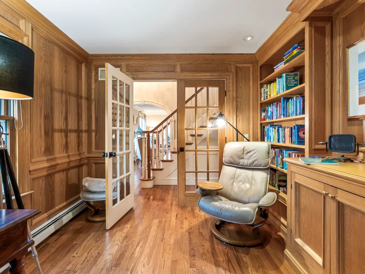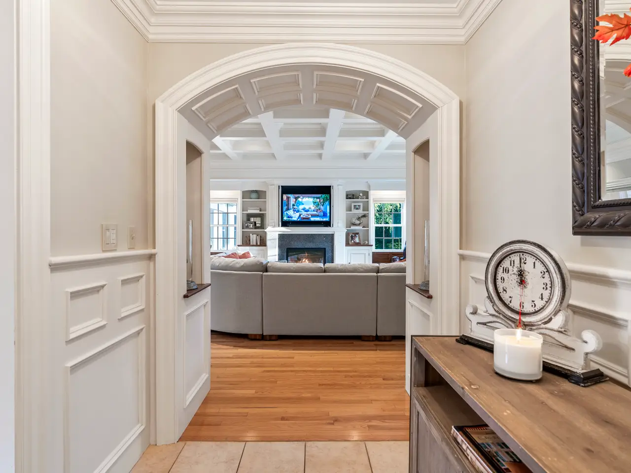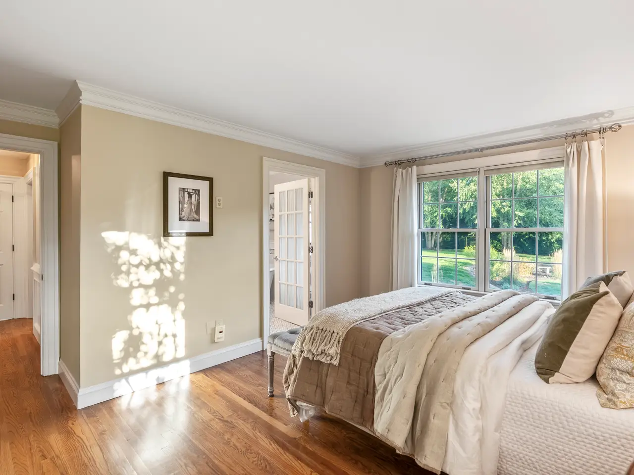 Extensive trim and molding throughout set this stunning custom home apart from any other. Every corner highlight extraordinary trim, detailed architecture, and unmatched craftsmanship. 25 meticulously crafted coffered ceilings, elegant wainscoting, multi-tiered crown molding, arched entryways, and custom inset cabinetry - a level of detail nothing short of phenomenal. Located in the coveted Red Hill neighborhood, homes rarely come on the market. Buyers often reach out to owners to inquire about selling. The home's incredible curb appeal is matched by beautifully landscaped grounds featuring a bluestone patio, outdoor TV, stone walls, fire pit, fountain, vegetable garden, and landscape lighting. Inside, there are three fireplaces that anchor the home's inviting atmosphere, while the custom kitchen offers an oversized island with second sink, two refrigerator drawers, and spacious pantry. Flowing together, the formal living and dining rooms-with a charming wood-burning fireplace-create a perfect setting for entertaining. The first-floor primary suite is exquisitely appointed, with a walk-in closet and a beautifully remodeled bath. The home office is thoughtfully designed with custom shelving, inset cabinetry, and French doors. Upstairs, a renovated full bath serves the secondary bedrooms. 650 sq. ft. finished walk-out lower level provides versatile space for entertaining, playroom, or home. Carefully crafted for both elegance and daily living, this home is truly exceptional.
