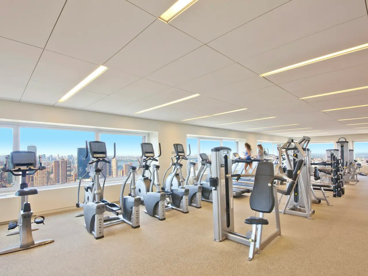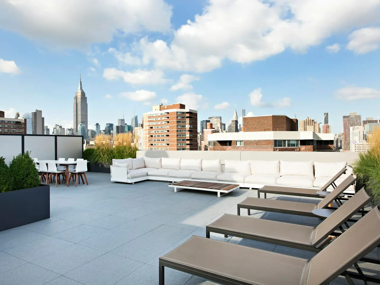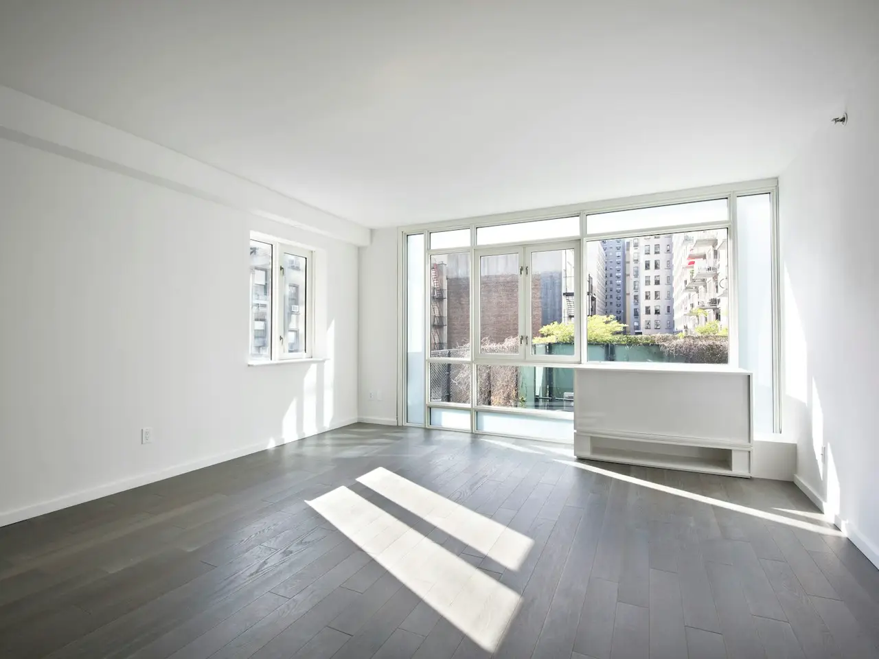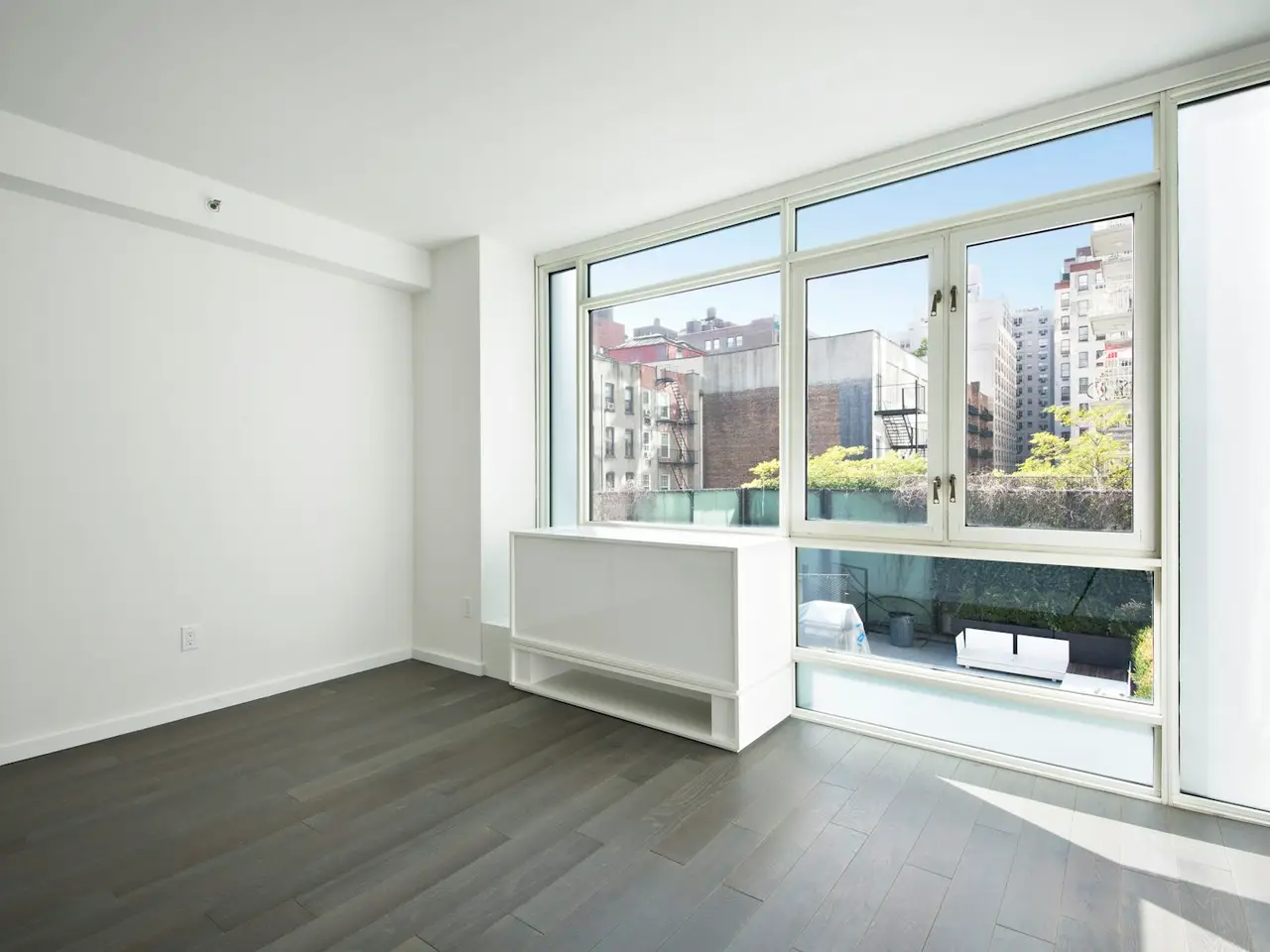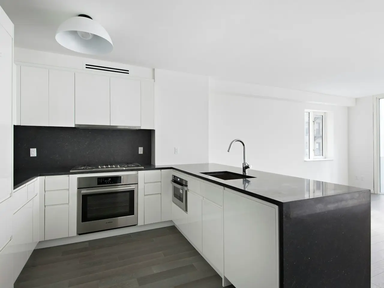 Floor-to-ceiling windows frame bright city views in this spacious one bedroom, one bathroom home. The entry foyer with a large coat closet leads to an open kitchen that is appointed with glossy white Italian lacquer cabinetry, honed marble countertops and backsplashes, an integrated Sub-Zero refrigerator and freezer, a 36" Bosch gas cooktop, ventilation hood, as well as a wall oven, microwave, and Bosch dishwasher. The generously proportioned living room is perfect for entertaining. The west-facing bedroom features views of the landscaped terrace and an adjoining bathroom featuring honed Grey Fume marble on the floor, a custom-designed vanity finished in ash veneer with a blackened steel frame, polished nickel fixtures by Waterworks, and a Toto toilet. Your home also boasts the ultimate luxury: an in-unit washer and vented dryer. The building offers a full suite of amenities, including a 24-hour doorman, live-in super, private landscaped terrace, resident lounge, fitness center and a large, landscaped roof terrace with panoramic views.