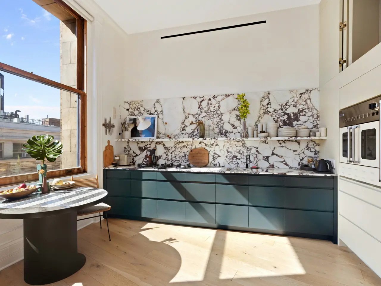 LIVE IN THE LIGHT Highly refined, and deeply serene, this light-filled, architecturally significant loft is a rare opportunity to live with great beauty while overlooking the Flatiron, one of Manhattan’s most desired & storied neighborhoods. Thoughtfully renovated with impeccable skill by renowned architect Elizabeth Roberts, this graceful city flat blends classic New York character with an elevated sense of style to inspired effect. Seven massive original oak-framed windows offer stunning, long-range views from Union Square Park — home to the beloved farmers market — all the way to the iconic Woolworth Building. The corner exposure also means that sunlight graces the entire space, enhancing its open, effortless design. A spectacular wooden floor takes you into a chefs’ kitchen that is both striking and efficient. Framed by a Calacatta Viola Marble counter and oversized backsplash, the PITT Cooking stove and Blue Star oven are sure to inspire your inner gourmet. A Fisher & Paykel 36” refrigerator, Miele dishwasher and Better Waters filtration system complete this area. Soaring 12’ ceilings, original architectural details, and a seamless open floor plan are thoughtfully balanced by custom millwork, elegant use of materials, and an emphasis on spatial flow and ease of life. An impressive, oversized pivot door leads into the expansive bedroom, as well as a stylish bathroom with Zuchetti soaking tub, and of course a walk-in closet. The apartment also has one of the most charming mezzanine spaces in town. Currently used for sleeping, it offers many possibilities. A guest bath with striking pink onyx marble wall and sink is found just downstairs. At the nexus of downtown living, the romantic neo-Gothic McIntyre Building offers an unparalleled blend of location, Gilded Age grandeur, and a soulful city experience. Just one block away is where Andy Warhol’s Factory made art and shaped culture. In the 1970’s in this very space was a legendary after-hours club called Cobra’s Lair. It's said that cobras can be charmed, but in the case of the loft at Cobra’s Lair, it does all the charming.