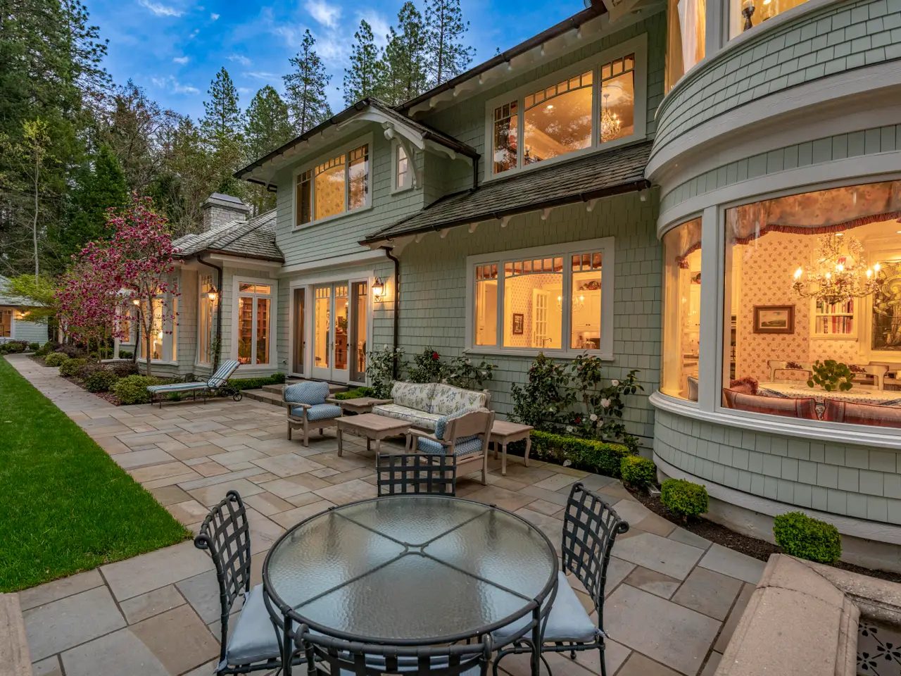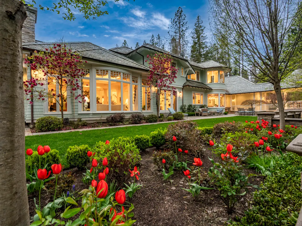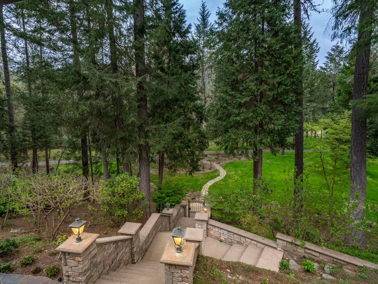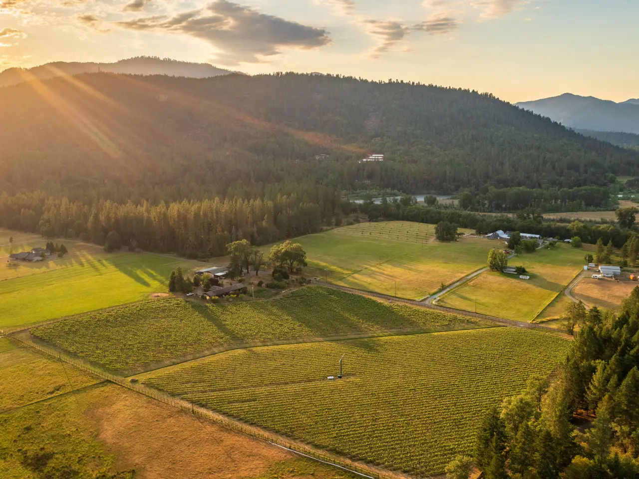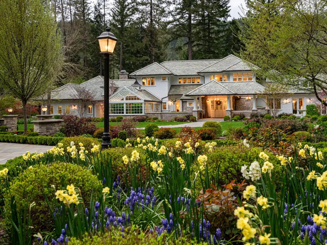 For the first time, this distinguished riverfront estate is made available for purchase. Greeted by a European-inspired bridge & water features, this exquisite English Country estate is elevated above & within the Wild & Scenic section of the Rogue River. Designed by Mike Casella, it blends Arts & Crafts details with Victorian elegance. Highest quality materials & craftsmanship throughout including imported slate roof, hand-carved Carrara marble fireplaces, & custom millwork. A well-appointed chef's kitchen, butler's pantry, root cellar, conservatory, library, main level primary suite with baja & steam showers, dressing room w/ extensive built-ins, and three vanities. Lush and irrigated, year-round color with 1000's of plantings. Numerous water features, 15000 SF garden w/ orchard, berries & vines. Detached gym/home office, finished 3 car garage, barn w/guest quarters, private riverfront park, and a separate 10-acre organic vineyard, including the Coventina wine brand/inventory await.