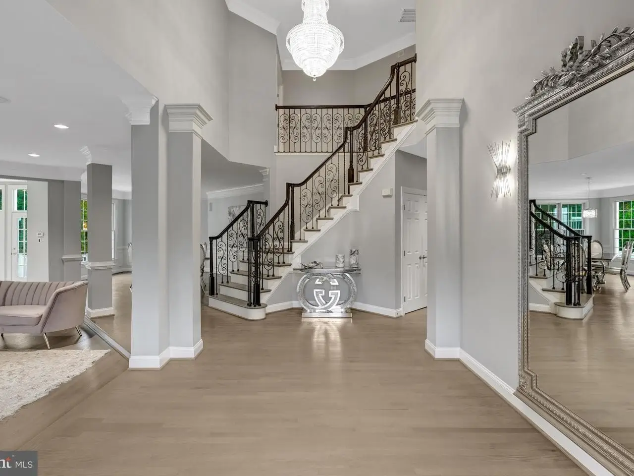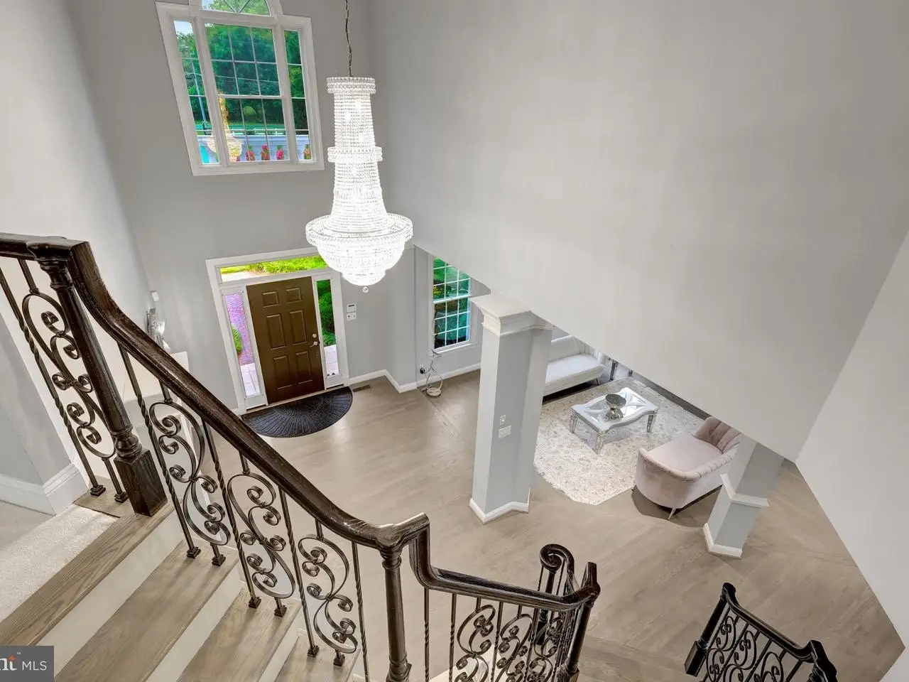 Two-story foyer with wrought-iron staircase