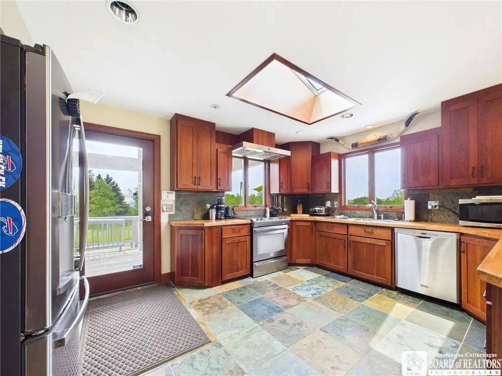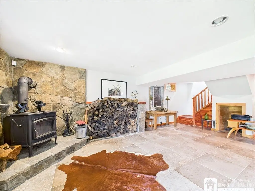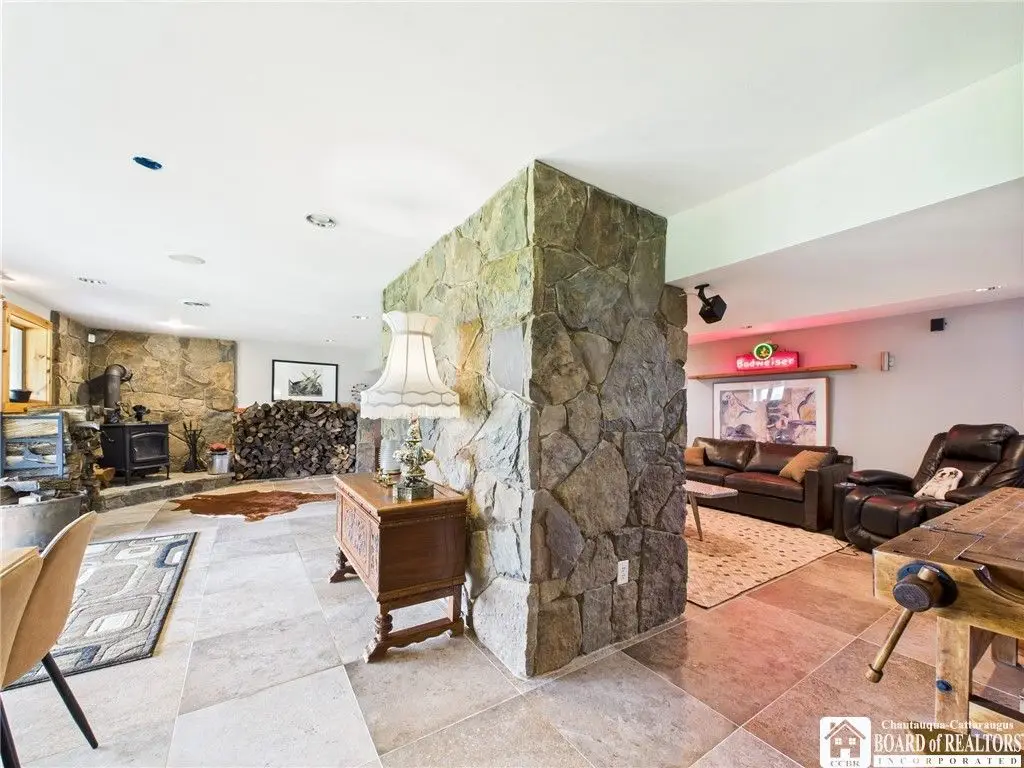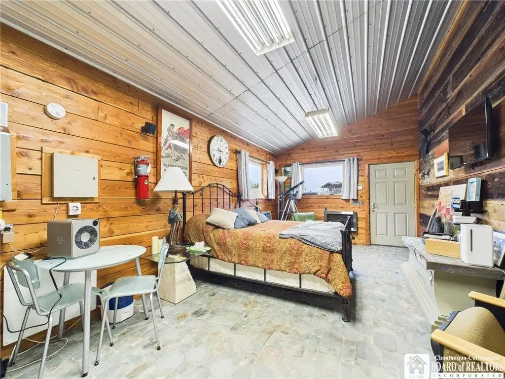 Discover a rare gem just minutes from Ellicottville - 77 acres of private, picturesque country living with unbeatable outdoor access. This one-of-a-kind ranch-style property shares its border with the 832-acre Raecher Hill State Forest, offering limitless possibilities for hiking, wildlife watching, and exploring right from your backyard. The main home features two spacious bedrooms and two full bathrooms, with grand cathedral ceilings, hardwood and natural stone floors, a beautifully updated bathroom, and breathtaking views of Holiday Valley that stretch for miles. The basement features heated electric floors, a wood stove, another full bath and even a sauna. With approximately 2,200 square feet of living space - not including the barn or guest apartment - there's room to relax, entertain, and enjoy life in every season. It is about ten minutes from Holiday Valley and bustling downtown Ellicottville. Two private pond enhances the serene setting, creating the perfect spot to unwind. The barn-style garage is a standout feature, offering an upstairs private bar room for entertaining, and a fully appointed garage apartment with heated floors, a private bathroom, and its own cozy living space - ideal for guests or short-term rentals. A second outbuilding provides ample space for storing a tractor, outdoor equipment, or anything else you can dream up. As a bonus, the property also includes a well-maintained camper, perfect for temporary stays, visiting guests, or even your secluded weekend hideaway. The camper has solar panels and water to make it even more convenient. Whether you're seeking a private retreat, a base for adventure, or a flexible property with room to grow, this ranch delivers it all.