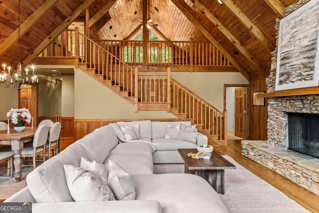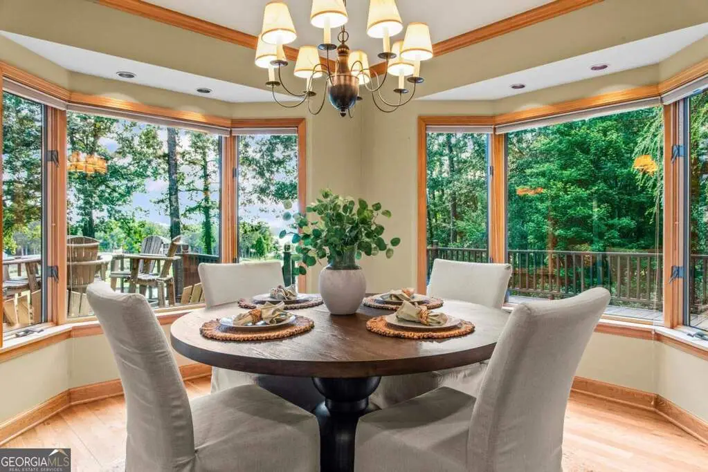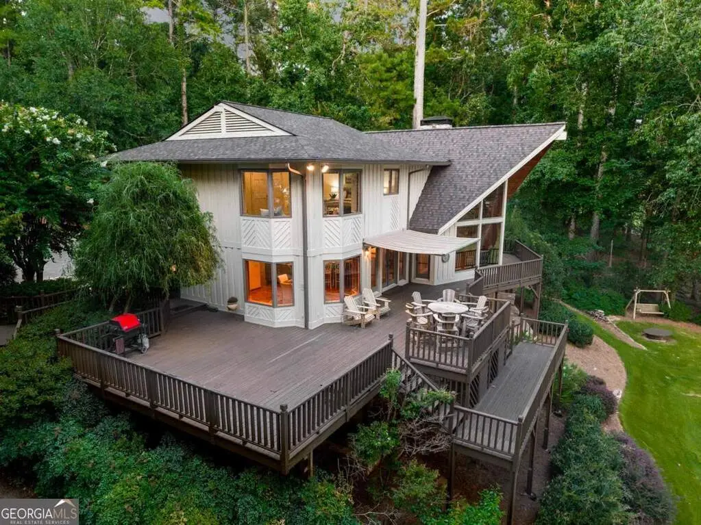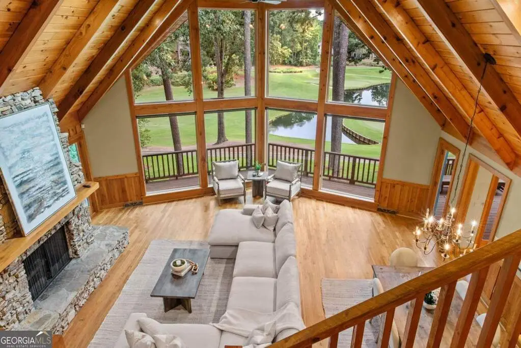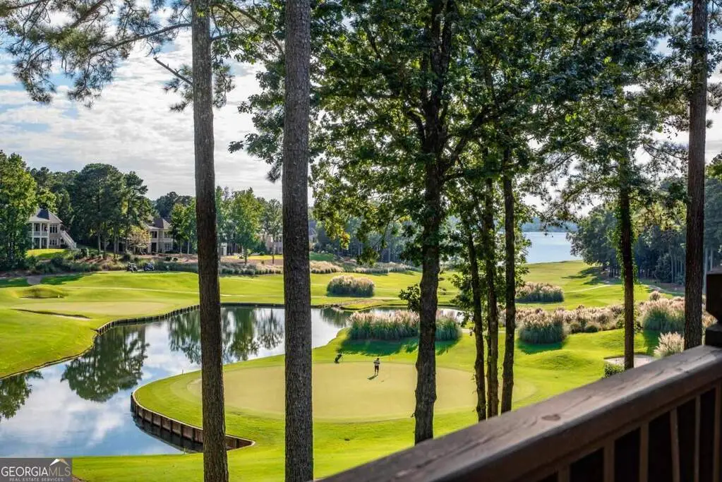 This beautifully maintained golf course home offers sweeping views of holes 2, 3 & 4 of The Landing course, a pond view, and looking down the fairway to the stunning water of Lake Oconee-views from this home are so exquisite, they have been featured in Reynolds Magazine Advertisements over the years. Designed with large, light-filled spaces and walls of windows, the open-concept layout brings the outdoors in. The main level features two bedrooms, a gourmet kitchen, and expansive living and dining areas perfect for entertaining. Enjoy peaceful mornings and breathtaking sunsets from the large multi-level wraparound deck. Ideally situated in The Landing of Reynolds Lake Oconee with access to world-class amenities, golf, lake life, and more. This is a rare opportunity to own one of the best view properties in the community. Seller makes a Club membership available for Buyer to explore how they can enjoy golf, sporting grounds, tennis, pickleball, fitness, recreational, and culinary amenities of a world-class private club.