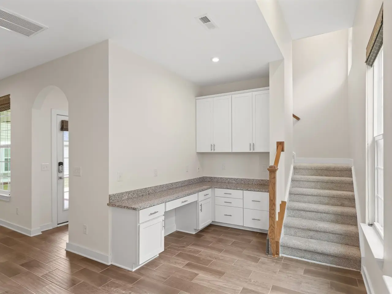 Prime location in the coveted Hollingsworth Park neighborhood! 303 Verlin invites you in with its welcoming front porch, a perfect spot to relax with morning coffee or greet neighbors passing by. Inside, wood-tone ceramic floors and a fresh, neutral palette create a seamless flow through the main living spaces, setting a refined yet comfortable tone. The foyer makes a graceful first impression, flanked by a sophisticated formal dining room and a spacious private office adorned with French doors. With a full bathroom nearby, this versatile space easily doubles as a guest suite. The heart of the home is the expansive great room, anchored by a striking wall of custom built-ins offering both function and beauty, and ready to frame your favorite artwork or accommodate a mounted television. The adjoining chef's kitchen is a dream, with gleaming granite countertops, a gas range, built-in oven and microwave, and abundant cabinetry with thoughtful details like a pull-out trash drawer. A charming built-in desk area provides the perfect command center, while a private staircase ascends to a spacious bonus suite or fifth bedroom. Complete with plush new carpet, a large walk-in closet, and a full bath, this retreat offers endless possibilities whether as a media room, private guest quarters, or creative studio. The main staircase, accented with rich wood treads, leads to the upper level where freshly painted walls and new luxury vinyl plank floors exude a crisp, modern elegance. The serene primary suite is a true sanctuary, featuring dual custom closets and a spa-inspired bath with a large walk-in shower and private water closet. A generously sized laundry room is conveniently located nearby, along with three additional bedrooms and a full bathroom to comfortably accommodate family or guests. Outside, unwind on the covered porch or enjoy the inviting backyard, offering plenty of space for play or entertaining. Just beyond the rear yard is a large common grassy space and access to a community garden. In Hollingsworth Park the lifestyle is unmatched?just steps from Legacy Park and the Swamp Rabbit Trail, and a leisurely stroll to Chestnut Coffee, Stella's Southern Brasserie, Takosushi, The YMCA, and the neighborhood pool (with transferable membership available). This home blends elegance, comfort, and walkable convenience in one truly exceptional package.