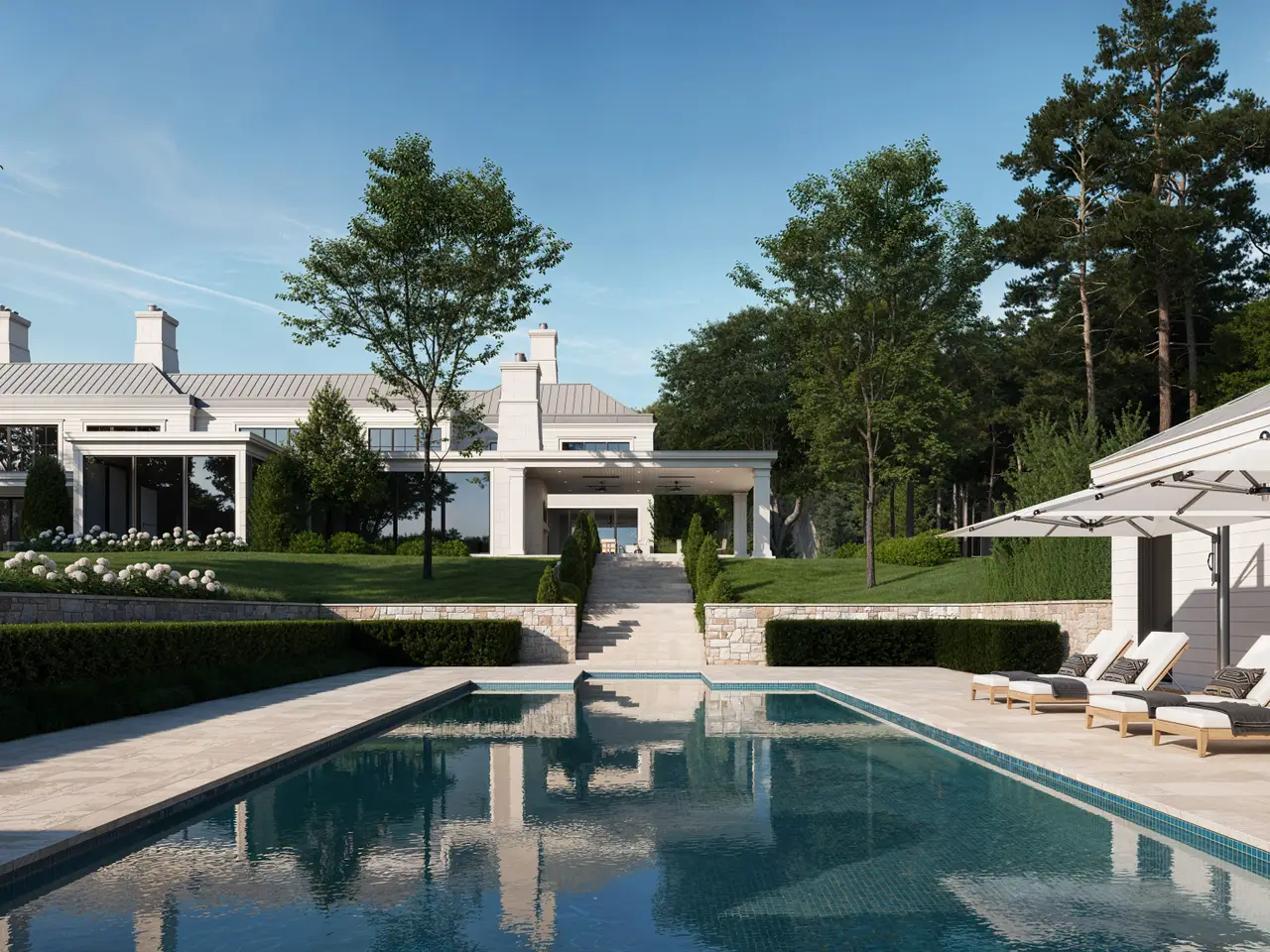 Pool house, pool, tennis court, and cabana included