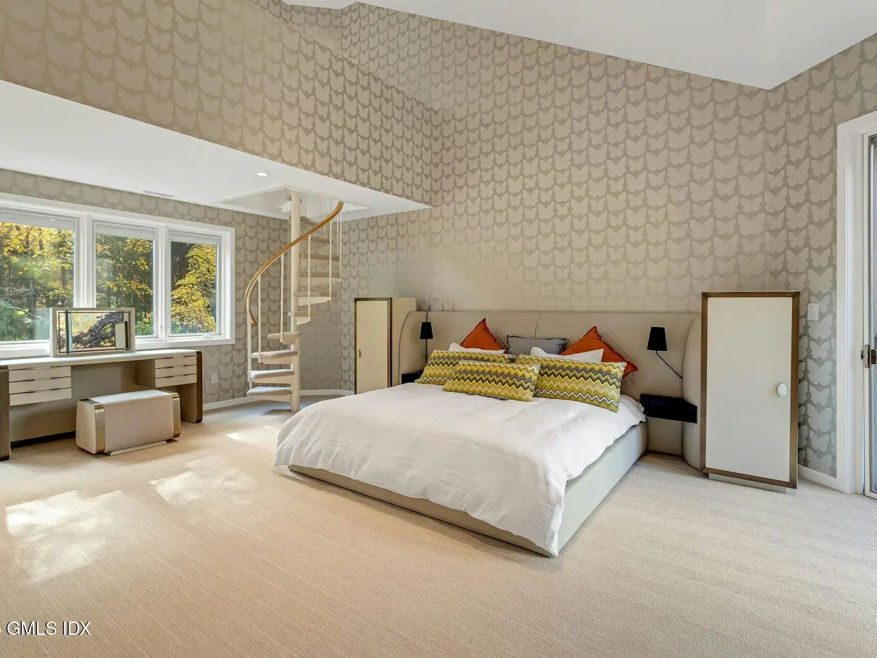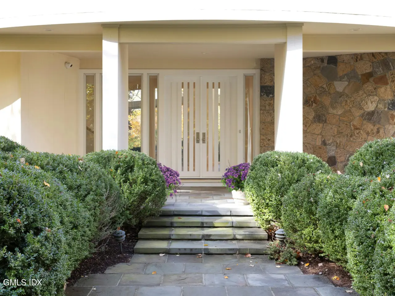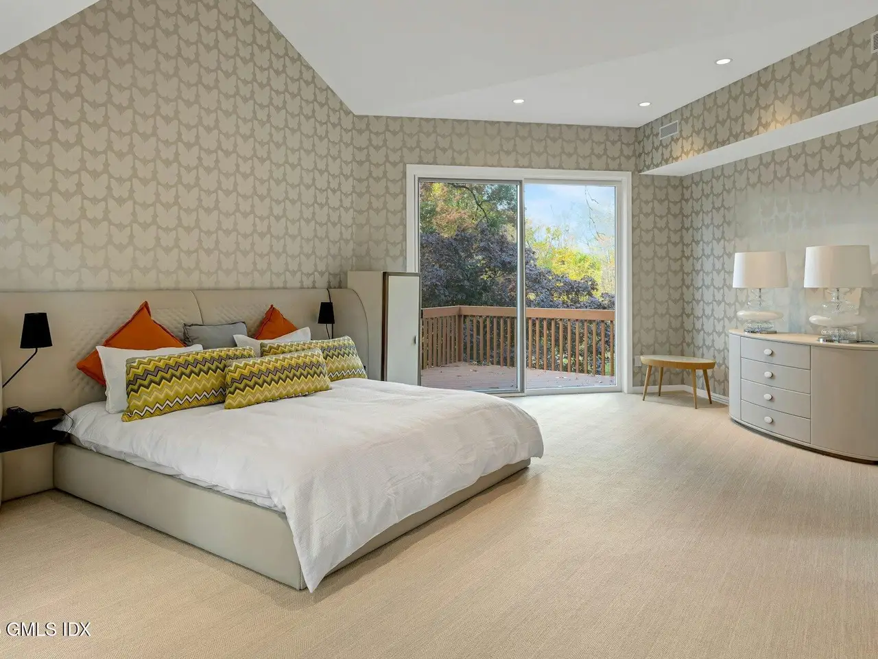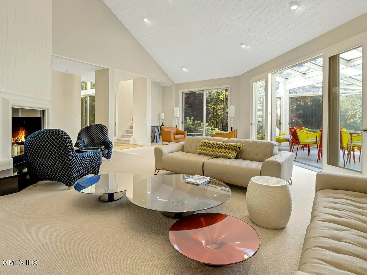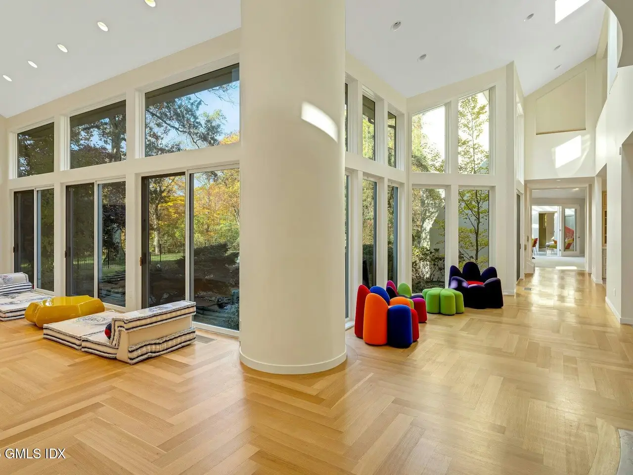 This exceptional contemporary home on a quiet cul-de-sac has been transformed with a complete meticulous custom renovation. The dramatic yet highly functional home is being offered fully furnished with Roche Bobois furniture in addition to Barovier & Toso Venetian light fixtures throughout the home. The beautiful parklike grounds encompass 4 acres including a tennis court, pool with spa and large yard area. The border to the north abuts the 300-acre Babcock Preserve with 7 miles of trails. The interior space extends to 7,700 sq.ft. on 3 levels with 6 ensuite bedrooms all with custom walk-in closets. The luxurious primary suite is highlighted by a limestone fireplace, an office loft, private balcony and glistening bathroom featuring Blue Macuba marble. Truly a peaceful and private oasis.