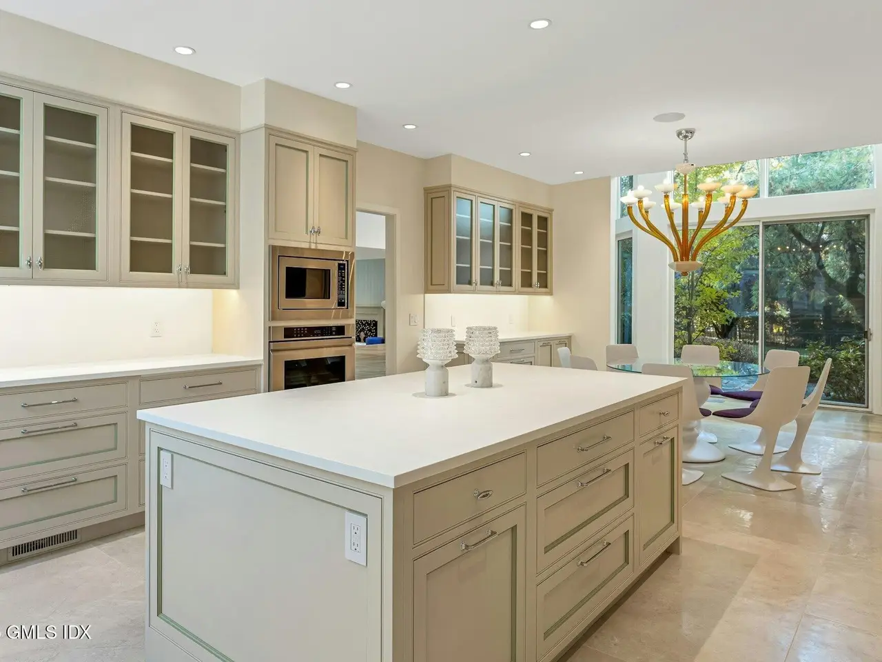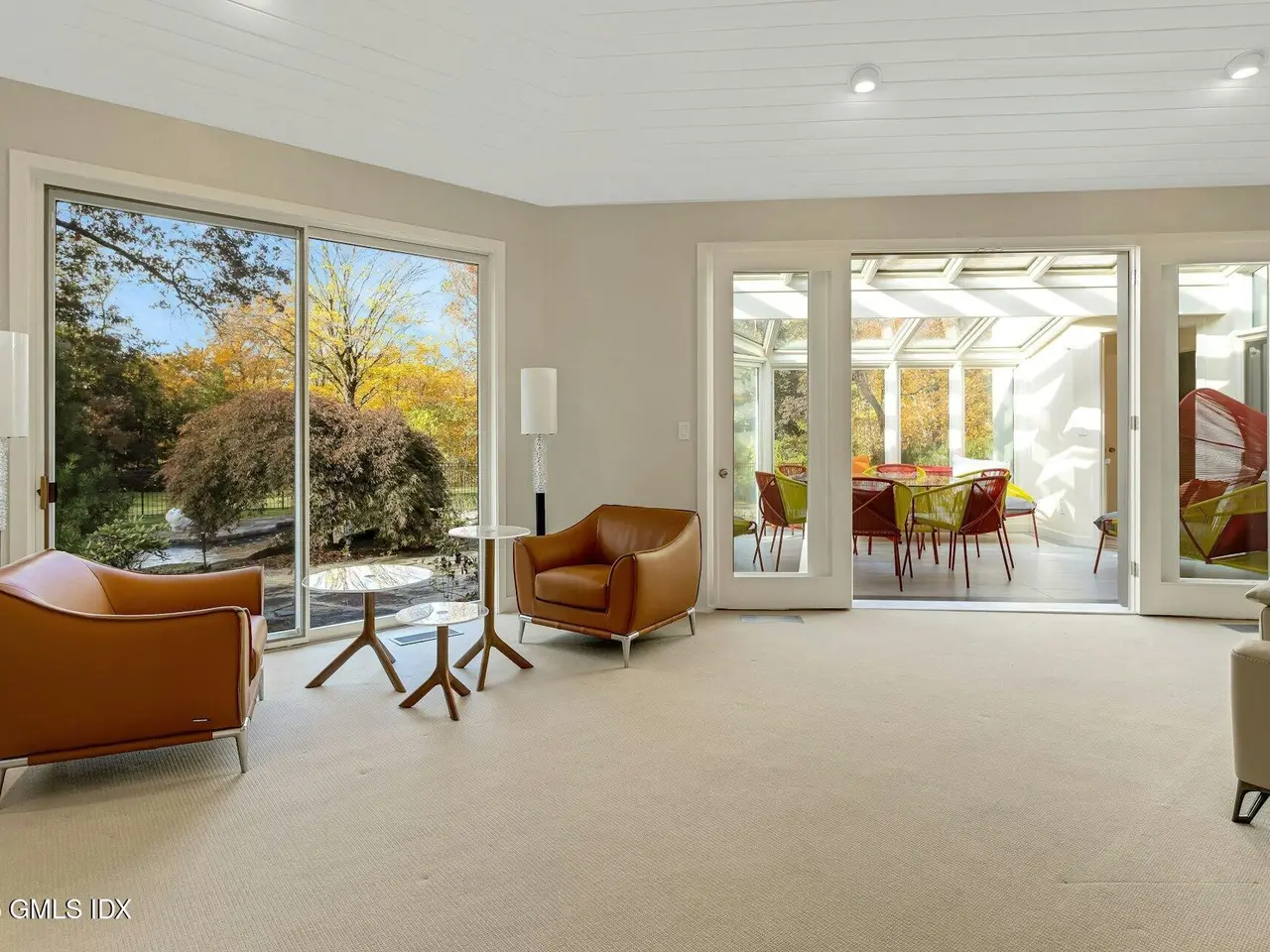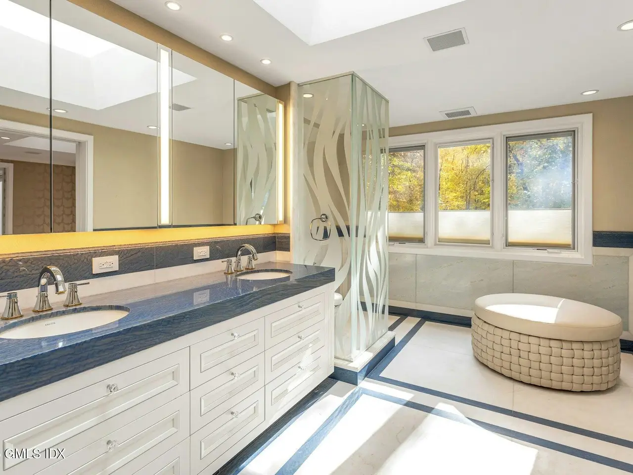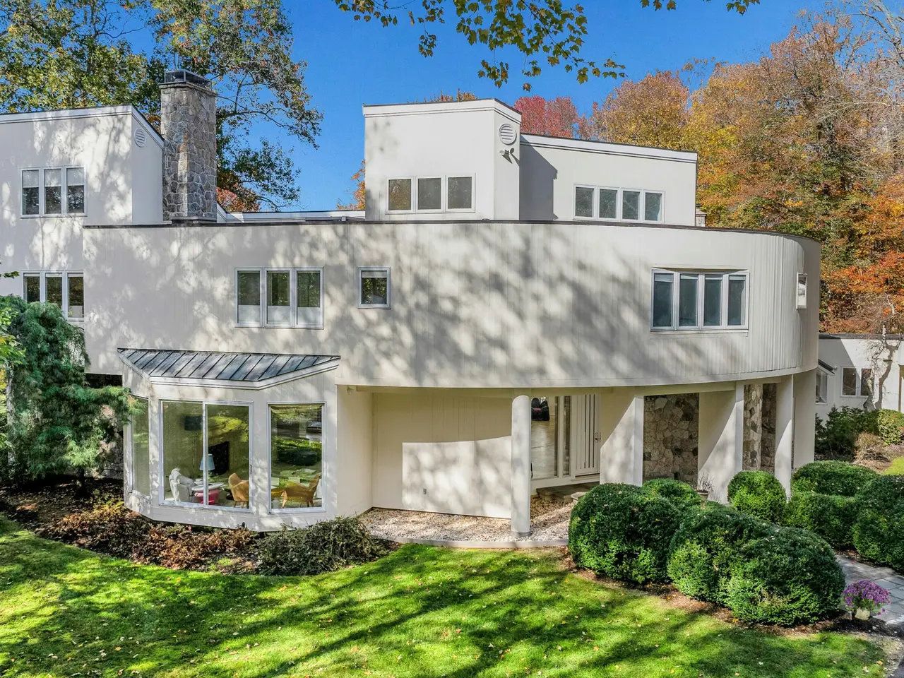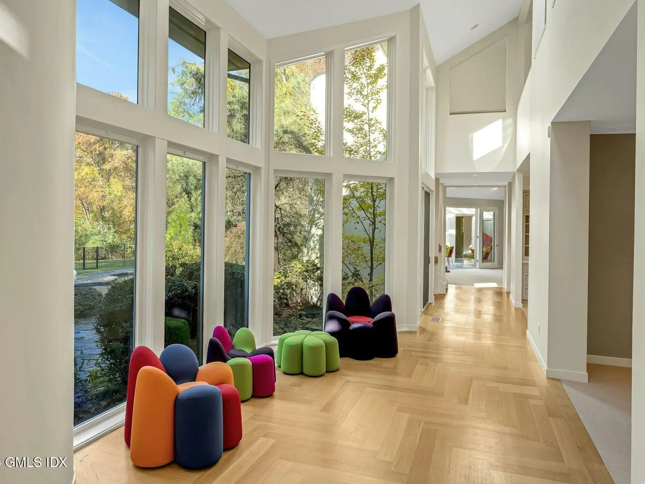 This exceptional contemporary home on a quiet cul-de-sac has been transformed with a complete meticulous custom renovation. The dramatic yet highly functional home is being offered fully furnished with Roche Bobois furniture in addition to Barovier & Toso Venetian light fixtures throughout the home. The beautiful parklike grounds encompass 4 acres including a tennis court, pool with spa and large yard area. The border to the north abuts the 300-acre Babcock Preserve with 7 miles of trails. The interior space extends to 7,700 sq.ft. on 3 levels with 6 ensuite bedrooms all with custom walk-in closets. The luxurious primary suite is highlighted by a limestone fireplace, an office loft, private balcony and glistening bathroom featuring Blue Macuba marble. Truly a peaceful and private oasis.