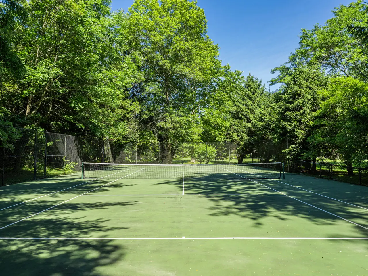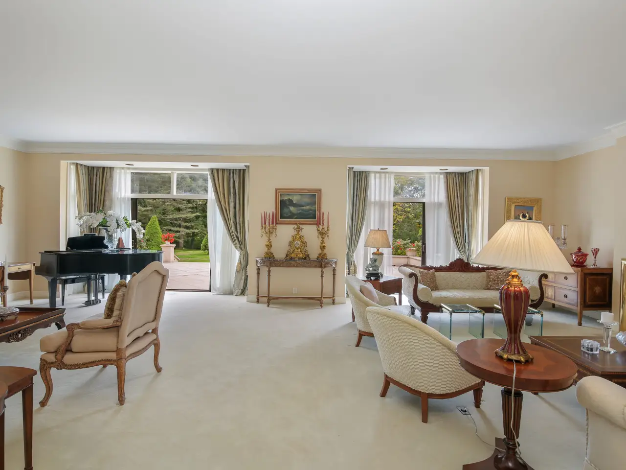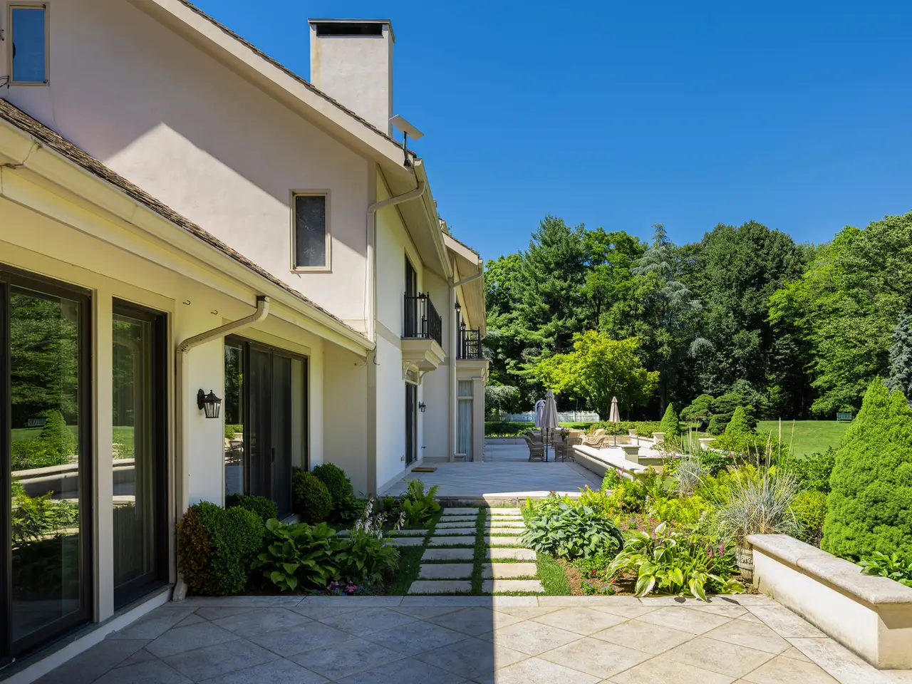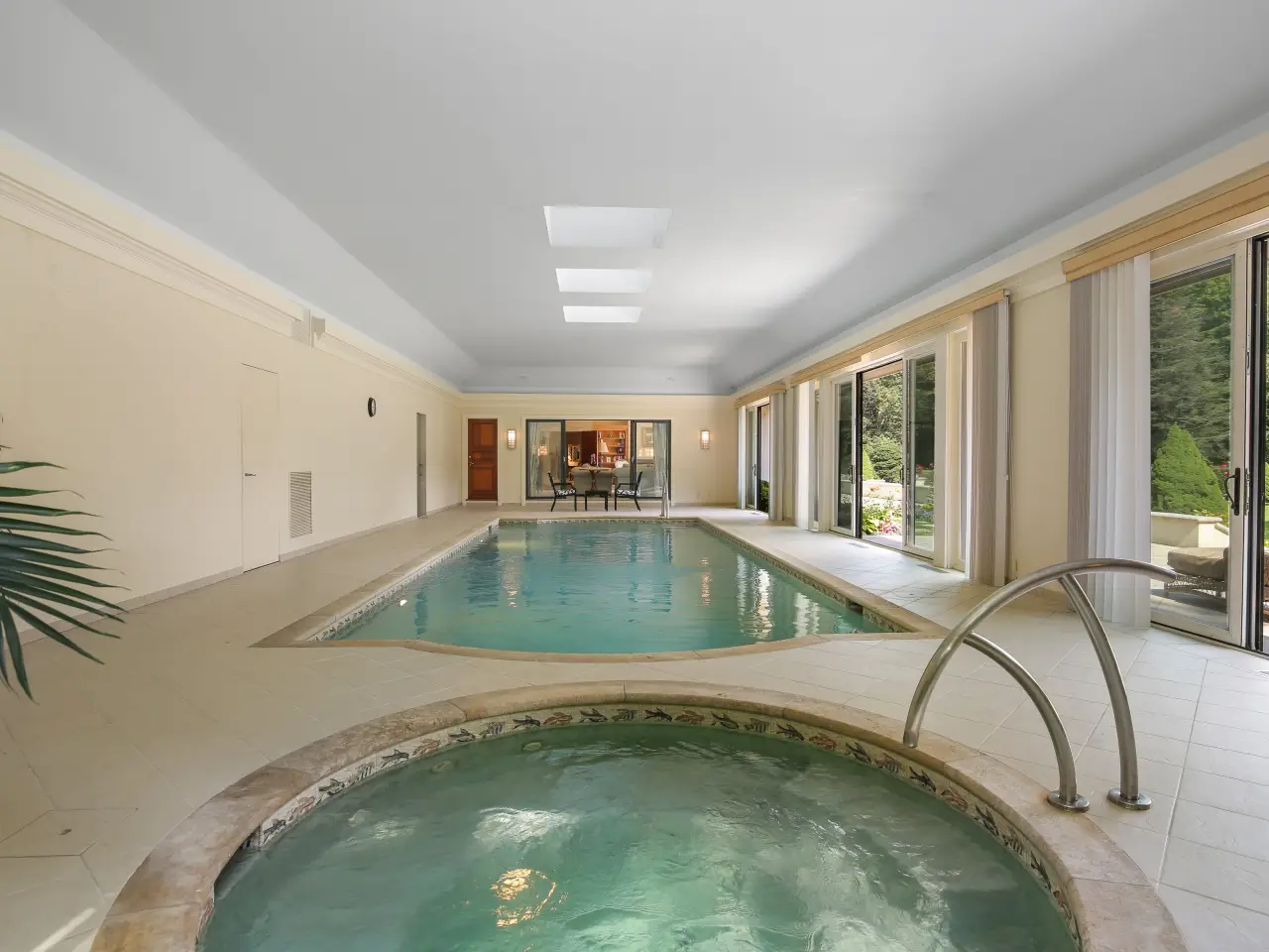 Eight private, gated acres showcase a sprawling back-country home with stone terraces, secluded backyard, fountain and resort-style amenities including tennis court, indoor pool, spa, steam room and separate office. Thoughtful floor plan accommodates both grand scale entertaining as well as comfortable everyday living with elegant formal rooms, fireplaces in living, family rooms and library; gourmet and catering kitchens. Twelve bedrooms provide plenty of sleeping options with two main floor guest suites, second floor primary suite with fireplace and separate two bedroom suite with sitting room over four-car garage. Lower level reveals tasting room/wine cellar; media room with bar, gym and half bath. Located just minutes from town and schools with views of Rockwood Lake and across from Babcock Preserve.