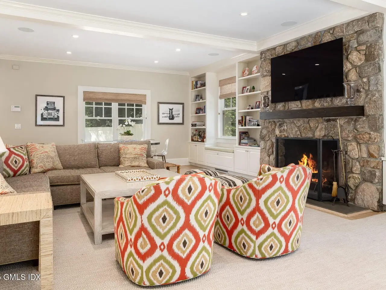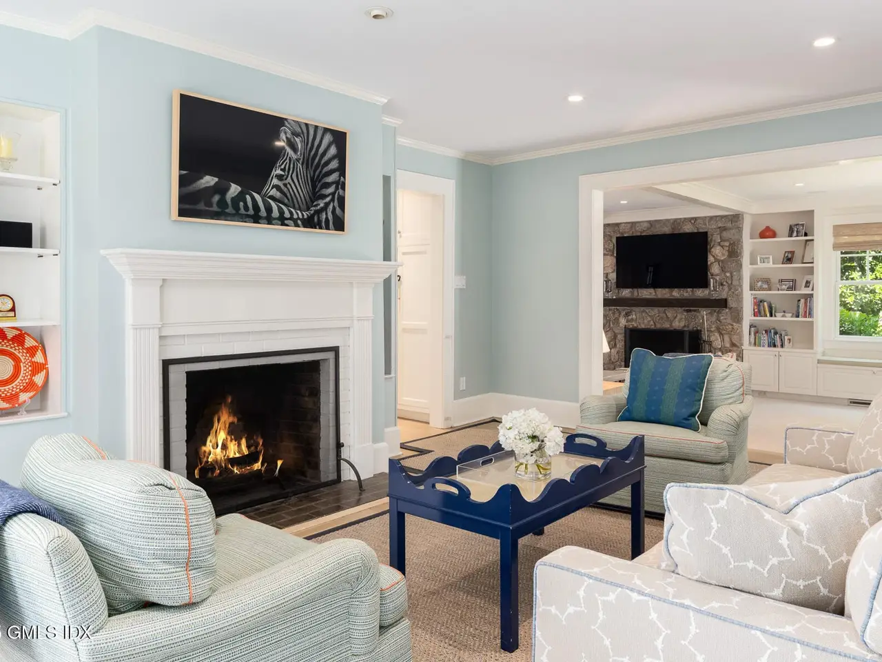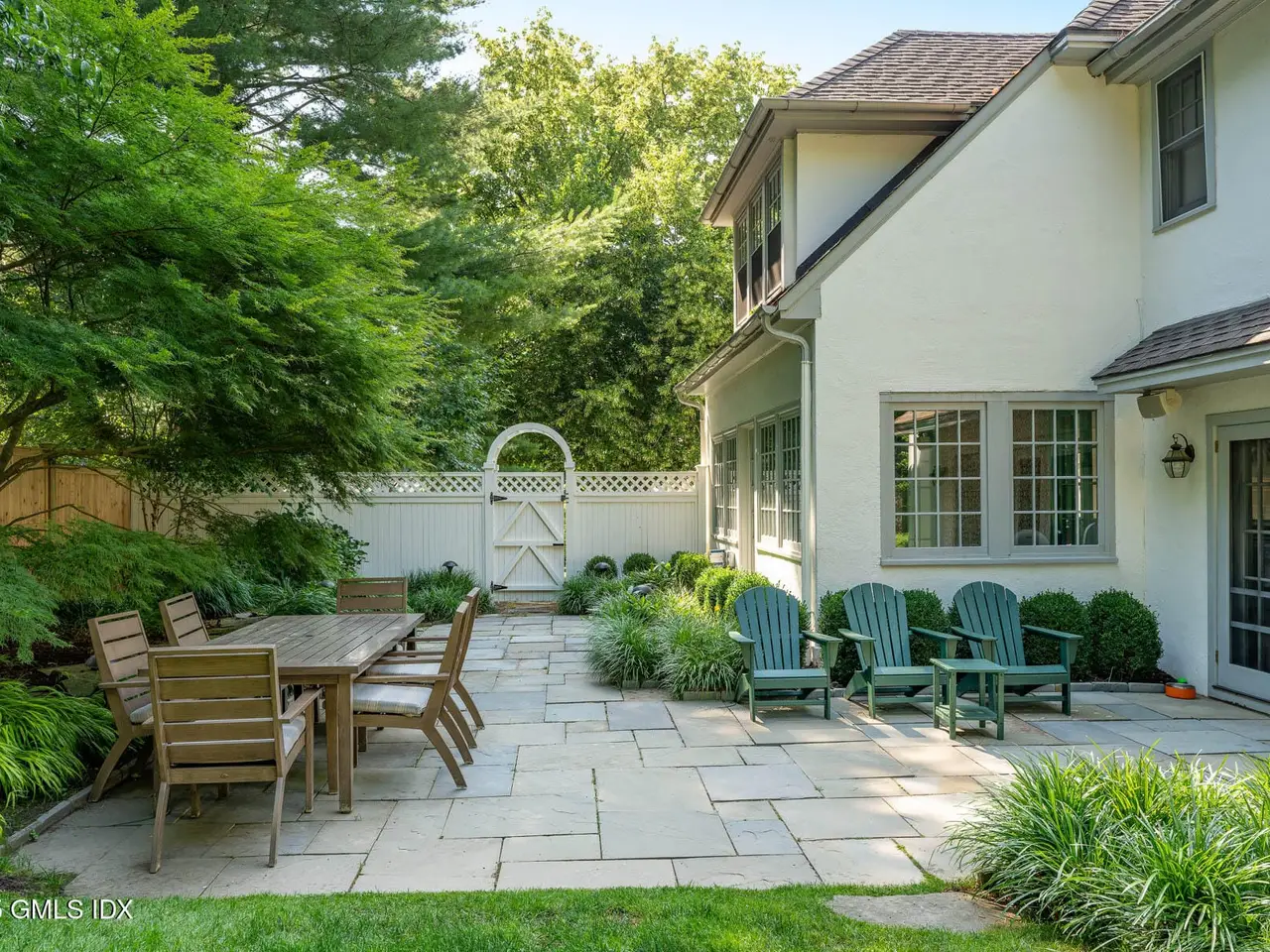 Perfectly positioned between conservation land and one of Greenwich's most prestigious roads, this five-bedroom home combines exceptional convenience with refined privacy. A tree-lined sidewalk provides direct access to downtown, while the property offers a serene, retreat-like setting. French doors open to a spacious terrace with outdoor lighting and a fully fenced yard, adjacent to an oversized two-car garage with bonus space above. The elegant family room showcases a grand stone fireplace and views of the manicured lawn, and don't miss the lower level complete with a playroom, laundry, and wine cellar.