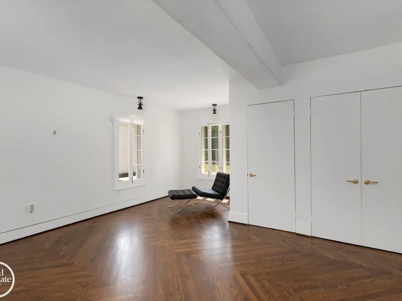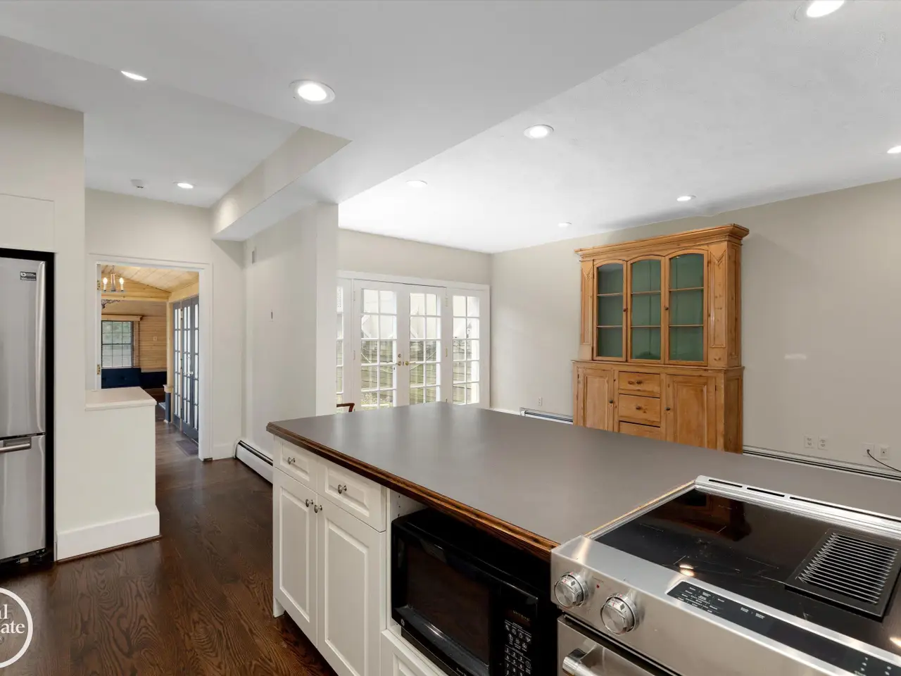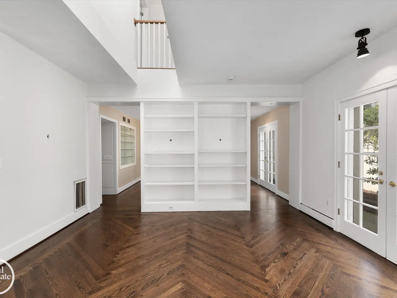 French doors to walled garden oasis Bluestone patio from sunroom/den