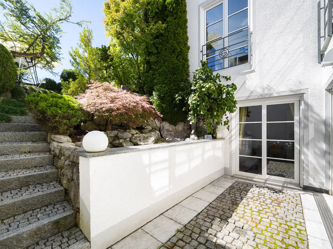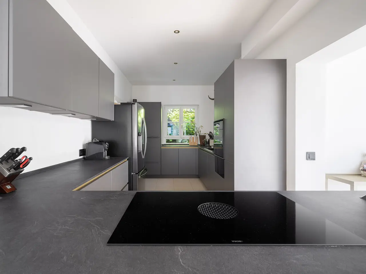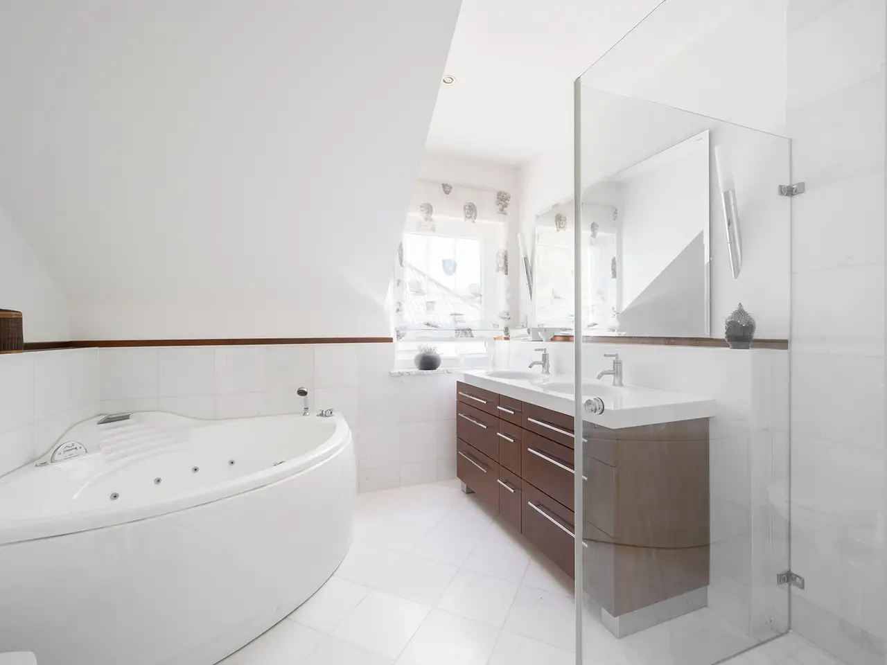 Welcome to your new home! A very well-maintained detached house built in 2002 that combines modern living in a quiet location with high-quality furnishings. The living space of approx. 257 m² is distributed over a well thought-out room concept that allows for many living ideas and offers a high level of comfort. The house is situated on a plot of approx. 628 m² and impresses with maximum privacy. Thanks to the secluded garden area and the well-tended south-facing garden, you can relax here without disturbance and enjoy absolute seclusion. The detached house, completed in 2002, impresses with its high-quality fittings and is in a very well-kept condition. As soon as you enter, the spacious hallway conveys an inviting feeling of living. The first floor is characterized by the spacious living/dining area, which receives plenty of natural light thanks to large windows and is equipped with a fireplace. The fireplace creates a cozy atmosphere in the colder months of the year. There is direct access to the spacious south-facing terrace with awning, which is ideal for socializing outdoors. The stylish, newly designed kitchen is equipped with high-quality BORA built-in appliances and meets the highest standards of functionality. The open-plan design makes this area a meeting place for family and guests. An additional room is currently used as an office and is seamlessly connected to the kitchen and living/dining area. From here you have access to the covered outdoor area on the north side. A guest WC and two checkrooms are also available on the first floor. The upper floor currently has a bedroom, a spacious bathroom with bathtub and shower, a bright and friendly living/dining area and an open kitchen. A use with two or three bedrooms and/or one or two bathrooms is also conceivable and possible - so there are a variety of possible uses. The artium in the basement also provides additional, fully usable living space. Two bedrooms with floor-to-ceiling windows as well as a bathroom and guest WC are available here. There is also an individually usable hobby room. You will also find plenty of storage space and the heating and laundry cellar. The successful room layout offers every generation enough space to retreat and develop. Further features include modern central heating, an alarm system and a spacious double garage. The well-tended south-facing garden was laid out according to Feng Shui and creates a natural living atmosphere with mature trees and plenty of space. The use of the two terraces also opens up numerous possibilities, for example for barbecues or quiet hours in the countryside. The quiet location makes this house a retreat from everyday life, without having to forego good connections to infrastructure and local amenities. The neighborhood is characterized by detached houses in a mature environment. Here you benefit from a familiar, friendly atmosphere. This detached house not only impresses with its size and location, but also with its high-quality and well thought-out fittings. See for yourself and arrange a viewing appointment to get to know your future home in person. This offer provides numerous prospects for couples, families and all those who value a well-kept environment with a wide range of possible uses.