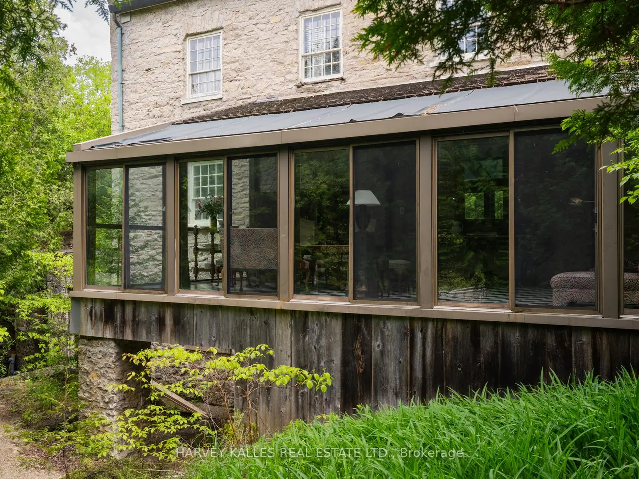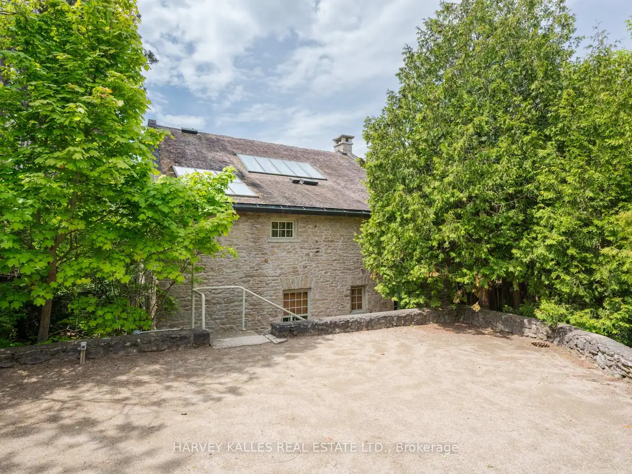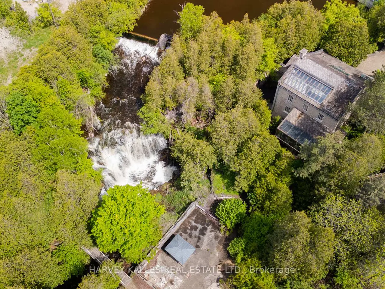 Solidly built with enduring stone walls, 'The Mill' stands as a testament to craftsmanship by acclaimed architect Mandel Sprachman. Tucked just beyond the charm of Main Street and yet enveloped in its own timeless tranquility, this extraordinary residence feels lifted from the pages of a French storybook - a serene oasis that seems to exist outside of time. Set on over 1.8 acres and bordered by a private waterfall and the meandering Eramosa River, the property invites exploration and reminds you of the quiet wonder of nature. This is not just a house, but a way of life. The interior balances warmth and function, with 4 bedrooms and 6 bathrooms. The top-floor primary suite offers a secluded retreat with treetop views and luxurious proportions. At the heart of the home, an expansive great room with exposed wood beams and a bespoke fireplace that feels both grand and intimate. The adjacent kitchen - with walk-in pantry and garden views - opens to a sun-washed stone patio, where morning coffee or evening wine feels like a ritual. A glass-wrapped dining room draws the outdoors in, offering the kind of light-drenched calm found in the villas of Luberon. Downstairs, the lower level walk-out echoes the homes stonework roots, while outside, an inviting inground pool and a picturesque barn add a sense of rustic elegance and possibility. From the sunroom or the poolside terrace, the waterfall glimmers through the trees - a gentle, ever-present soundtrack. It's easy to forget the world here, though Rockwoods cafes and boutiques are just steps away, and downtown Guelph is a mere 15-minute drive. The home is fully serviced for water and utilities. 243 Main Street is not just a home - it is a lifestyle. A rare and enchanting retreat for those drawn to stillness, beauty, and a life well-lived.