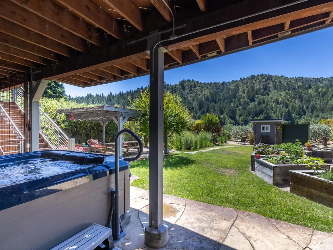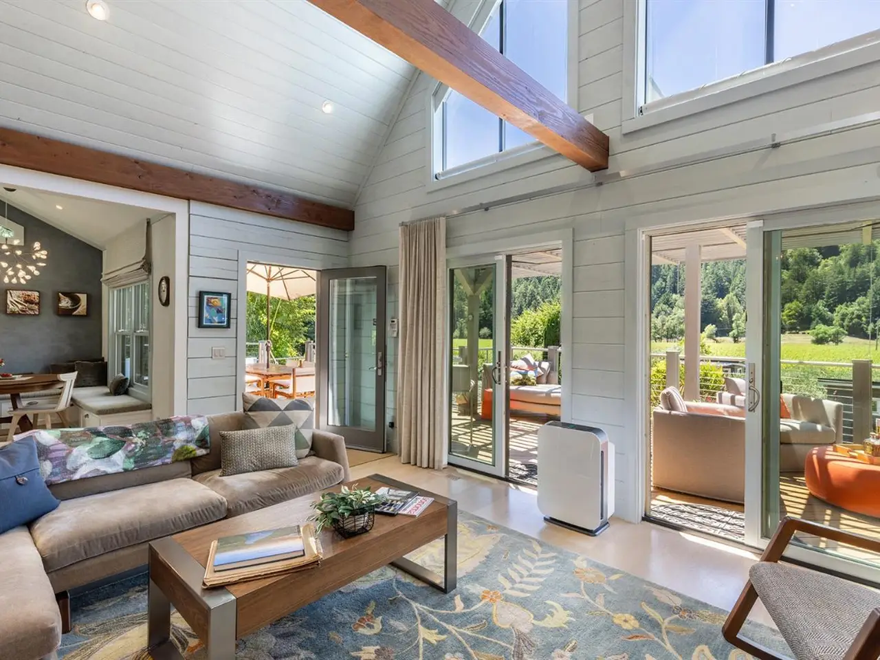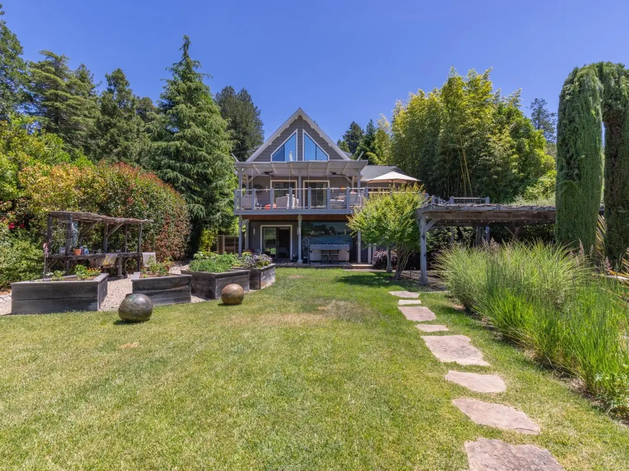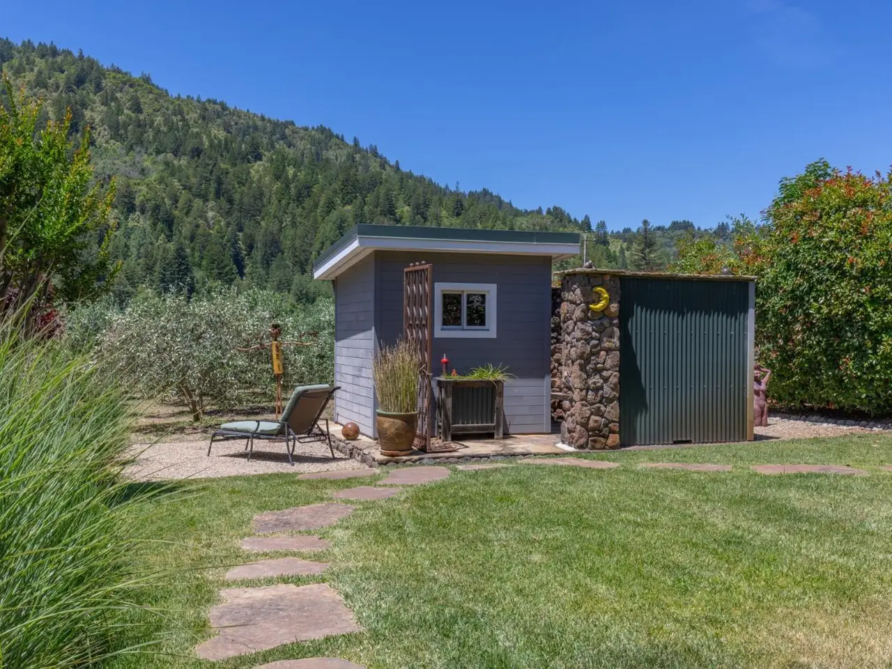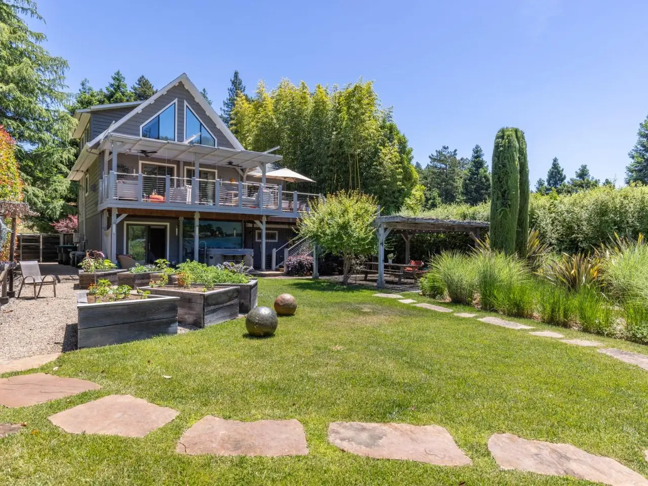 Escape to your own private oasis in this exquisite luxury property, where priceless views of the Korbel vineyard and the majestic mountains of the Russian River Valley set a breathtaking backdrop. Furnished with items meticulously curated by the acclaimed Zeitgeist Sonoma, every detail is expertly coordinated. Custom-built features and high-end finishes adorn every corner, making this home truly unique. The second-floor main level is ideal for entertaining friends or unwinding on the expansive covered deck while taking in the beauty that surrounds you. On the ground floor, a versatile fourth bedroom could be used as a game room or second living space, complete with a built-in Murphy bed and direct garden and spa access. Upstairs, the primary suite boasts a resort-like bath and walk-in closet. Outside, explore an expansive garden featuring artfully arranged garden beds, lush lawn, generous shaded patio, a firepit, craft studio, sauna with stone-walled shower, various fruit trees, and thriving olive orchard. From energy-efficient upgrades to advanced water filtration systems, no detail has been overlooked. Just a short walk from downtown Guerneville, yet nestled away from the hustle and bustle, this property offers a vacation-like setting you can cherish every day.