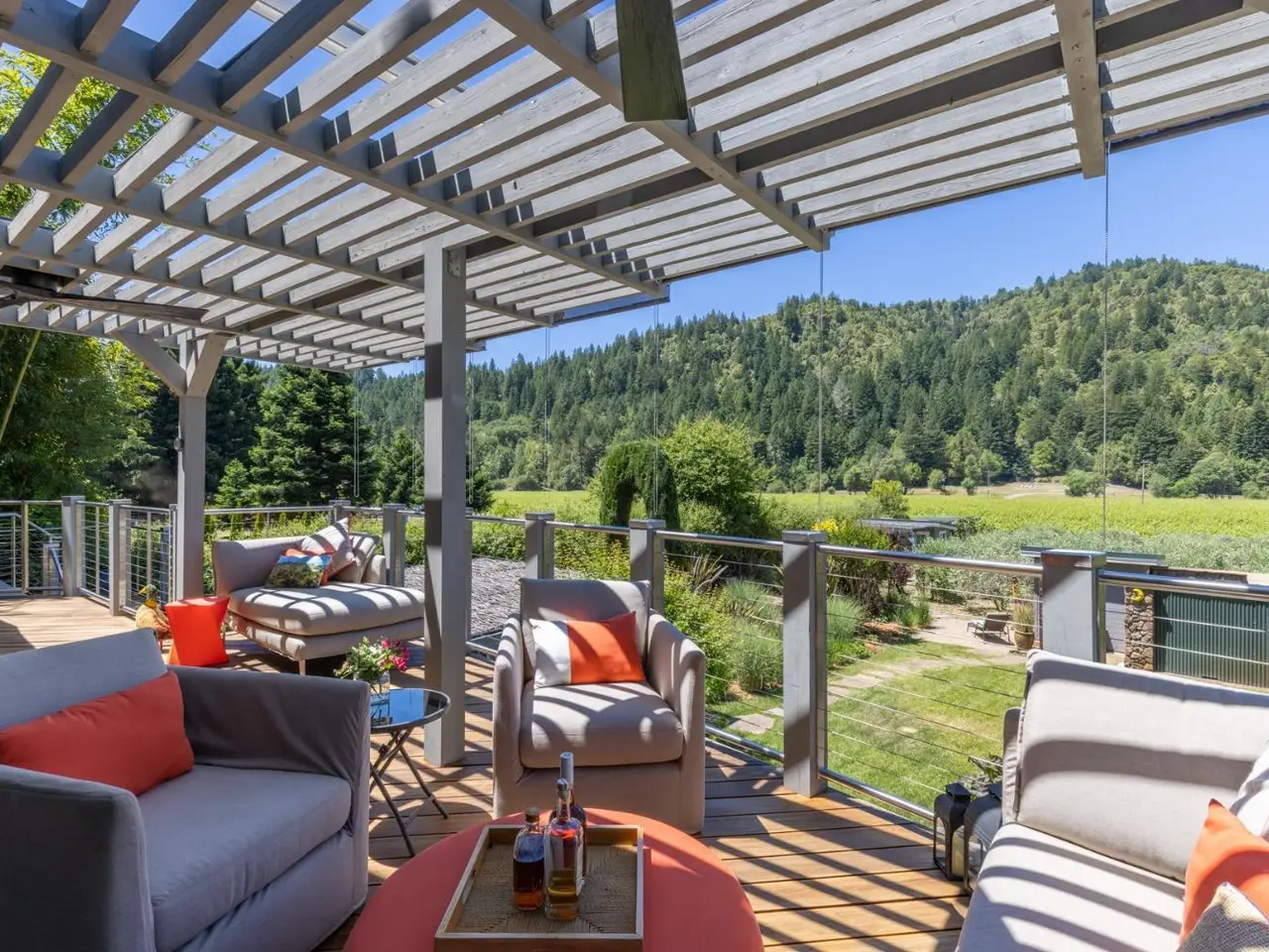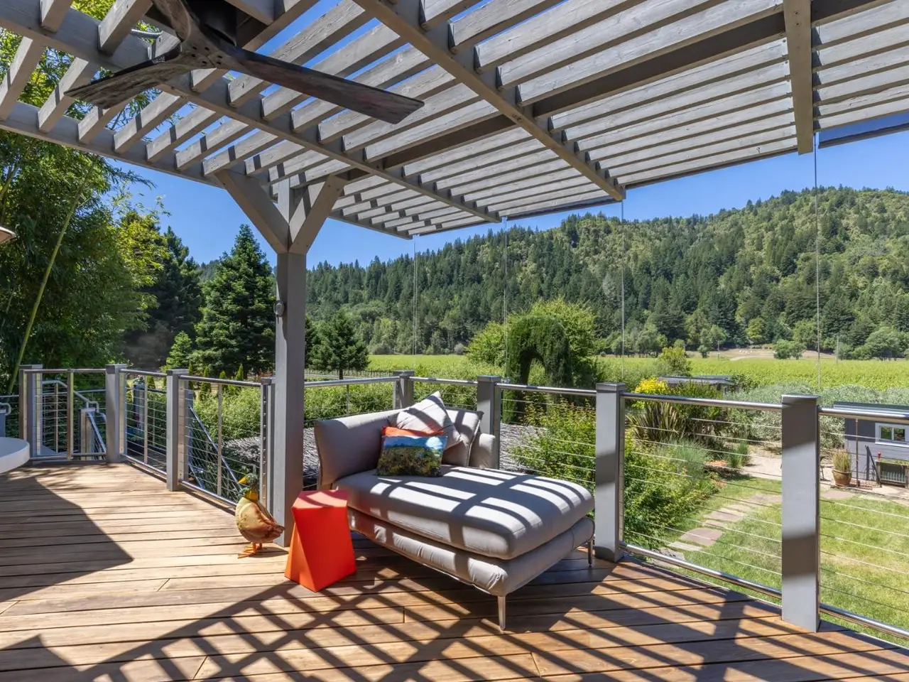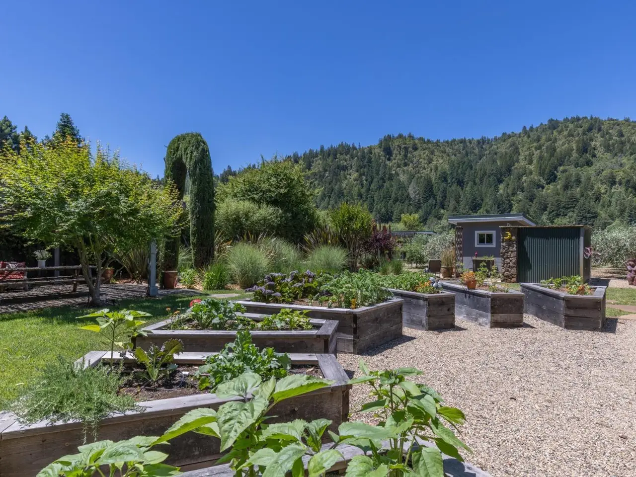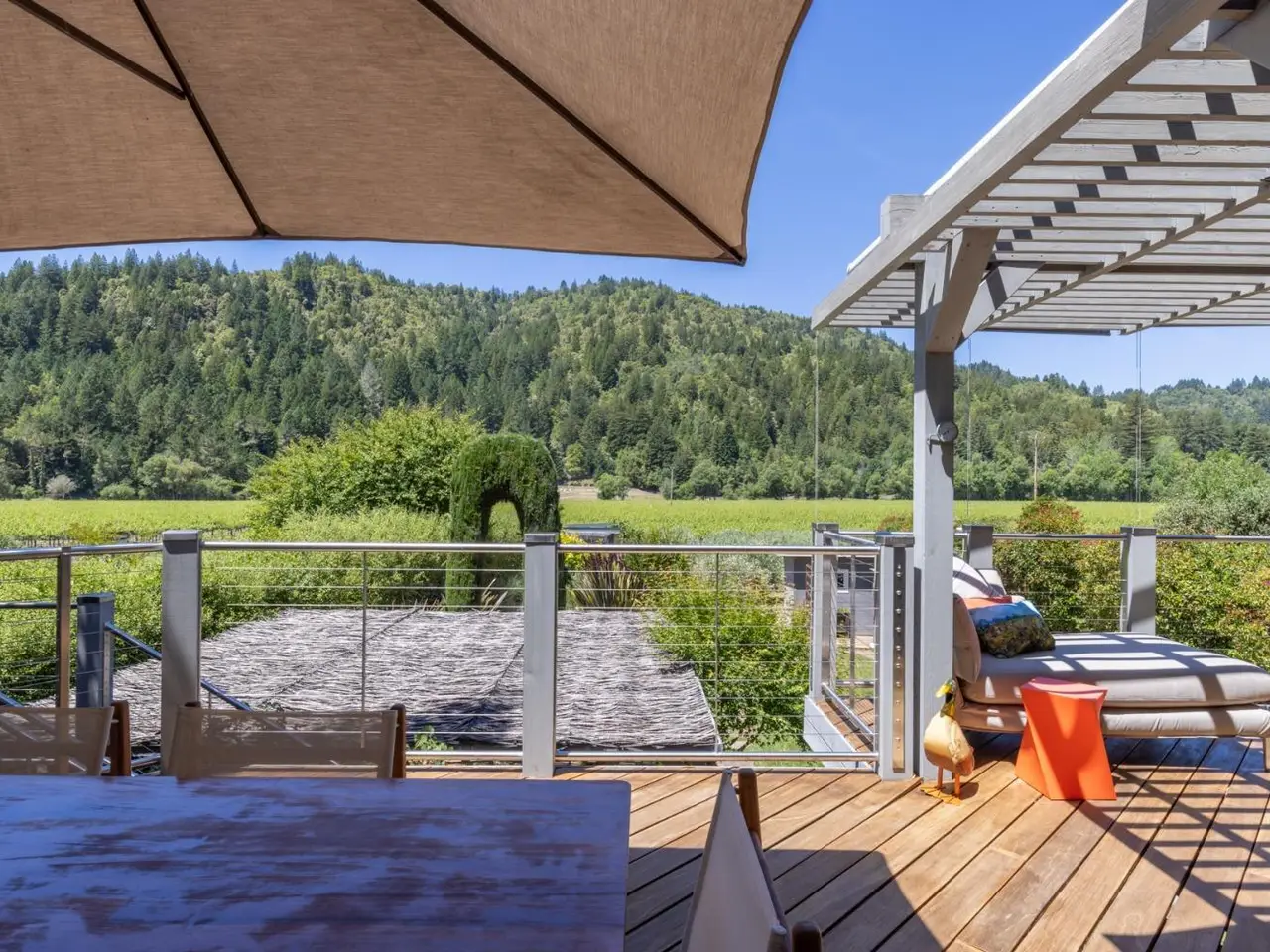 Escape to your own private oasis in this exquisite luxury property, where priceless views of the Korbel vineyard and the majestic mountains of the Russian River Valley set a breathtaking backdrop. Furnished with items meticulously curated by the acclaimed Zeitgeist Sonoma, every detail is expertly coordinated. Custom-built features and high-end finishes adorn every corner, making this home truly unique. The second-floor main level is ideal for entertaining friends or unwinding on the expansive covered deck while taking in the beauty that surrounds you. On the ground floor, a versatile fourth bedroom could be used as a game room or second living space, complete with a built-in Murphy bed and direct garden and spa access. Upstairs, the primary suite boasts a resort-like bath and walk-in closet. Outside, explore an expansive garden featuring artfully arranged garden beds, lush lawn, generous shaded patio, a firepit, craft studio, sauna with stone-walled shower, various fruit trees, and thriving olive orchard. From energy-efficient upgrades to advanced water filtration systems, no detail has been overlooked. Just a short walk from downtown Guerneville, yet nestled away from the hustle and bustle, this property offers a vacation-like setting you can cherish every day.