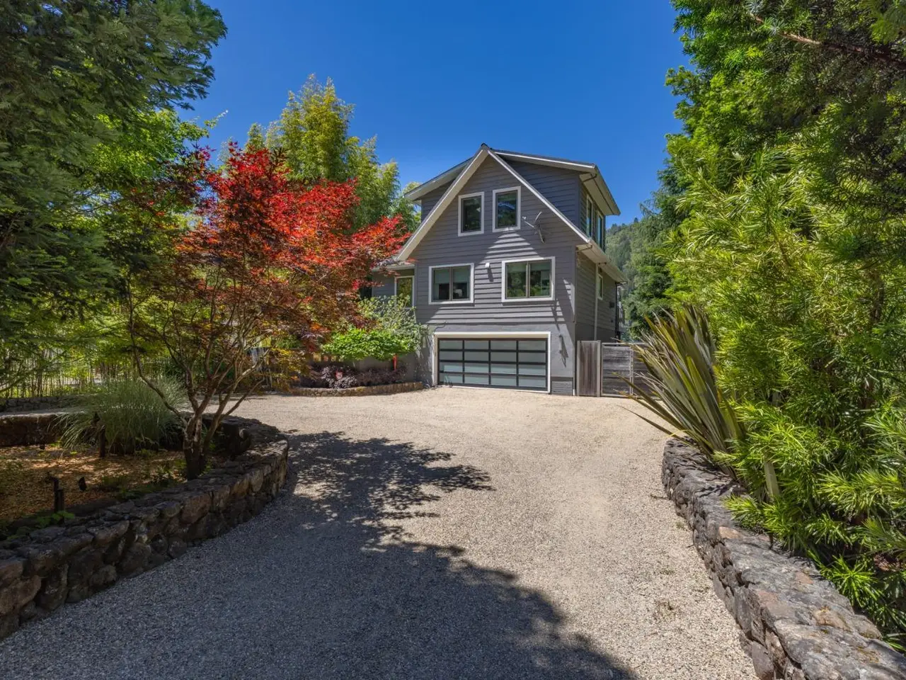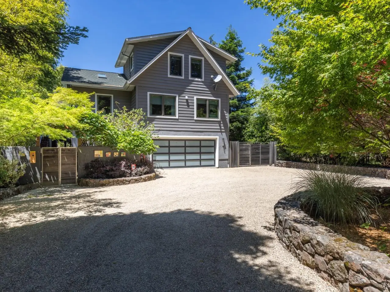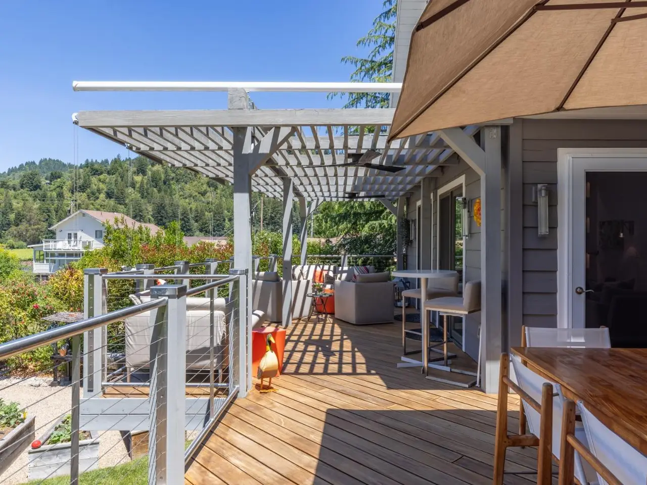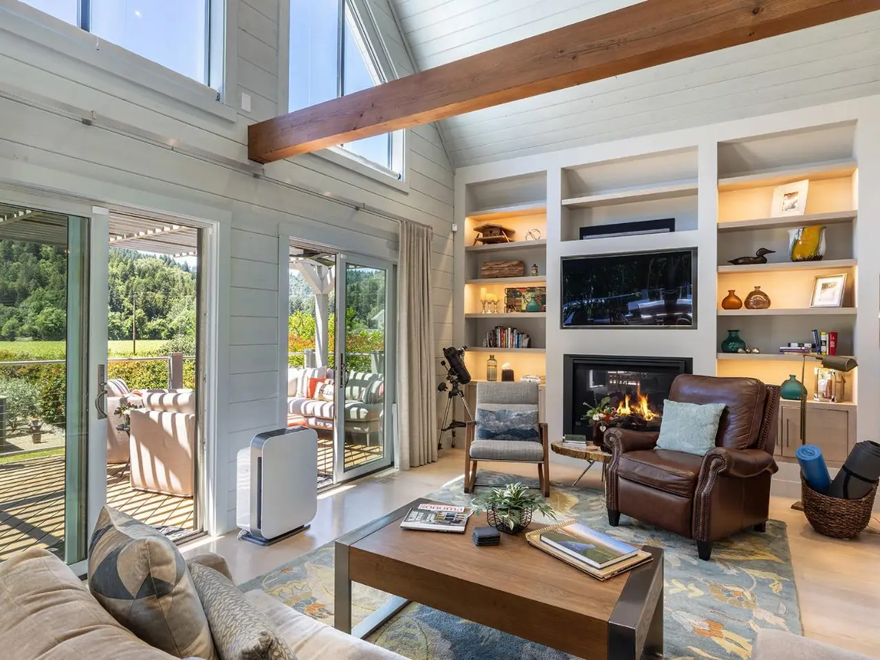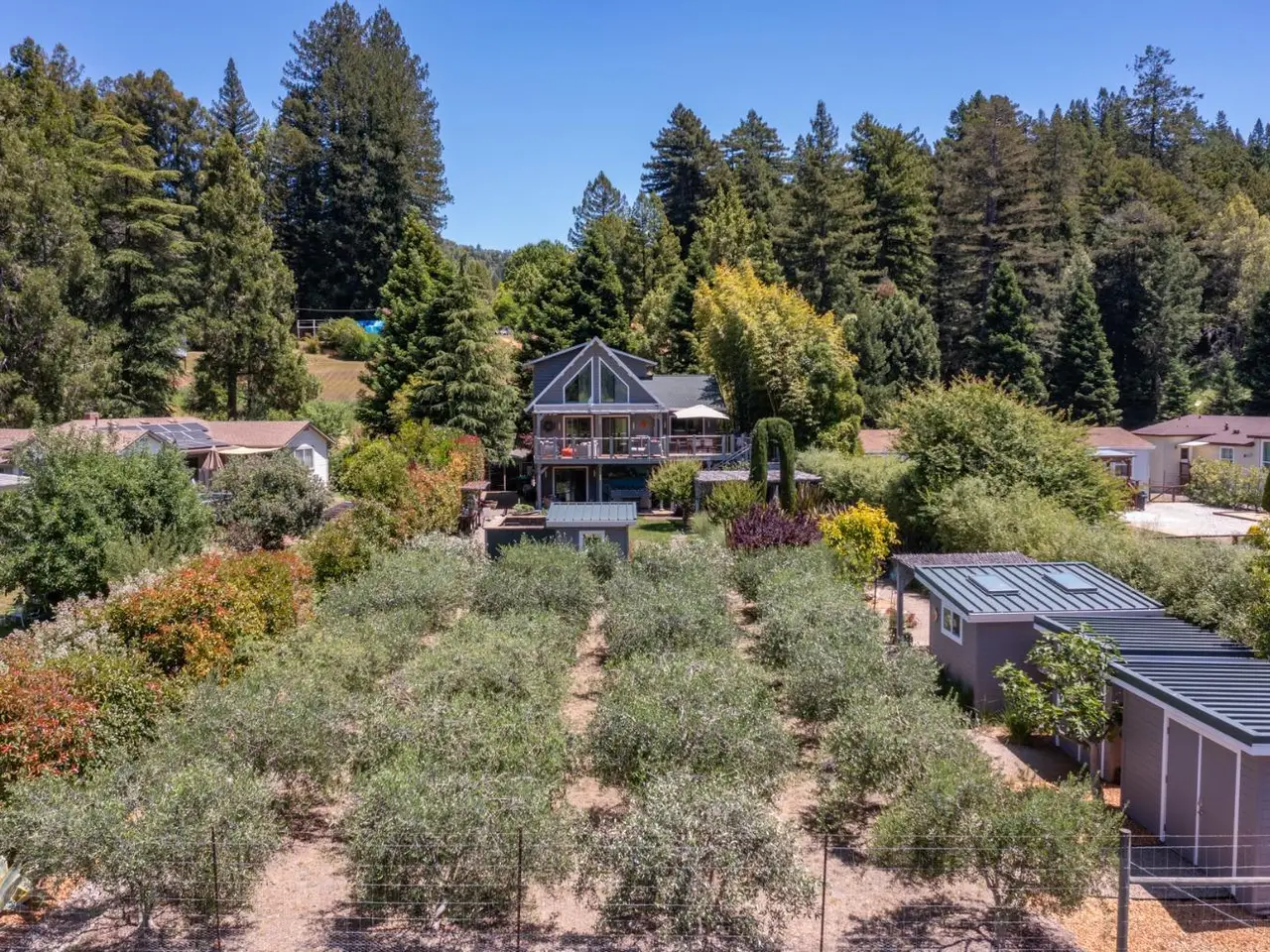 Escape to your own private oasis in this exquisite luxury property, where priceless views of the Korbel vineyard and the majestic mountains of the Russian River Valley set a breathtaking backdrop. Furnished with items meticulously curated by the acclaimed Zeitgeist Sonoma, every detail is expertly coordinated. Custom-built features and high-end finishes adorn every corner, making this home truly unique. The second-floor main level is ideal for entertaining friends or unwinding on the expansive covered deck while taking in the beauty that surrounds you. On the ground floor, a versatile fourth bedroom could be used as a game room or second living space, complete with a built-in Murphy bed and direct garden and spa access. Upstairs, the primary suite boasts a resort-like bath and walk-in closet. Outside, explore an expansive garden featuring artfully arranged garden beds, lush lawn, generous shaded patio, a firepit, craft studio, sauna with stone-walled shower, various fruit trees, and thriving olive orchard. From energy-efficient upgrades to advanced water filtration systems, no detail has been overlooked. Just a short walk from downtown Guerneville, yet nestled away from the hustle and bustle, this property offers a vacation-like setting you can cherish every day.