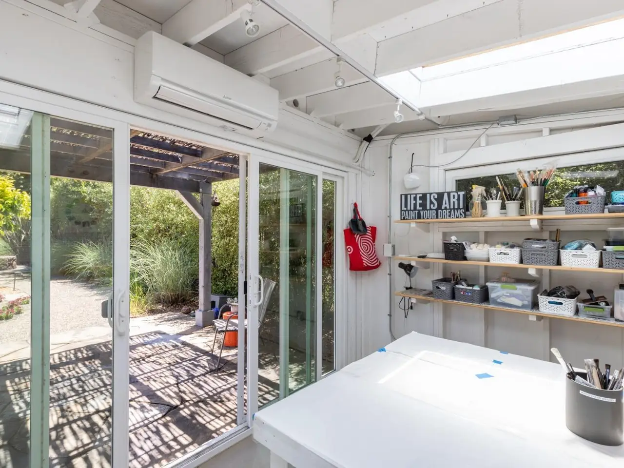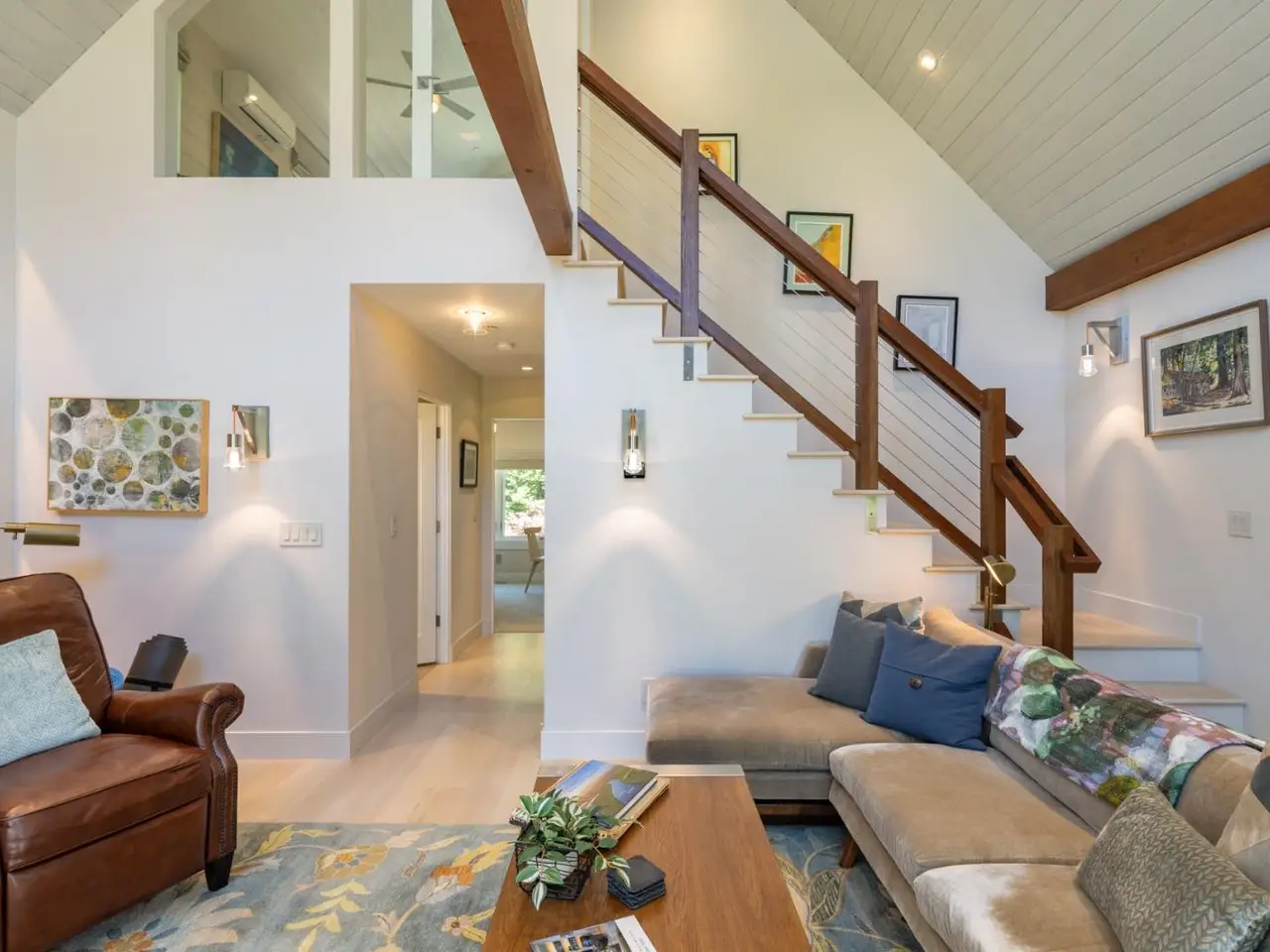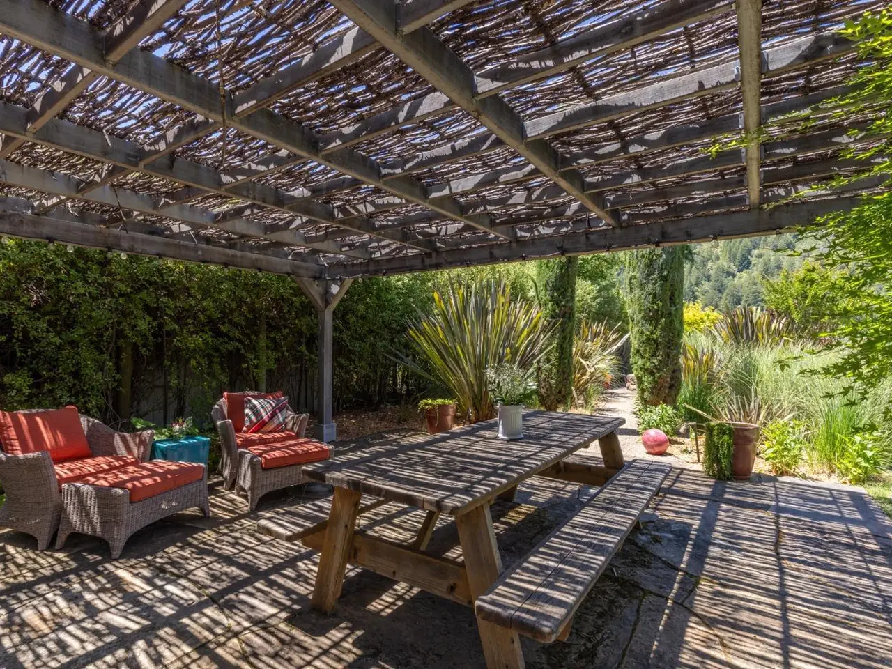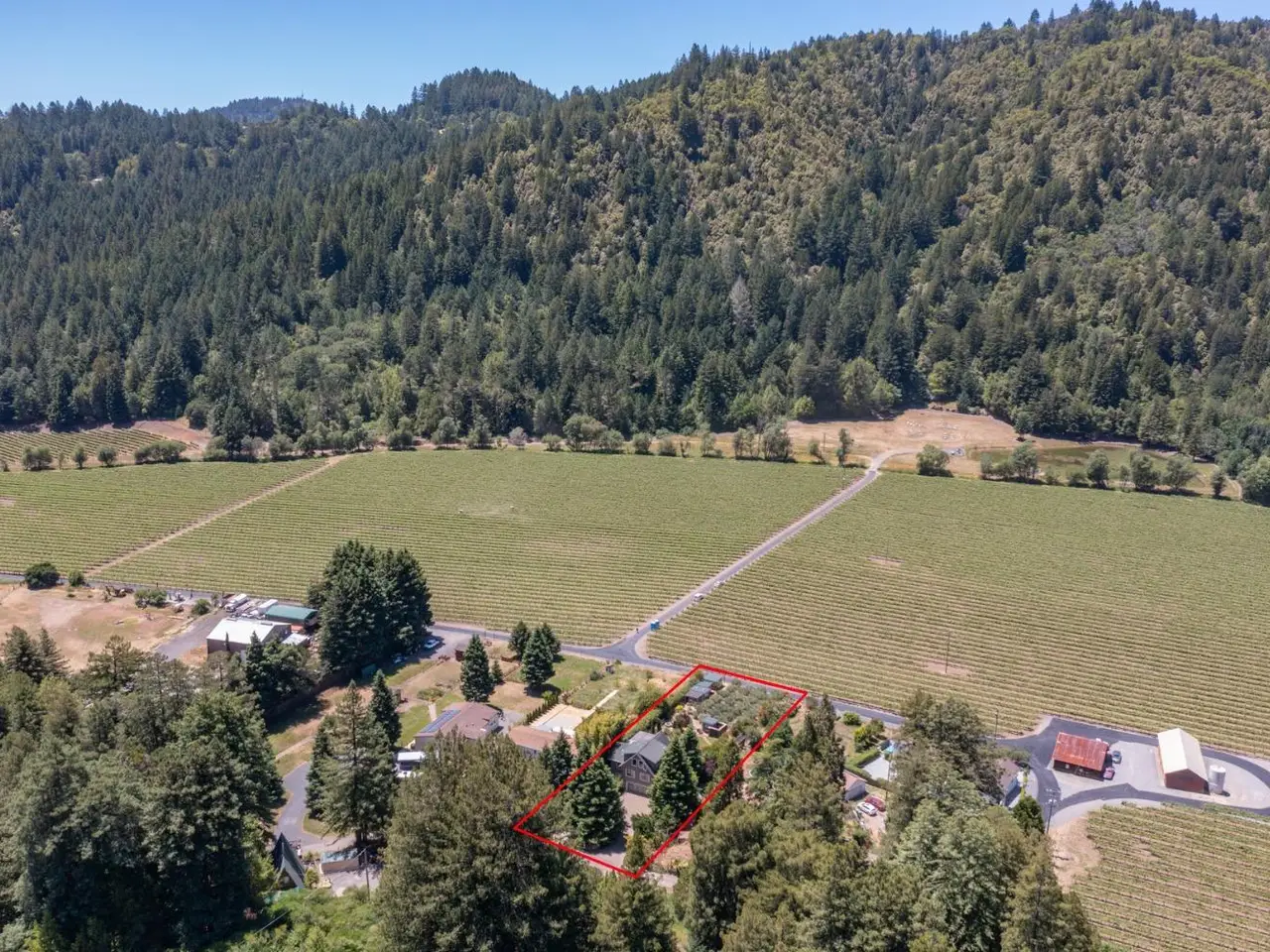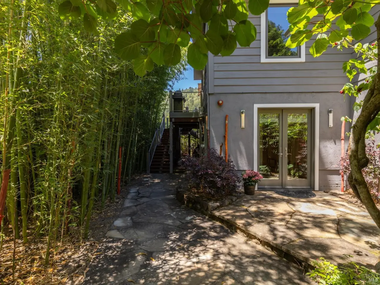 Escape to your own private oasis in this exquisite luxury property, where priceless views of the Korbel vineyard and the majestic mountains of the Russian River Valley set a breathtaking backdrop. Furnished with items meticulously curated by the acclaimed Zeitgeist Sonoma, every detail is expertly coordinated. Custom-built features and high-end finishes adorn every corner, making this home truly unique. The second-floor main level is ideal for entertaining friends or unwinding on the expansive covered deck while taking in the beauty that surrounds you. On the ground floor, a versatile fourth bedroom could be used as a game room or second living space, complete with a built-in Murphy bed and direct garden and spa access. Upstairs, the primary suite boasts a resort-like bath and walk-in closet. Outside, explore an expansive garden featuring artfully arranged garden beds, lush lawn, generous shaded patio, a firepit, craft studio, sauna with stone-walled shower, various fruit trees, and thriving olive orchard. From energy-efficient upgrades to advanced water filtration systems, no detail has been overlooked. Just a short walk from downtown Guerneville, yet nestled away from the hustle and bustle, this property offers a vacation-like setting you can cherish every day.