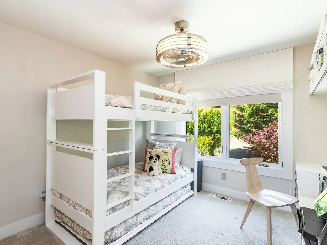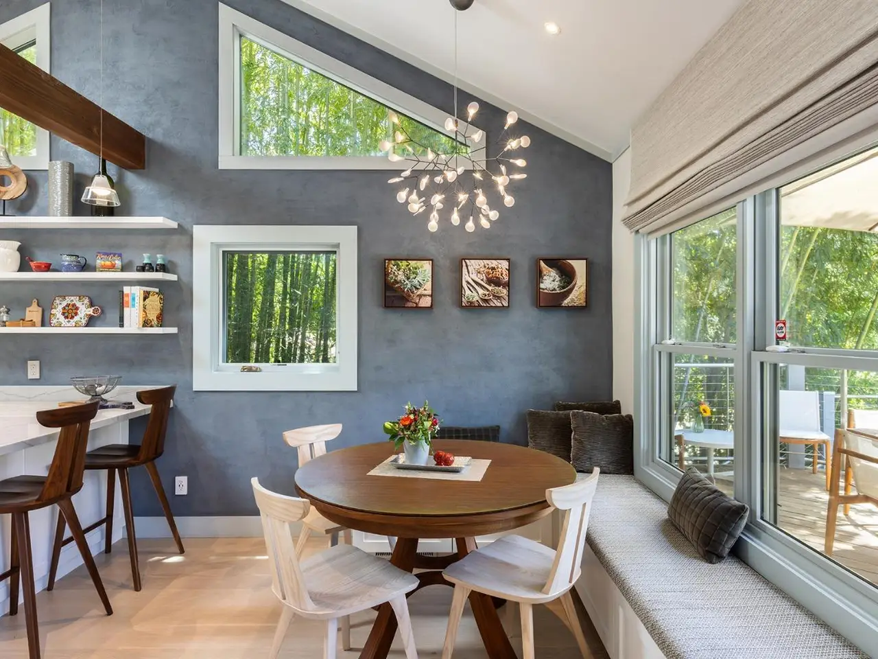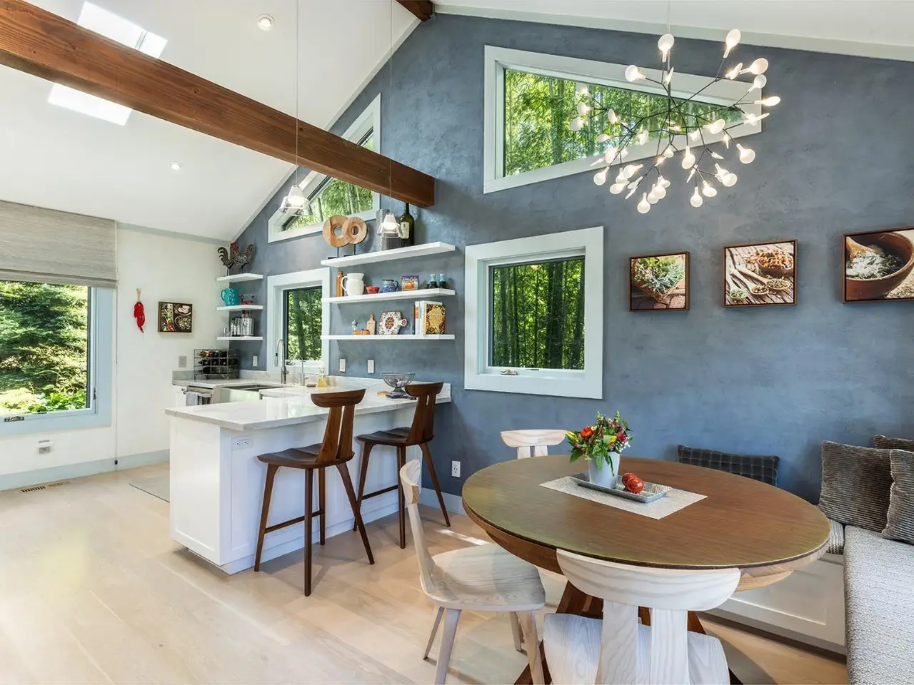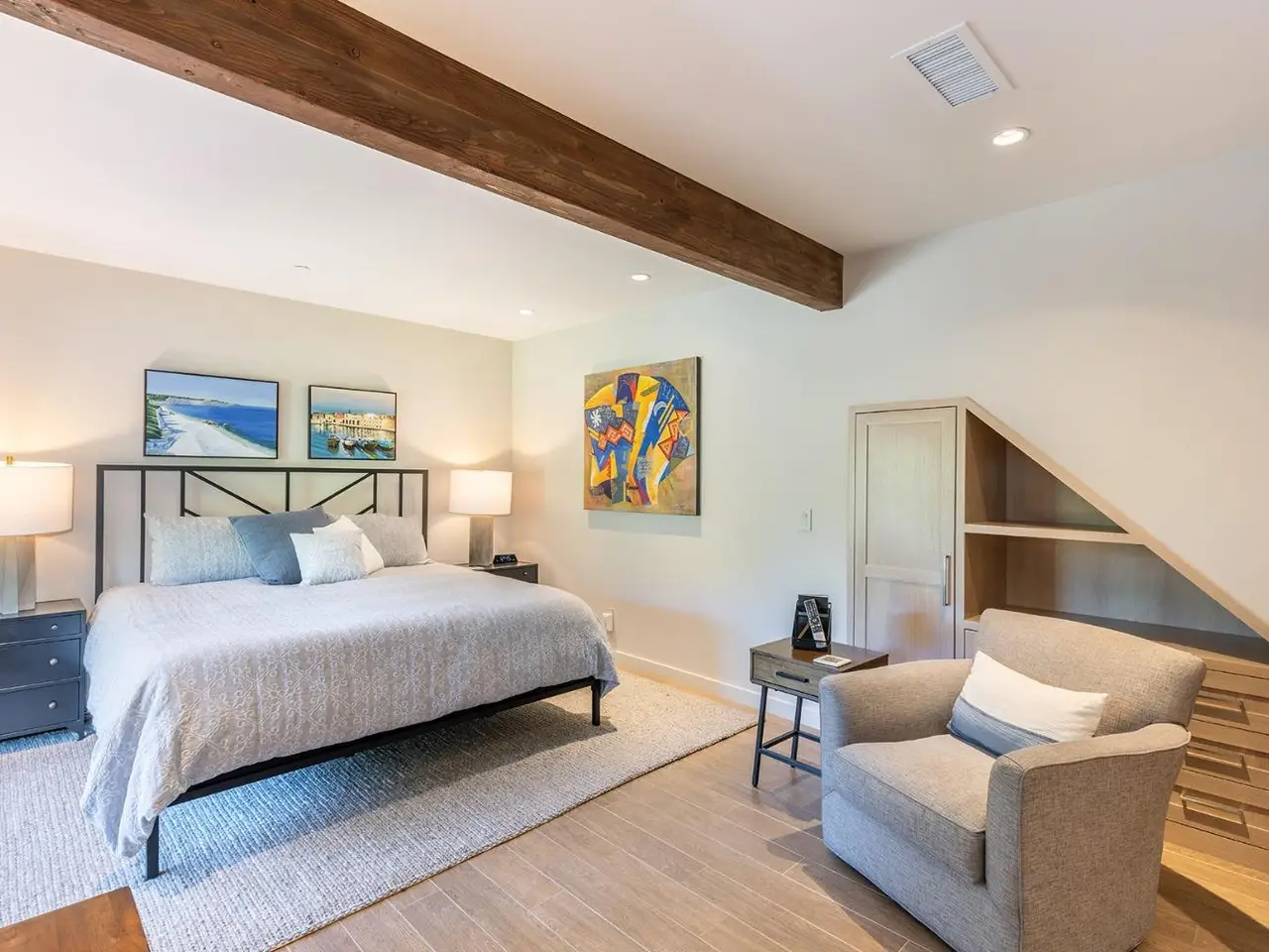Escape to your own private oasis in this exquisite luxury property, where priceless views of the Korbel vineyard and the majestic mountains of the Russian River Valley set a breathtaking backdrop. Furnished with items meticulously curated by the acclaimed Zeitgeist Sonoma, every detail is expertly coordinated. Custom-built features and high-end finishes adorn every corner, making this home truly unique. The second-floor main level is ideal for entertaining friends or unwinding on the expansive covered deck while taking in the beauty that surrounds you. On the ground floor, a versatile fourth bedroom could be used as a game room or second living space, complete with a built-in Murphy bed and direct garden and spa access. Upstairs, the primary suite boasts a resort-like bath and walk-in closet. Outside, explore an expansive garden featuring artfully arranged garden beds, lush lawn, generous shaded patio, a firepit, craft studio, sauna with stone-walled shower, various fruit trees, and thriving olive orchard. From energy-efficient upgrades to advanced water filtration systems, no detail has been overlooked. Just a short walk from downtown Guerneville, yet nestled away from the hustle and bustle, this property offers a vacation-like setting you can cherish every day.