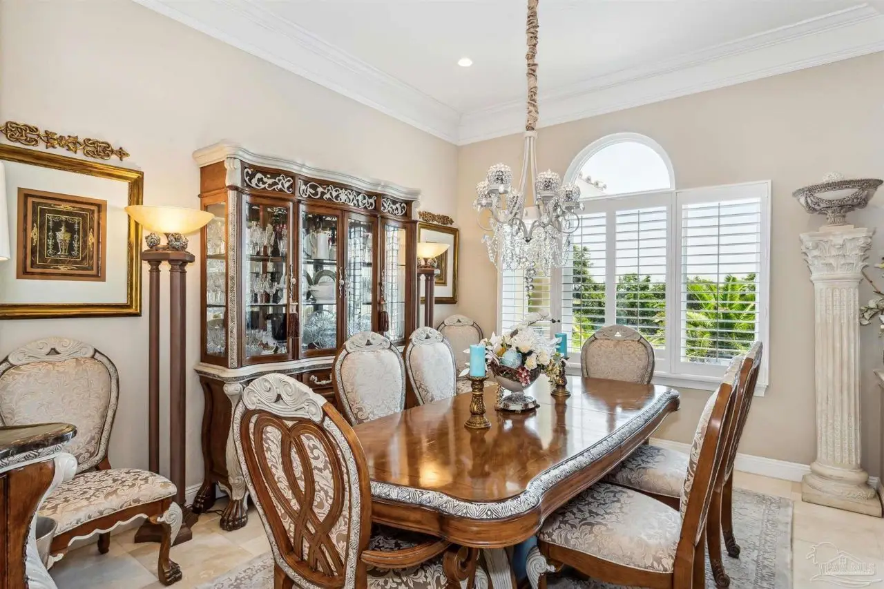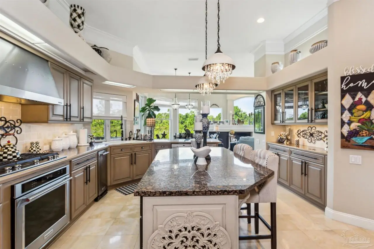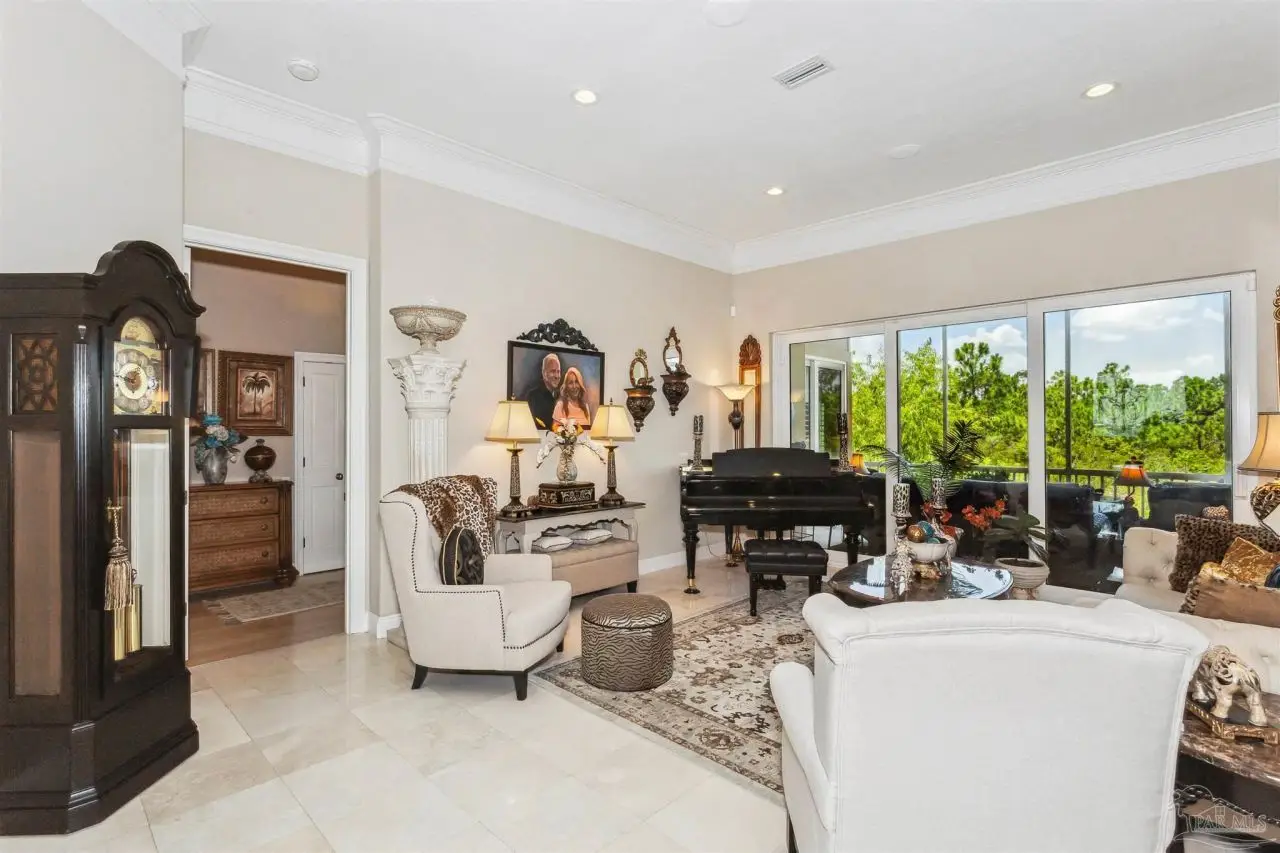 Escape to this peaceful serene atmosphere as you enter into this stunning home nestled along the 17 acres nature preserve of picturesque coastal forest and amazing views of Santa Rosa Sound and the Intercoastal Waterway. This property includes a piece of property across the street which makes for easy access down to the beach and waterfront. Many upgrades include water filtration system, a full-house generator, electric storm shutters, geo-thermal HVAC, surround sound speakers, security alarm, 2 dumb waiters, one located on the back of the home outside which serves as an elevator for people unable to use the stairs and one located inside off the garage that opens near the kitchen, great for transporting groceries! Luxurious and opulent with lavish features, such as travertine natural stone floors, decorative black iron railing encasing beautiful wood stairs, soaring ceilings, private screened balcony, gunite pool with spill-over hot tub, gourmet chef's dream kitchen featuring walk-in pantry, high-end stainless-steel appliances, gas-cooktop and top of the line refrigerator. Enjoy many rooms for entertaining and living including a large game room, office, theatre room, craft room, exercise/gym room, ensuite for guests and spacious owners ensuite with walk-in closets. The seamless transition from inside to outside makes perfect for entertaining guests off any of the well-appointed balconies or relaxing with friends and family around the sparkling pool w/ hot tub. This exceptional property located mere steps away from the Shoreline Park includes additional recreational opportunities such as paddle sports, trails for hiking, fishing, and a place to launch your own boat! Living here will not disappoint!