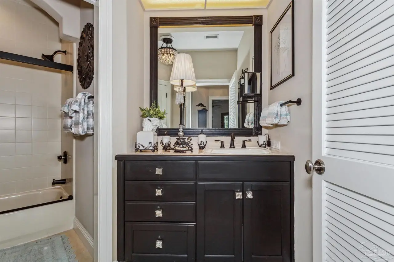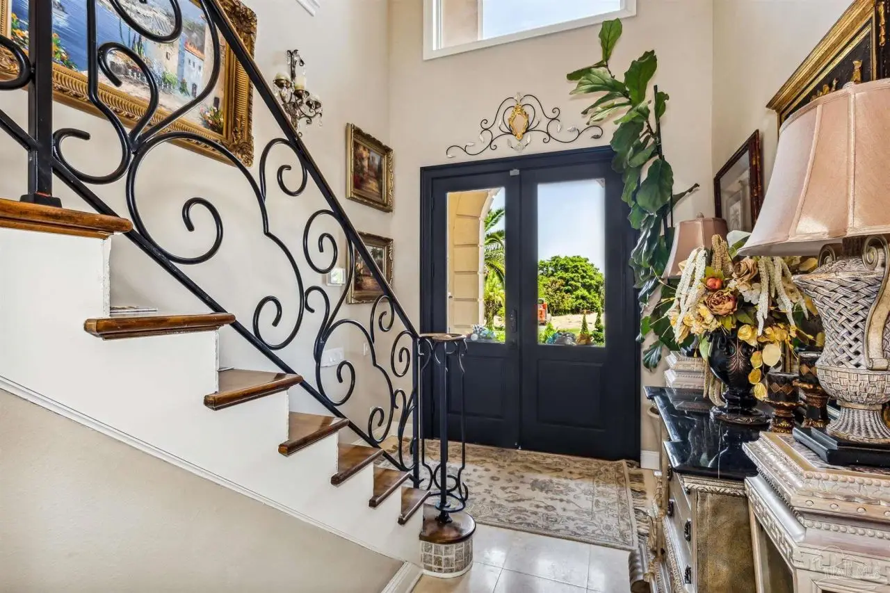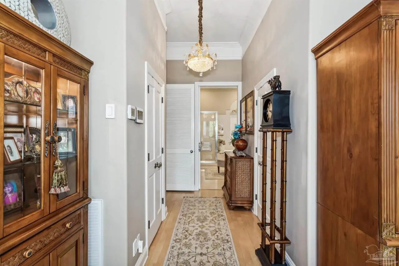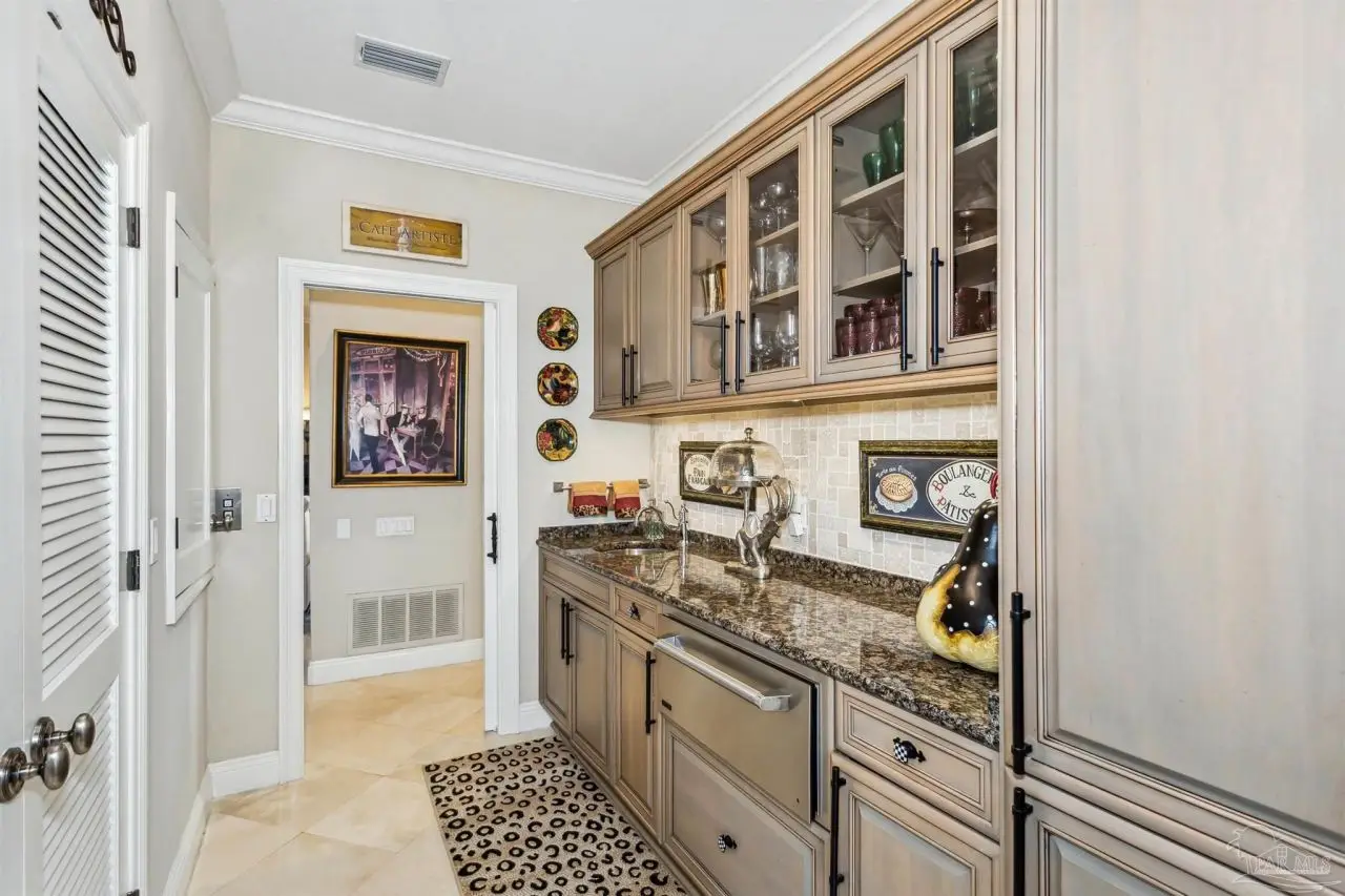 Escape to this peaceful serene atmosphere as you enter into this stunning home nestled along the 17 acres nature preserve of picturesque coastal forest and amazing views of Santa Rosa Sound and the Intercoastal Waterway. This property includes a piece of property across the street which makes for easy access down to the beach and waterfront. Many upgrades include water filtration system, a full-house generator, electric storm shutters, geo-thermal HVAC, surround sound speakers, security alarm, 2 dumb waiters, one located on the back of the home outside which serves as an elevator for people unable to use the stairs and one located inside off the garage that opens near the kitchen, great for transporting groceries! Luxurious and opulent with lavish features, such as travertine natural stone floors, decorative black iron railing encasing beautiful wood stairs, soaring ceilings, private screened balcony, gunite pool with spill-over hot tub, gourmet chef's dream kitchen featuring walk-in pantry, high-end stainless-steel appliances, gas-cooktop and top of the line refrigerator. Enjoy many rooms for entertaining and living including a large game room, office, theatre room, craft room, exercise/gym room, ensuite for guests and spacious owners ensuite with walk-in closets. The seamless transition from inside to outside makes perfect for entertaining guests off any of the well-appointed balconies or relaxing with friends and family around the sparkling pool w/ hot tub. This exceptional property located mere steps away from the Shoreline Park includes additional recreational opportunities such as paddle sports, trails for hiking, fishing, and a place to launch your own boat! Living here will not disappoint!