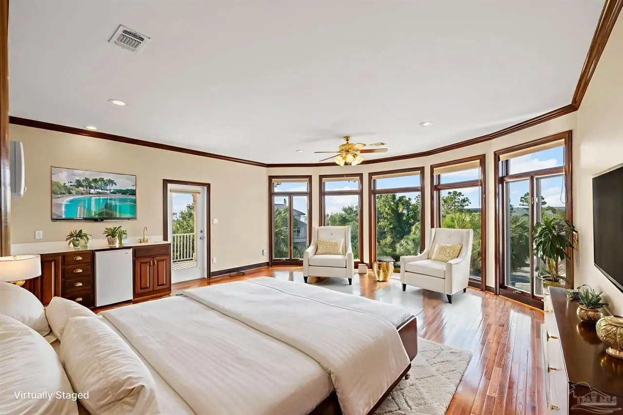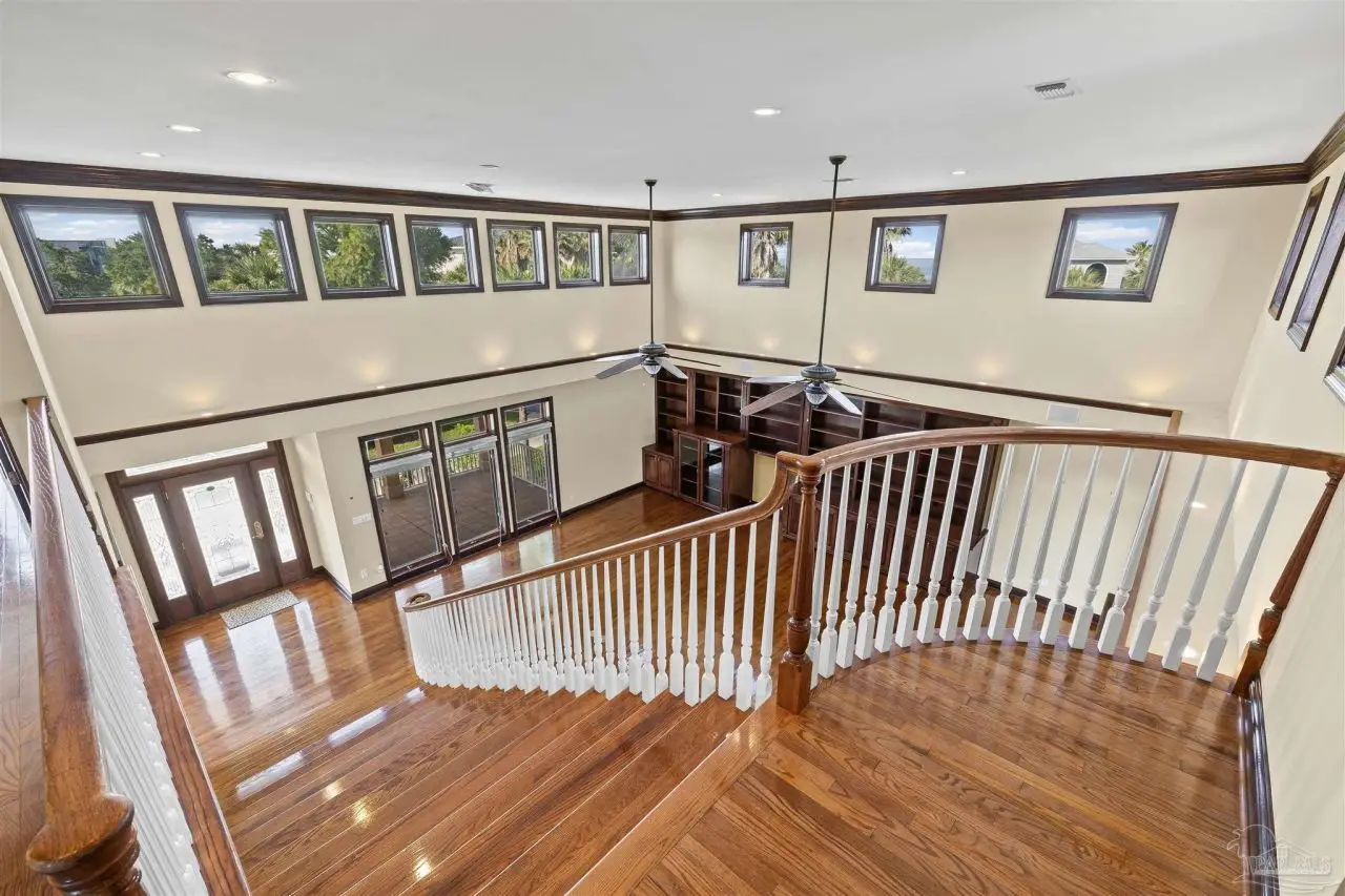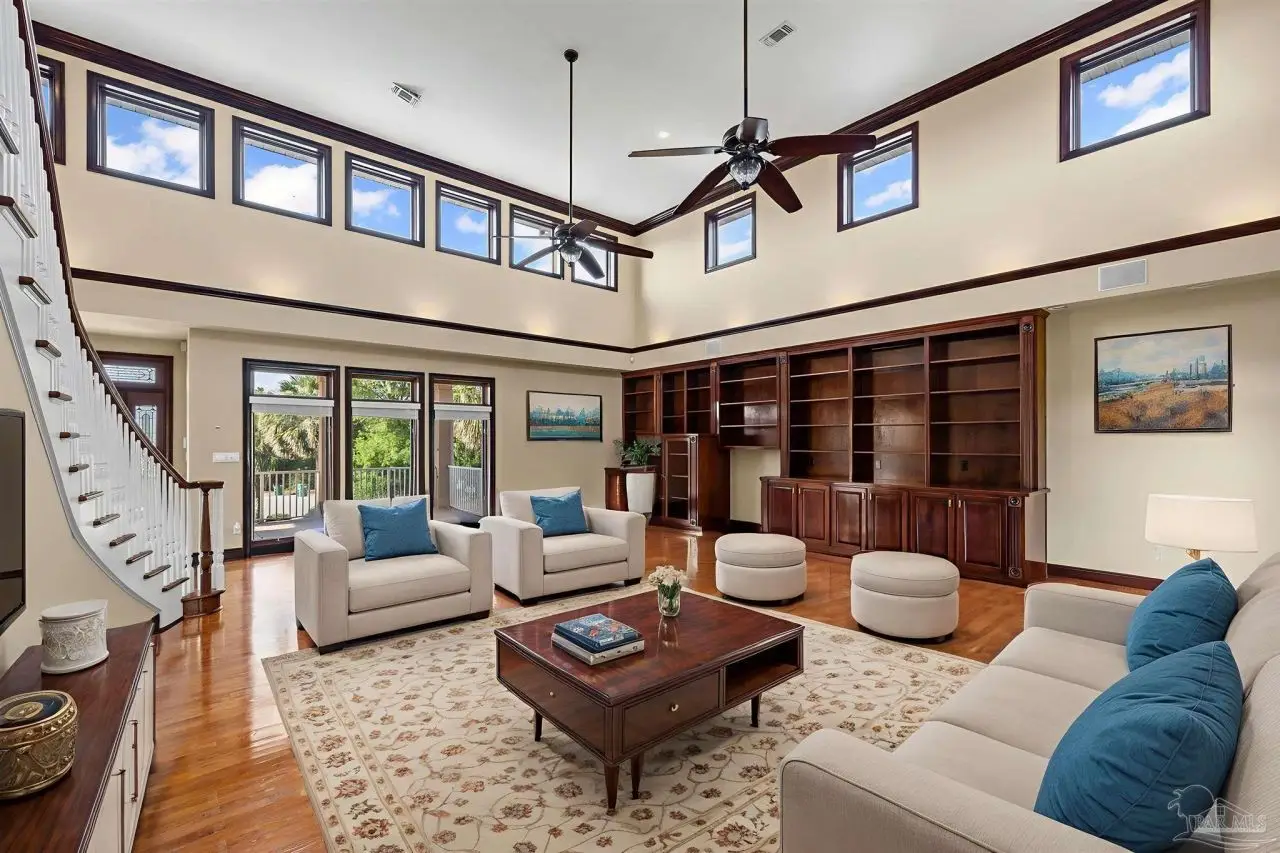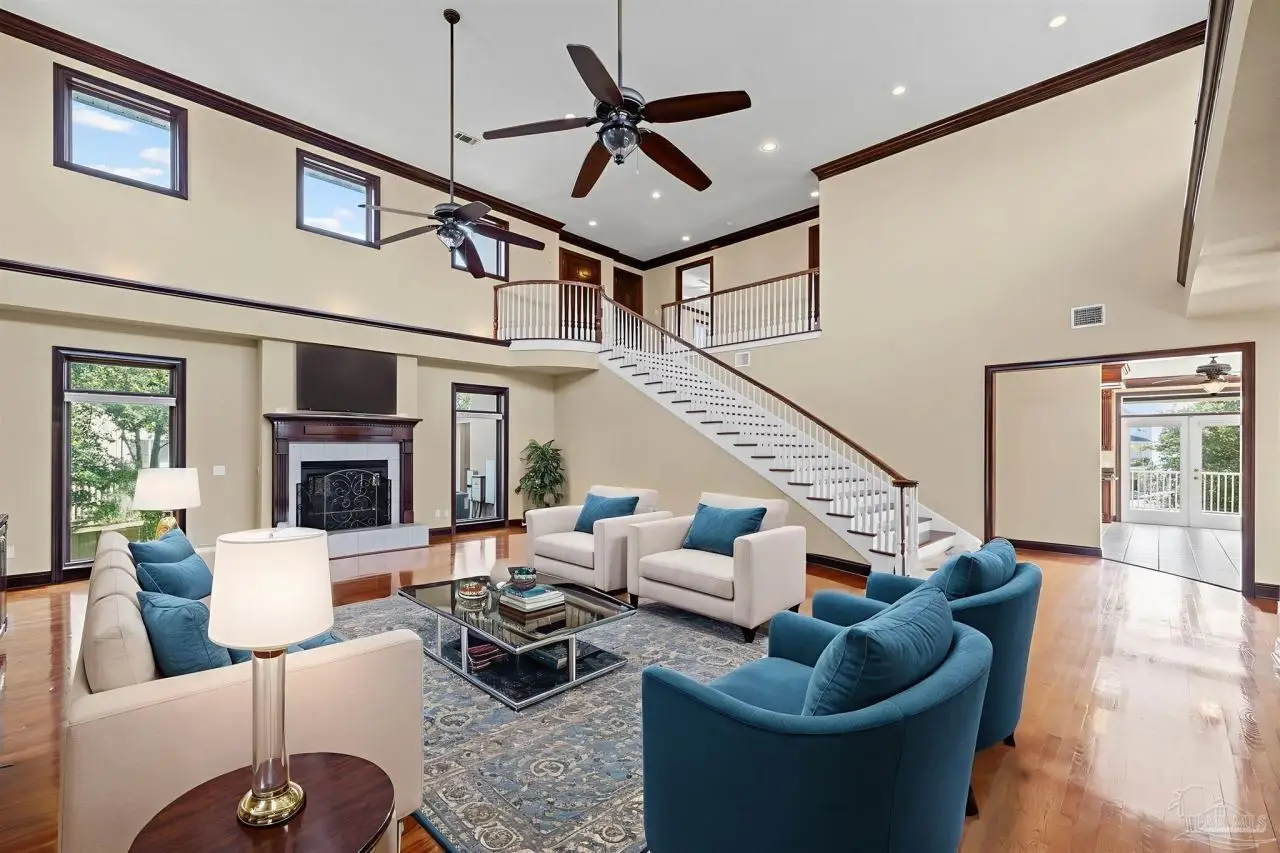 Experience the best of Gulf Breeze living in this stunning home located in the heart of Gulf Breeze Proper. Natural light pours through two levels of windows, illuminating the grand living room with its soaring ceilings, gas fireplace, and impressive grand staircase. The open-concept design creates a seamless flow into the expansive kitchen, an ideal space for family gatherings and entertaining. The kitchen boasts an abundance of cabinetry, stainless steel appliances, granite countertops, an island with breakfast bar, and a charming dining area framed by a large window offering serene water views. The first floor also features a spacious guest bedroom with a private bathroom, perfect for visitors. Upstairs, the luxurious primary suite offers a generous sitting area with a view of the water. The primary bath is outfitted with a walk-in closet, dual vanities, a jetted tub, and a separate shower. An additional upstairs bedroom, complete with an en-suite bath and water views, provides comfort and privacy. Additional highlights include an elevator, 2020 roof, security system, and a massive 4+ car garage with a workshop area. Situated just moments from Shoreline Waterfront Park, boat launch facilities, and a recreation center with a children's waterpark, and only a short drive to the pristine beaches of Pensacola, this home perfectly blends luxury, convenience, and coastal living.