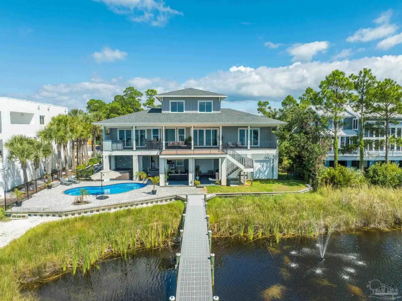 Welcome to this stunning waterfront pool home in the Deer Point subdivision of Gulf Breeze. Offering 90 feet of pristine waterfront with your own private beach, this property is a true coastal retreat.Watch the Blue Angels from your own backyard! Perfect for boating and water enthusiasts, the flow-through pier features a brand-new(2023) 12,000 lb boat lift and a jet ski lift, making it easy to enjoy life on the water. The 4 car garage offers plenty of room for storage.The home itself is designed for both comfort and style, with 4 bedrooms, 2 full bathrooms, and 2 half baths. Every room in the home offers breathtaking water views, creating a serene backdrop for daily living. An elevator provides convenient access to all levels, while the oversized 4-car garage and additional RV/boat parking with reinforced concrete ensure ample space for all your vehicles and toys.Step outside and take in the resort-style amenities. The saltwater pool, newly added in 2022, is perfect for cooling off on warm Florida days. Expansive outdoor living spaces include a spacious upper deck with panoramic views, and outdoor but in grill, as well as a beautifully designed downstairs living area complete with hot tub and outdoor televisions-ideal for entertaining or simply relaxing in your own private oasis.Inside, an open and airy floor plan maximizes natural light and water views. Whether you're gathering in the kitchen with its gas cooktop and double oven, and granite counters or relaxing in the living room with it's gas fireplace, or enjoying your morning coffee on the deck, this home was built to take full advantage of its spectacular location.With its combination of luxury, functionality, and endless outdoor recreation, this Gulf Breeze waterfront property offers the ultimate lifestyle on the water. All Gulf Breeze Schools! Bring your boat, your jet ski, and your sense of adventure-paradise awaits!