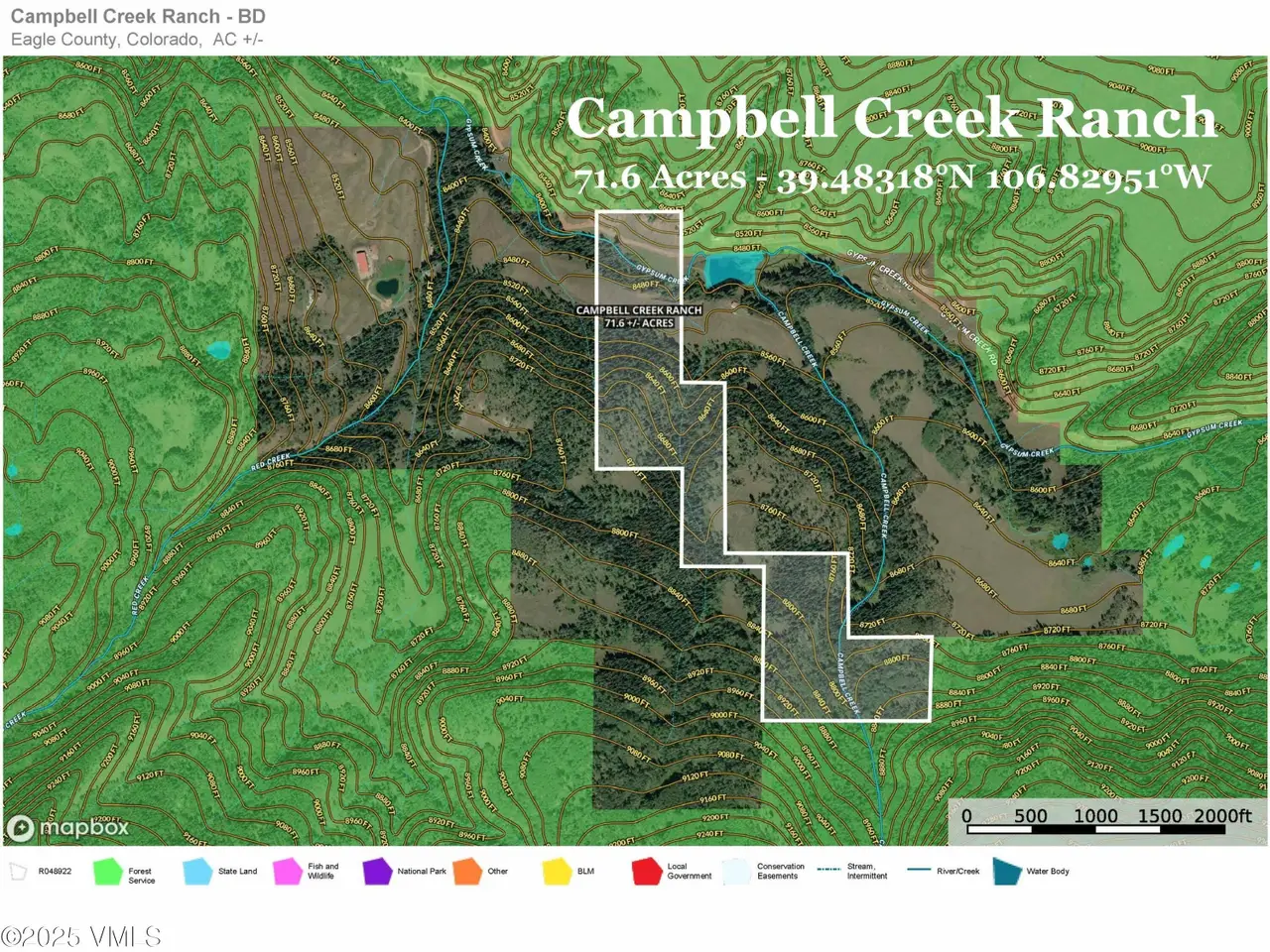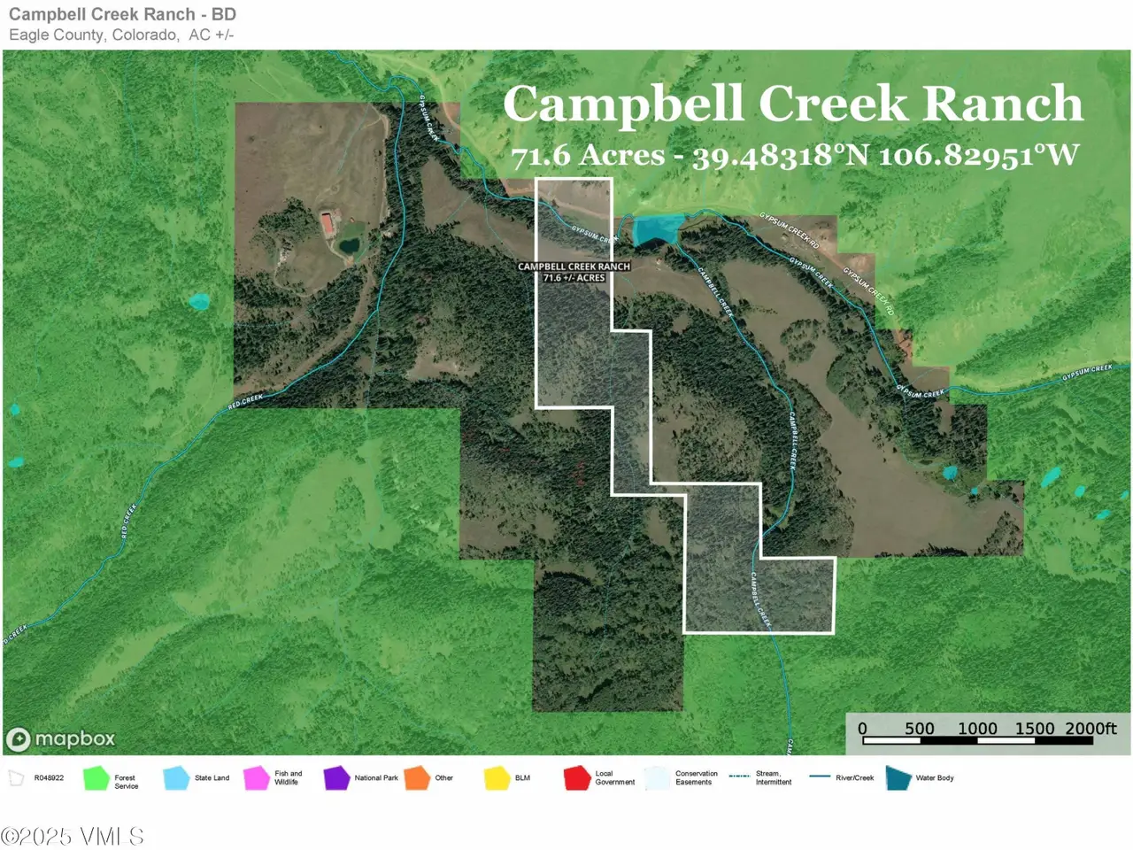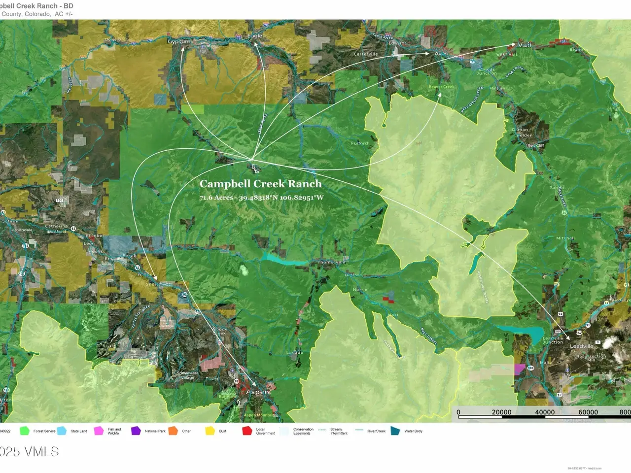 The Campbell Creek Ranch (CCR) is conveniently located between Colorado's Vail and Aspen ski resorts. The 72-acre property borders - and is virtually surrounded by - the White River National Forest. 'Live Water' flows through the CCR from Campbell Creek and Gypsum Creek. The elevation of the ranch ranges from 8,440' to 8,920' and supports a wide range of Colorado's diverse flora [riparian creeks, aspen groves, pine forests, sagebrush hills, open pastures] and fauna [deer, elk, moose, bear, coyote, fox]. The property is in Game Management Unit (GMU) 44 and offers direct access to thousands of acres of hunting and hundreds of miles of USFS off-road-vehicle-approved (ORV) roads leading to Sylvan Lake, Ruedi Reservoir, and beyond. Located 52 miles from Vail, 47 miles from Beaver Creek, 17 miles from the Vail Valley Jet Center, and 80.4 miles from Aspen, the Campbell Creek Ranch offers privacy, accessibility, and is the starting point of the ideal Colorado mountain getaway. The gentle topography also offers abundant options to build your 'cabin in the woods'. The Campbell Creek Ranch is adjacent to the 'available-for-sale' Red Creek Ranch [178 acres] and recently sold Red Creek Trail Ranch [65 acres]. Campbell Creek Ranch GPS Coordinates are 39.48318 degrees N 106.82954 degrees W. A custom interactive map of the ranch and surrounding area is available upon request.