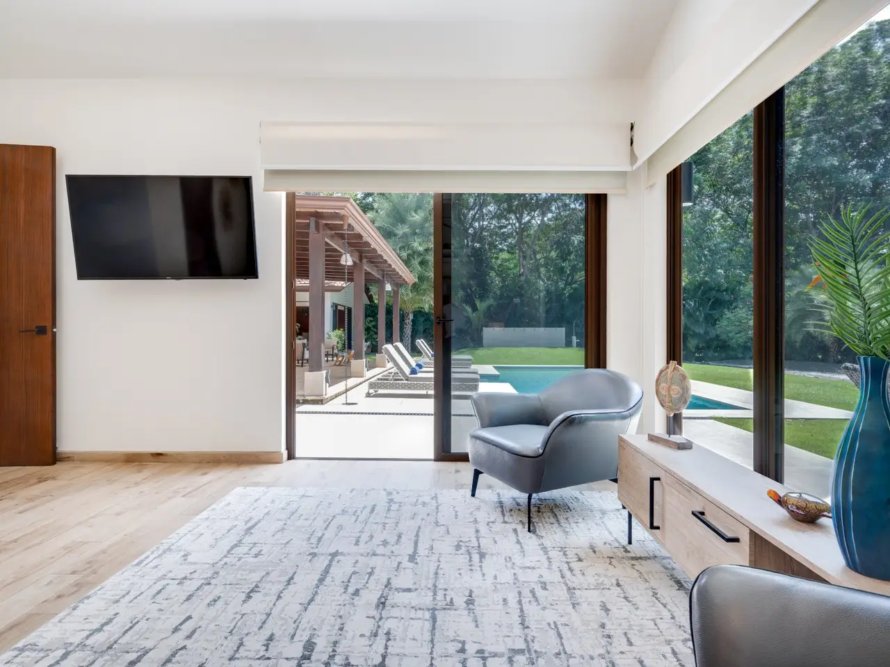 Casa Pachote – Luxury Living in Hacienda PinillaWelcome to Casa Pachote, an exquisite 4-bedroom, 4.5-bath luxury home in the prestigious Reserva de Golf community of Hacienda Pinilla. Recently refreshed with an $80,000 remodel, this residence blends contemporary sophistication with the inviting warmth of tropical living.Step inside and you’ll immediately feel the home’s open, airy ambiance. The living room radiates a welcoming, homey charm, framed by large patio doors that seamlessly connect indoor and outdoor spaces. Whether you’re relaxing with family or entertaining guests, the flow between the indoor living and outdoor dining areas creates an effortless sense of comfort and connection to nature.At the heart of the home is a chef’s kitchen, featuring elegant built-in appliances, a waterfall porcelain island, and matching counters and backsplash. A convenient pass-through window opens to the covered patio - perfect for serving meals al fresco or enjoying morning coffee by the pool.Designed in a distinctive “H” shape, the home’s layout balances privacy and harmony. Each wing hosts a master suite and guest bedroom, connected by a softly lit glass walkway that glows beautifully at night. This architectural touch highlights the home’s modern aesthetic.Every bedroom offers its own en-suite bathroom, ensuring privacy and comfort for family and guests alike. The two grand master suites are true sanctuaries: each with indoor sitting areas, King beds, and patio doors opening directly to the sparkling pool terrace. One master bedroom features an indoor and outdoor shower for a serene, spa-like experience.Step outside to your private tropical oasis. The expansive 11’ x 33’ pool with a tranquil waterfall and color-changing Pentair Glo lights becomes the centerpiece of the backyard as it is surrounded by lush landscaping, mature palms, and vibrant greenery that ensure total privacy. Thoughtfully placed landscape lighting creates a magical atmosphere after sunset, making the evenings just as beautiful as the days.The property is as practical as it is beautiful. Enjoy the convenience of an AstroTurf front lawn, in-ground sprinkler and drip irrigation systems, a whole-house water filtration and softening system, six-zone AC, and automatic blinds. The new outdoor deck space, new décor, and select furnishings complete the remodel, enhancing the home’s refined style.Additional highlights include:Spacious two-car garage with ample storageNew outdoor furniture and pool loungersExtensive exterior lighting on all sidesGolf cart charging outletFive TVs includedFully furnished and move-in ready, with all kitchenware includedFreshly painted exteriorAccess to all the amenities of Hacienda Pinilla including: golf, tennis, world-class surfing, beach club, miles of biking and hiking trails, restaurants, gym, etc Casa Pachote, Reserva de Golf 75 isn’t just a home—it’s a lifestyle. Offering a rare combination of luxury, comfort, and tranquility, it’s perfect as a full-time residence or high-end vacation retreat.? Experience the beauty of Hacienda Pinilla living, where every detail invites you to slow down, breathe, and feel at home.Contact us today to schedule your private showing.