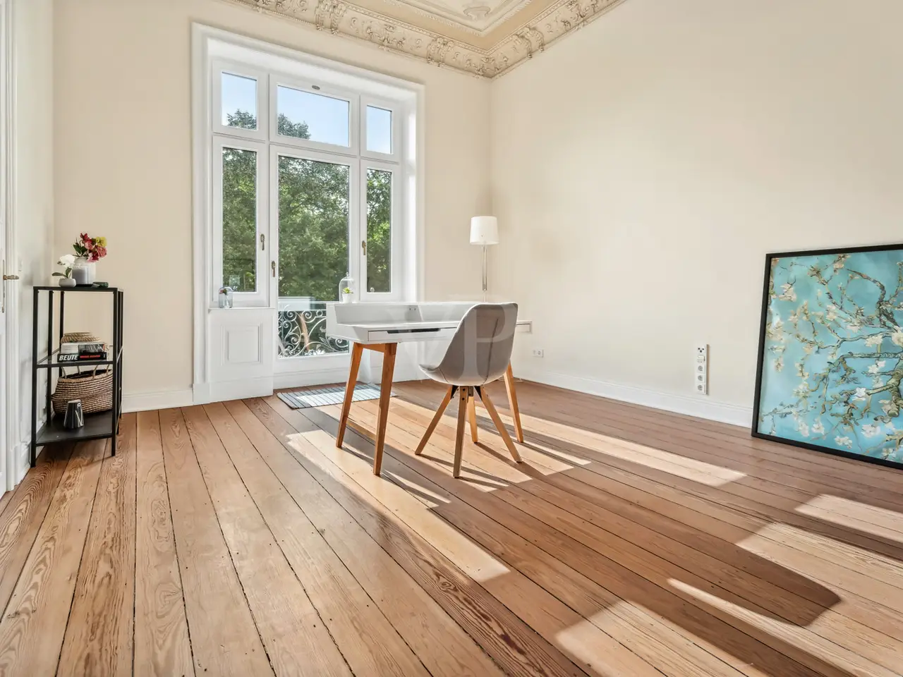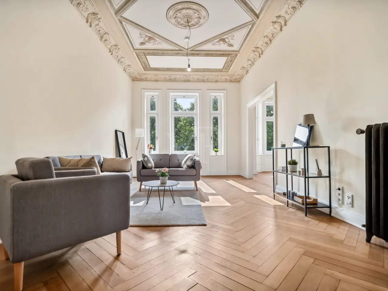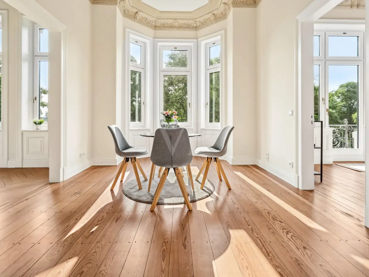- Old building completely renovated to a luxury level - Original Hamburg bones - Alster view and location in the first row - Classic high old building ceilings - Representative living / dining area with additional bay window and Alster view - Installation of a fireplace in the living room is possible - Study with balcony and Alster view - Master bedroom and master bathroom with access to the winter garden - Additional bedroom with access to the balcony - Original ceiling paintings - Original historical radiators - Original, elaborately refurbished doors - Original, elaborately refurbished wall panels with insulation - Extensive core renovation - High-quality parquet - Modern switch and button equipment - Full bath and guest bathroom with designer fittings - Elevator to the underground car park - Underground parking space for €80,000 must be purchased - District heating - Historical facade from 1889 - Refurbishment of historical elements in common ownership